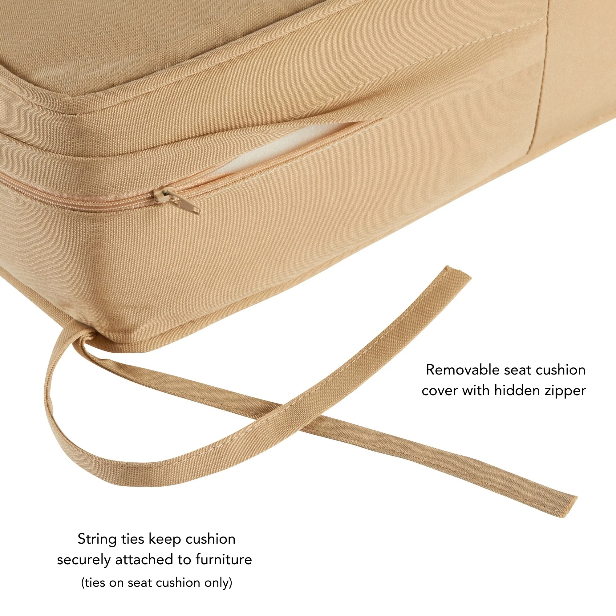 - Loose back cushion with sewn closure and zippered seat cushion with string ties