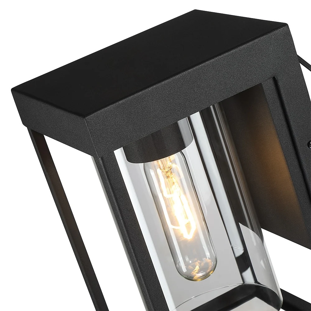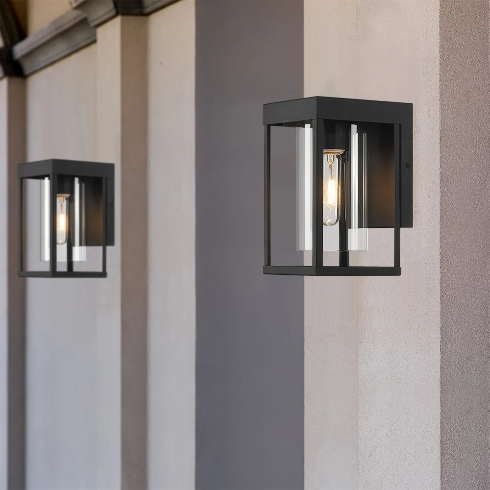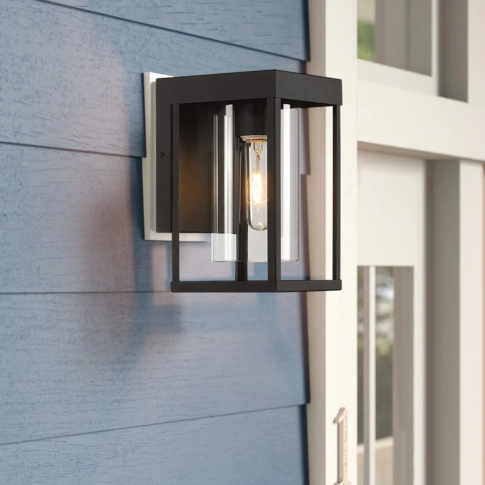 This modern Exterior lantern lighting fixture features a stunning clear glass cylinder as a dramatic focal point, with its boxy silhouette linear shape enclosed in a sleek Powder-Coated Black frame. Pairing the modern minimalist design with a vintage bulb is recommended to fully illuminate the glass and complement the overall aesthetic. Ideal for Front Porch, Patio, Garage, Deck, Balcony, Vanity etc.