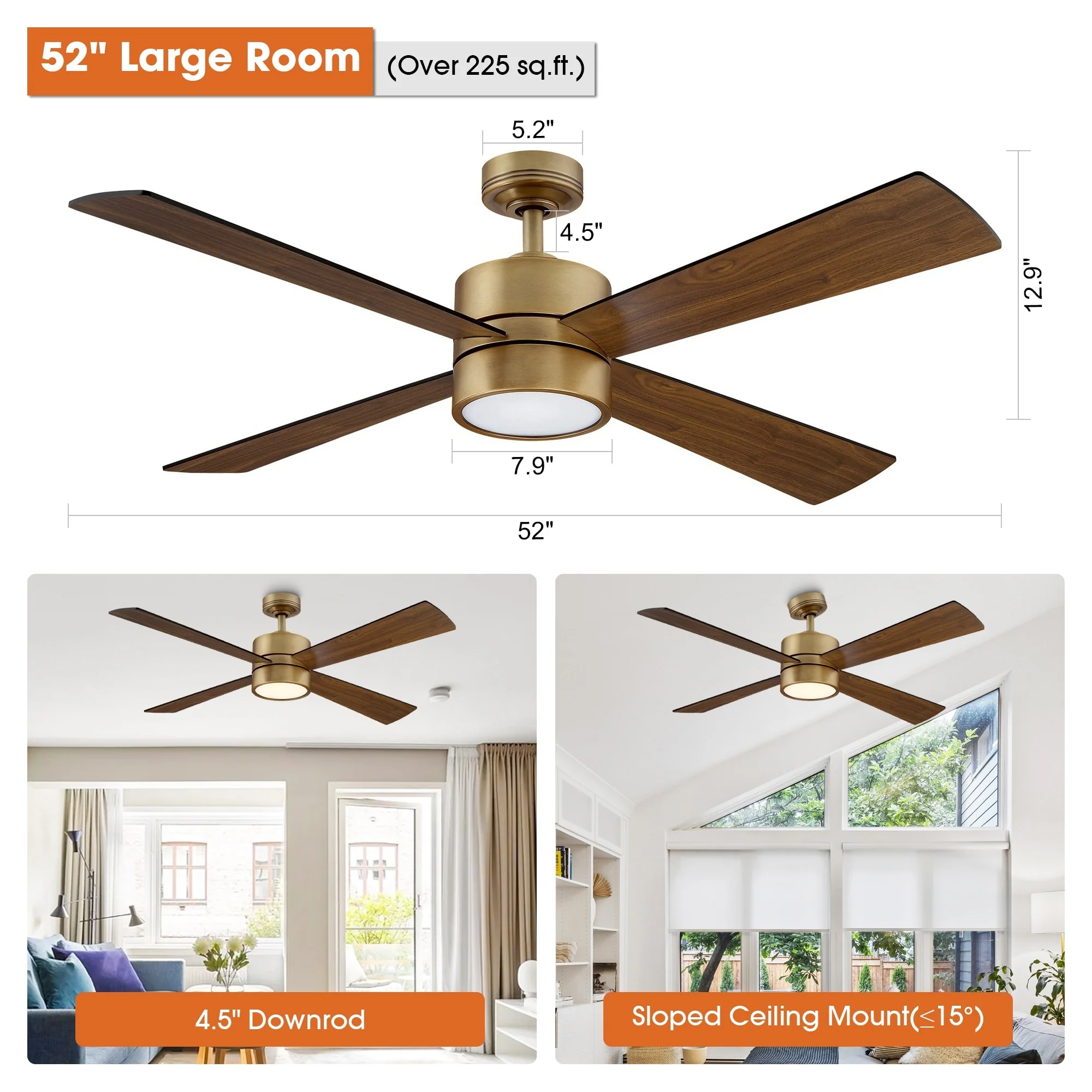 Bring sleek style and refreshing comfort to your space with our 52-Inch Antique Brass Ceiling Fan. Featuring a rounded cylinder body and four walnut-finished plywood blades, this mid-century modern fan adds a subtle yet sophisticated touch to your ceiling. The brushed brass finish and integrated 18W LED light make it a perfect blend of design and functionality. Ideal for living rooms, bedrooms, and indoor patio spaces up to 400 sq. ft., this ceiling fan includes a convenient remote control with timer functionality and 6-speed settings, so you can adjust the breeze with ease.