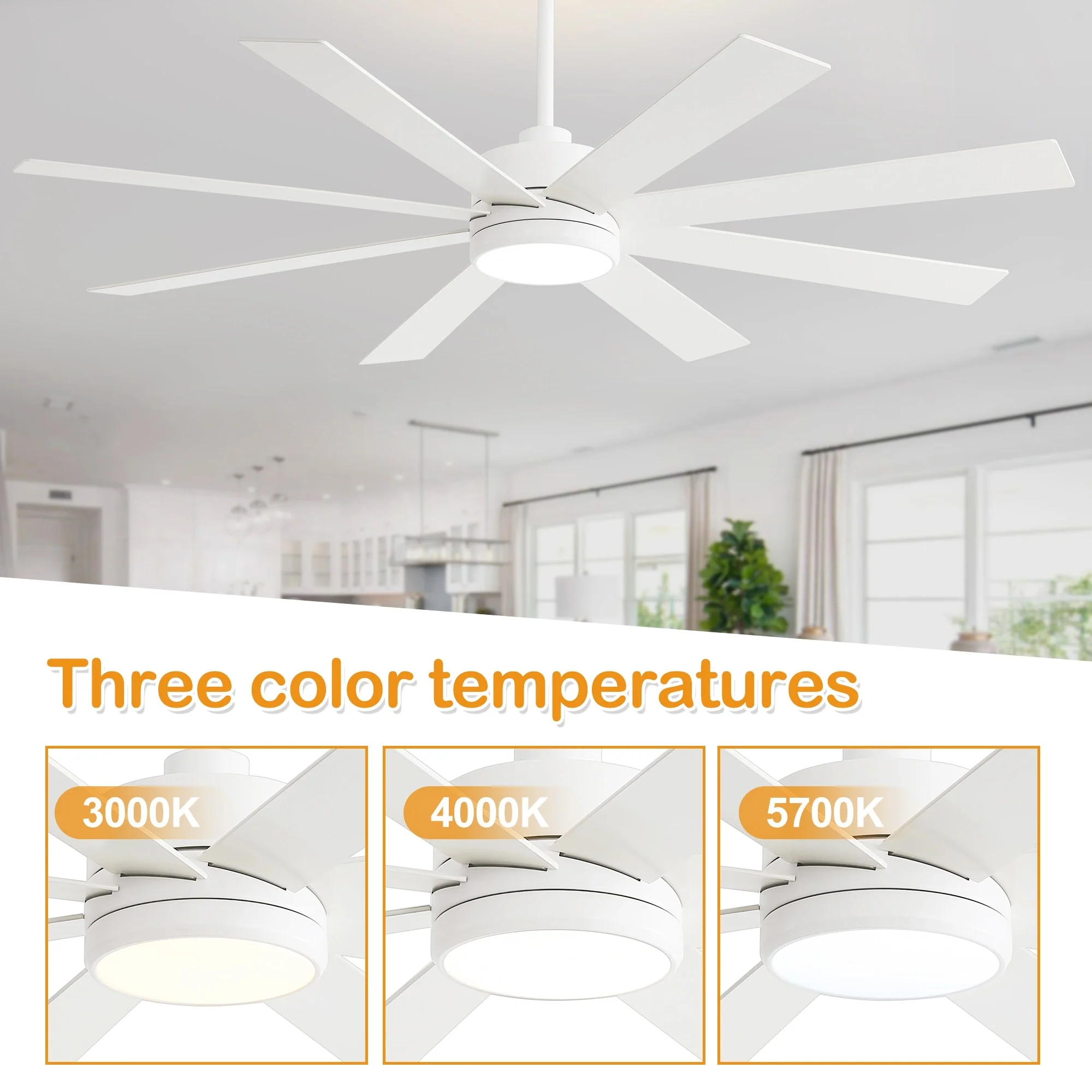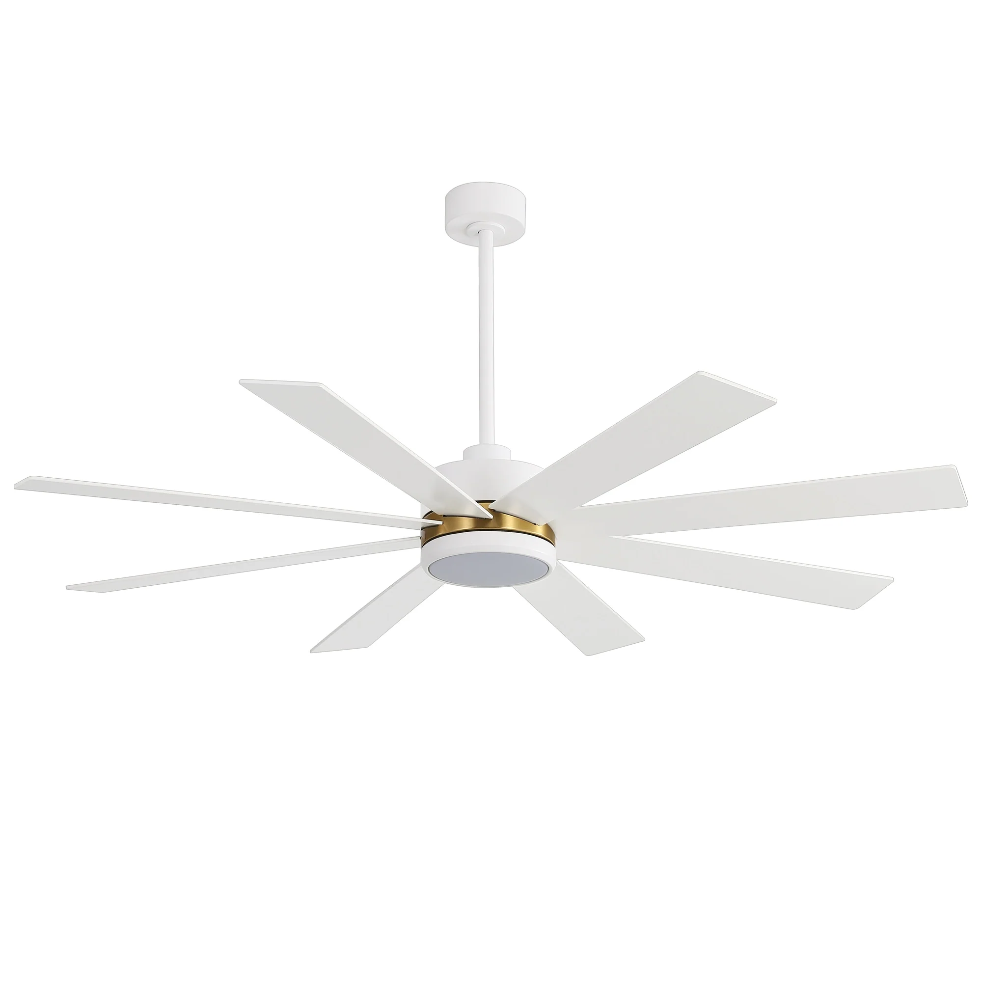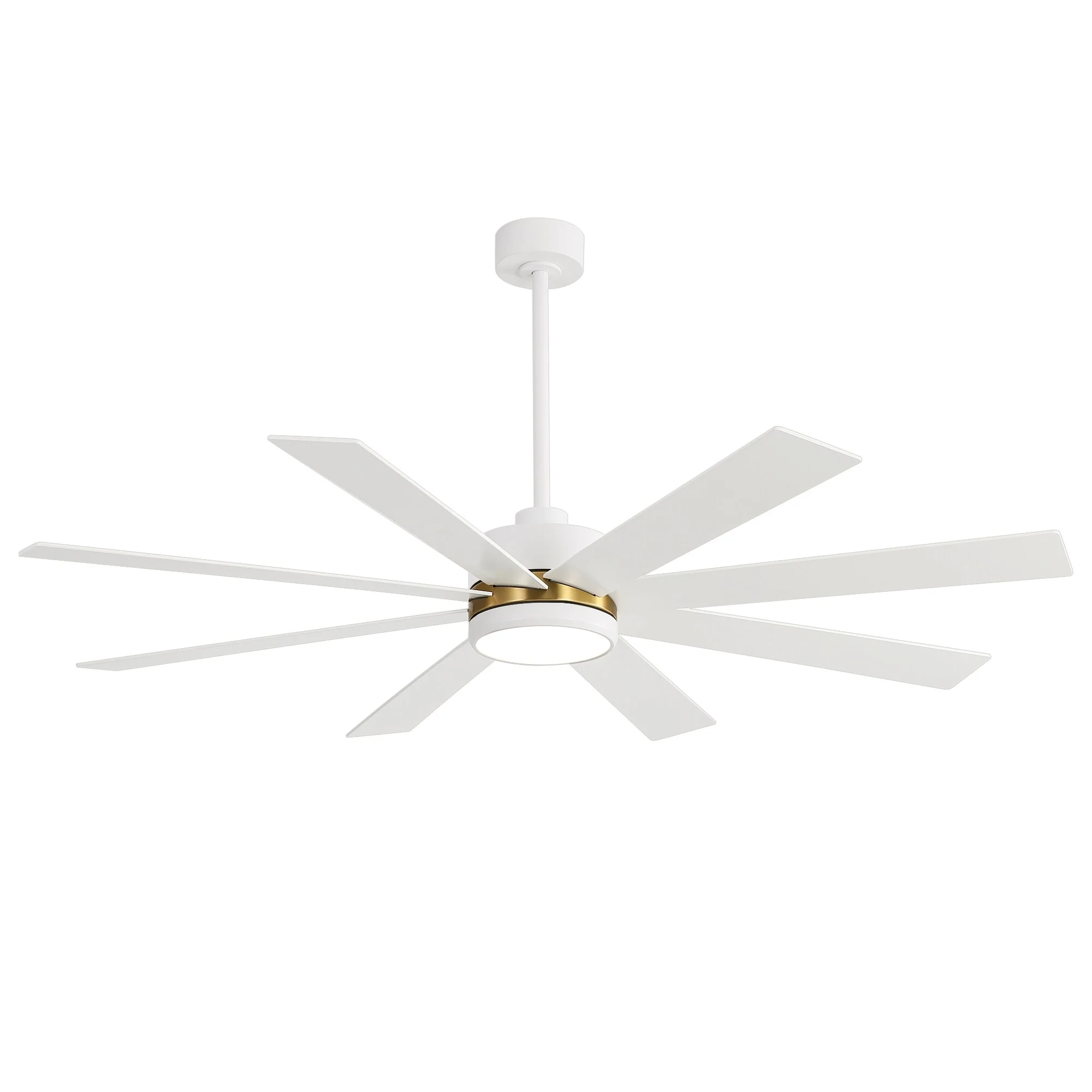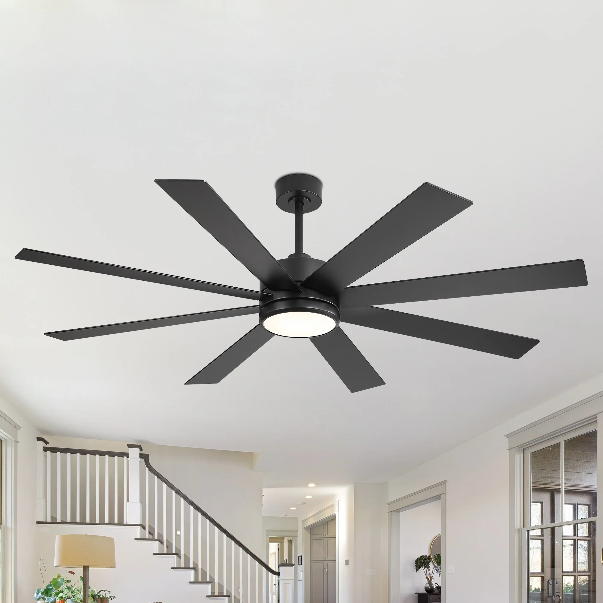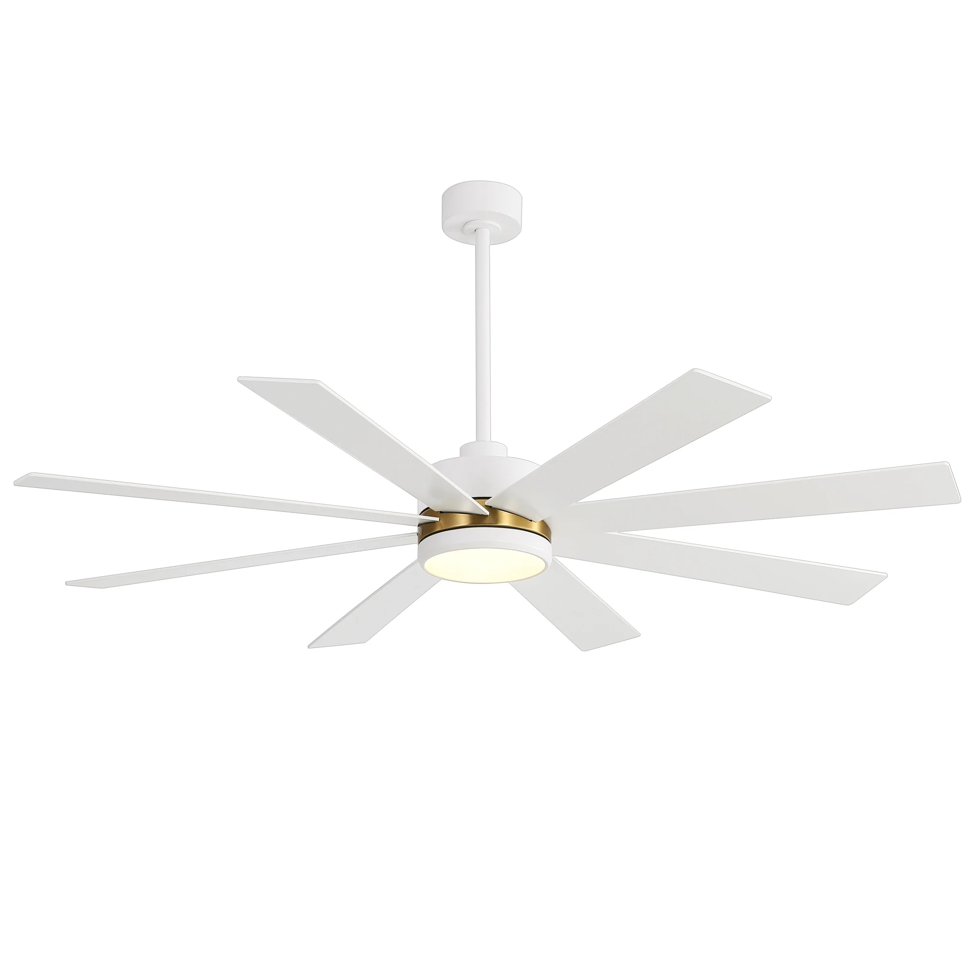 A modern design that performs well in indoor environments, generates a substantial amount of airflow. It is a very big fan with 8 blades and 65 in. blade span. This dry rated and ceiling fan housing is constructed with the durable Plywood blade and metal material. 8 handsome blades are available in white finish featuring reversible and removable. It features a powerful DC motor that runs smoothly and quietly while operating 70% more efficiently than AC motors. The convenient, 6-speed set-up can be controlled locally using the included remote control.
