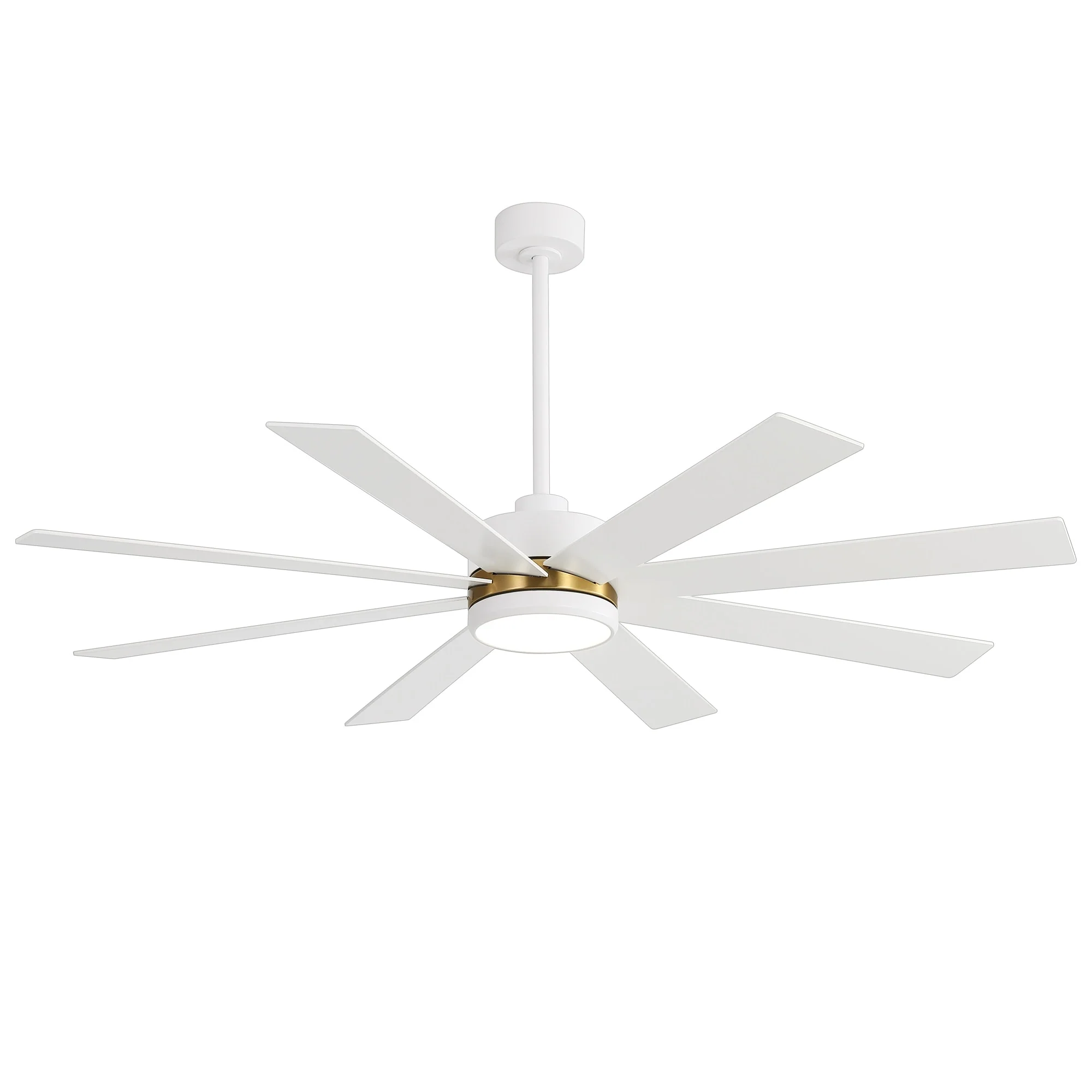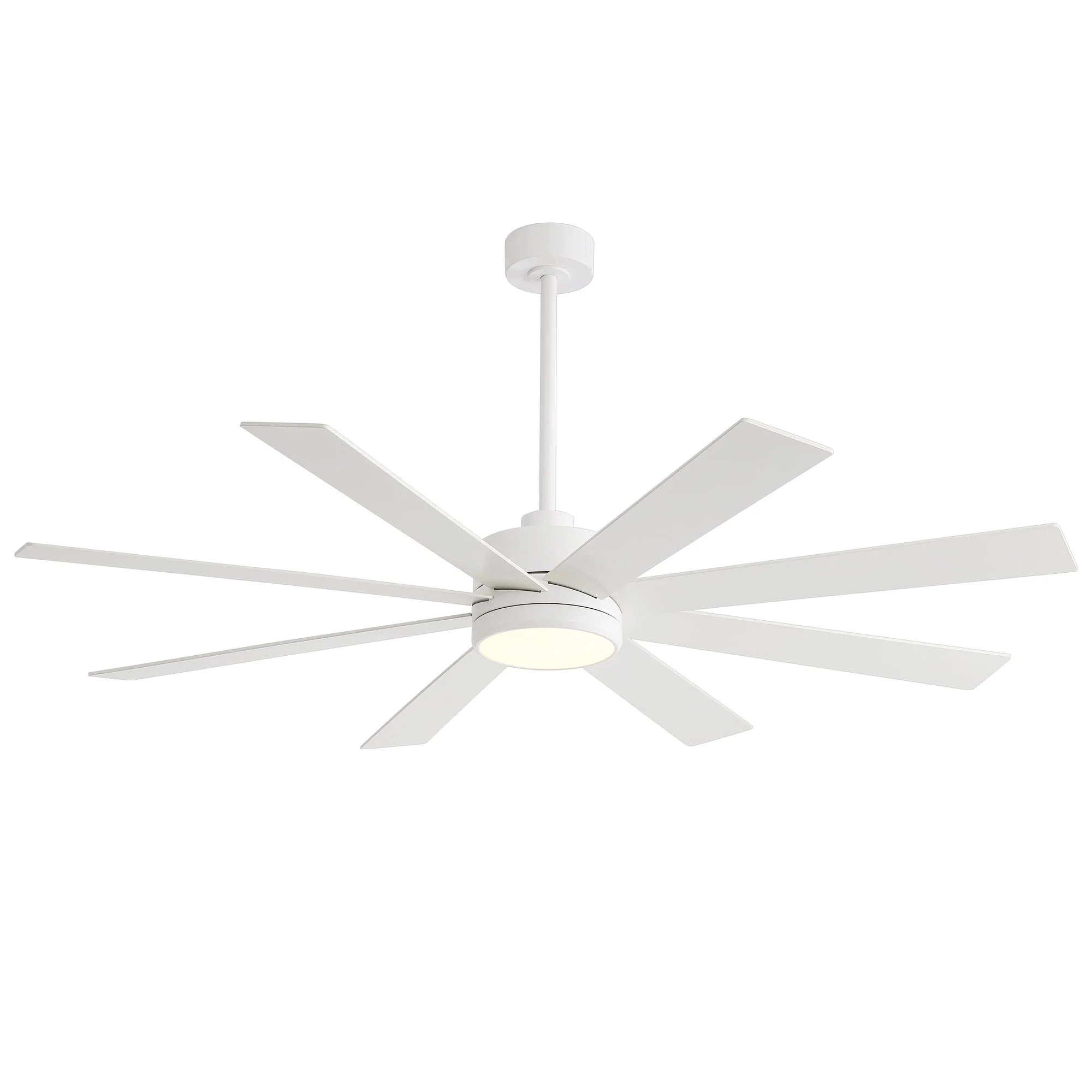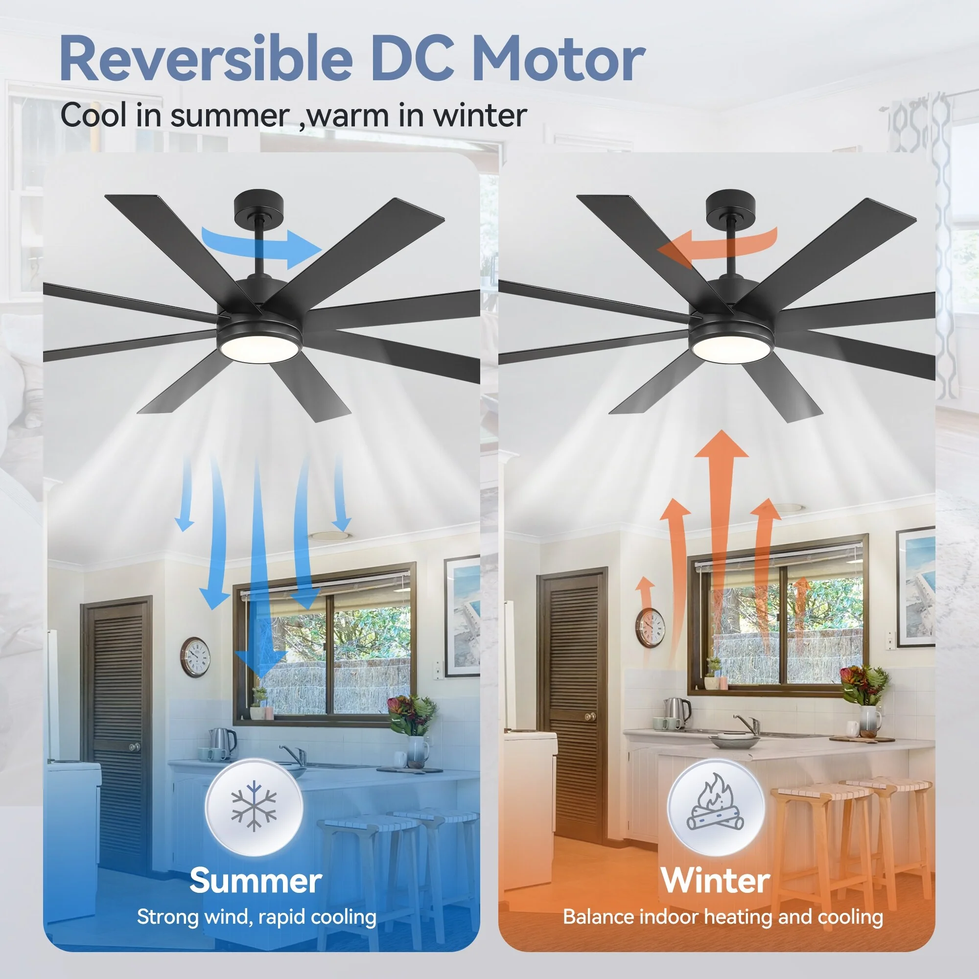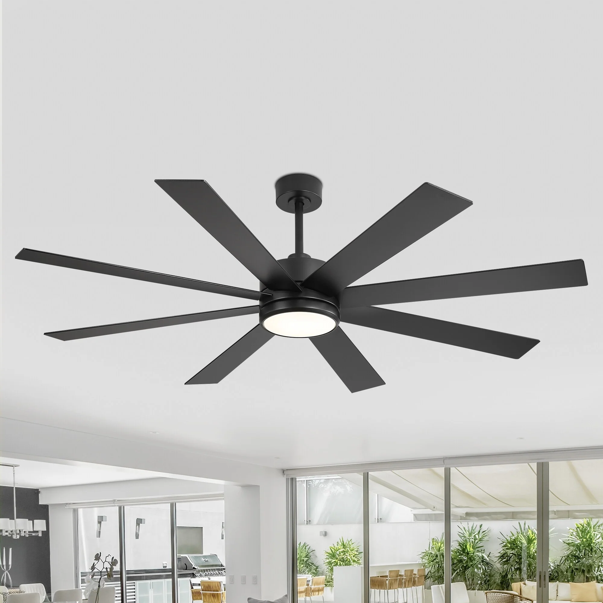 A modern design that performs well in indoor environments, generates a substantial amount of airflow. It is a very big fan with 8 blades and 65 in. blade span. This dry rated and ceiling fan housing is constructed with the durable Plywood blade and metal material. 8 handsome blades are available in white finish featuring reversible and removable. It features a powerful DC motor that runs smoothly and quietly while operating 70% more efficiently than AC motors. The convenient, 6-speed set-up can be controlled locally using the included remote control.