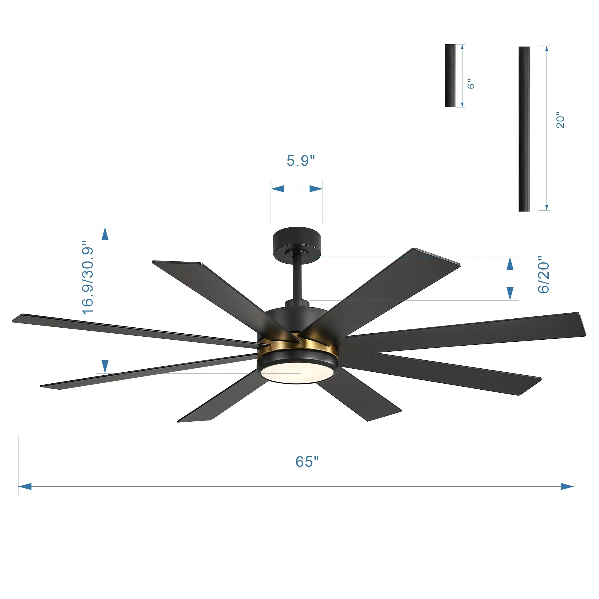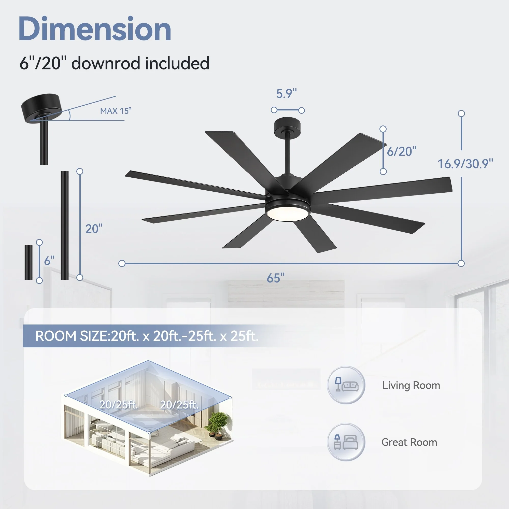 Including:1* ceiling fan,1* remote,1 *manual, 2* downrod (6' downrod and 20' downrod)