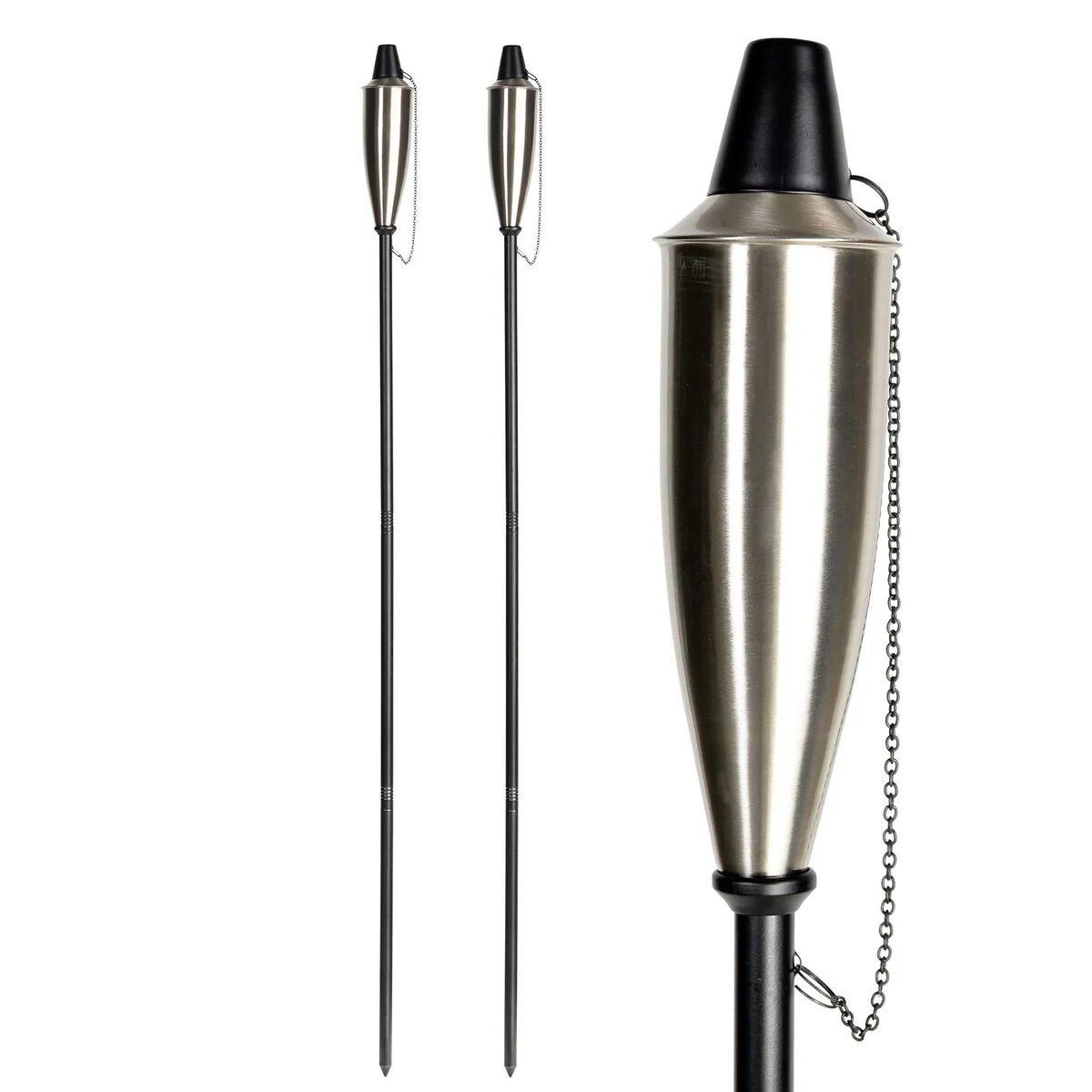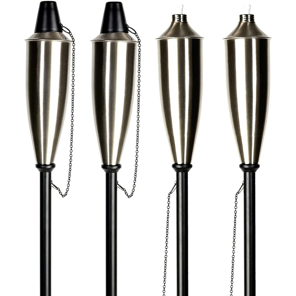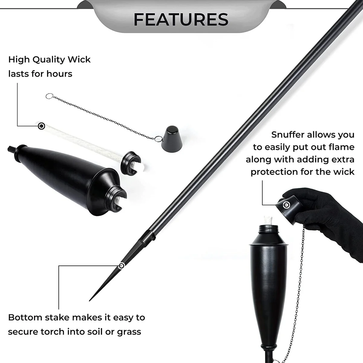 - Longer Working Time & Durable: Pack of 4 Torches (with required accessories including 4 Torch, 4 long-lasting fibreglass wick, 4-piece pole, 4 metal snuffer caps). Comes with a high-quality metal spike at the bottom for easy grounding. Each fill provides more than 6 hours of ambience.