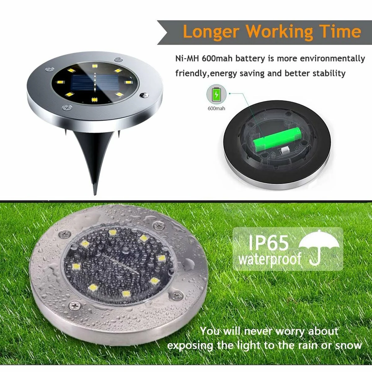 Equipped with a wider polycrystalline solar panel and 8 durable LED, our solar ground lights are higher efficient than other ordinary outdoor solar lights. The 600 mAh Ni-MH battery power reserve our ground lights use is 30% more than other Ni-Cd batteries, the service life is longer, and there is no pollution to the environment.