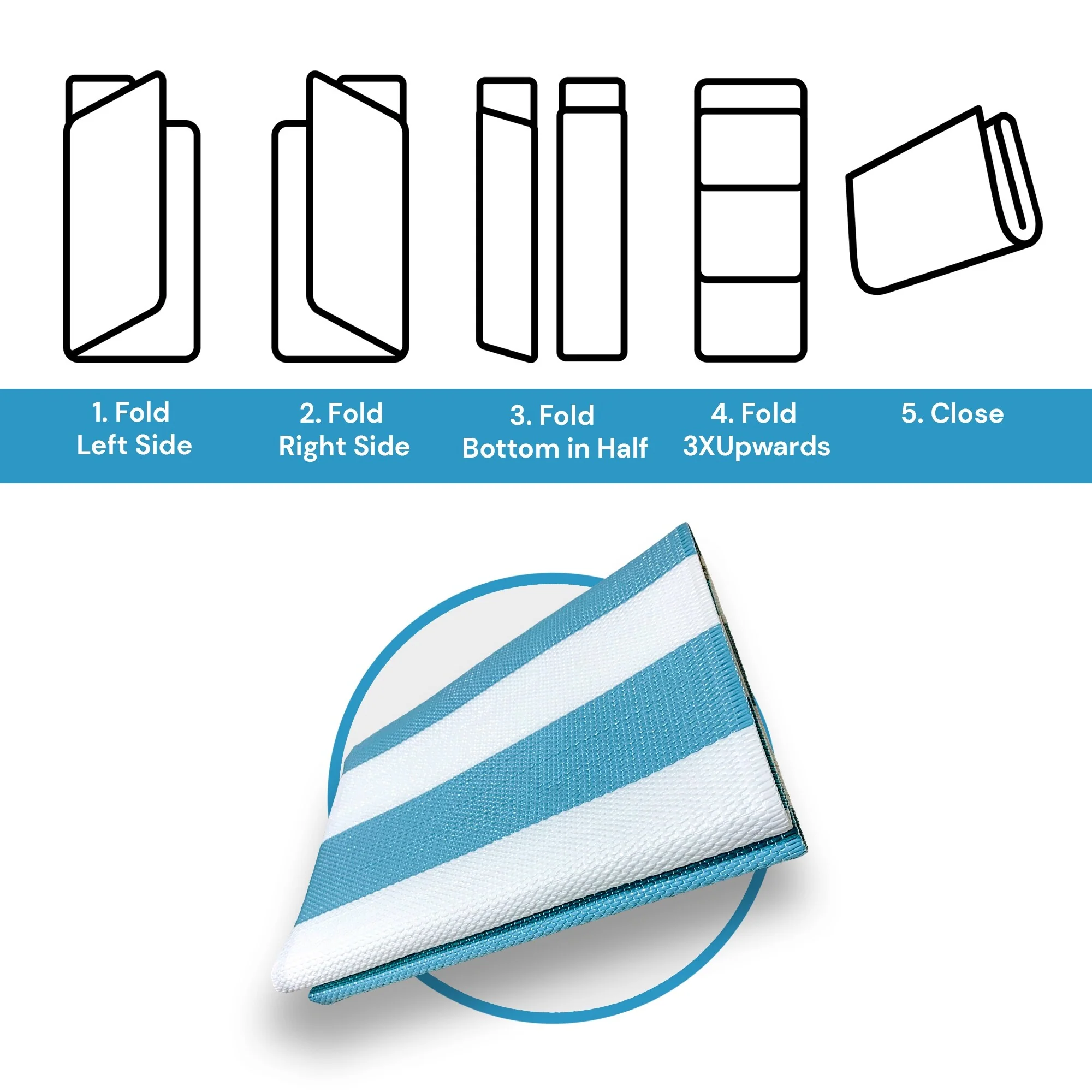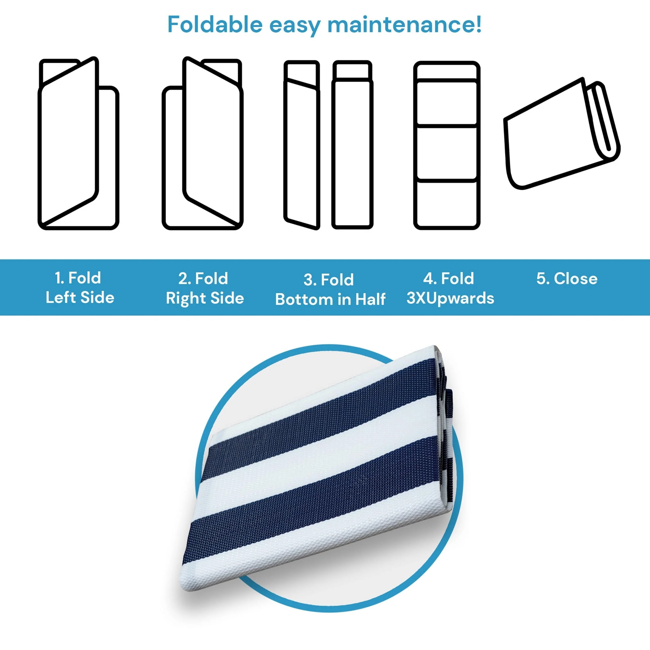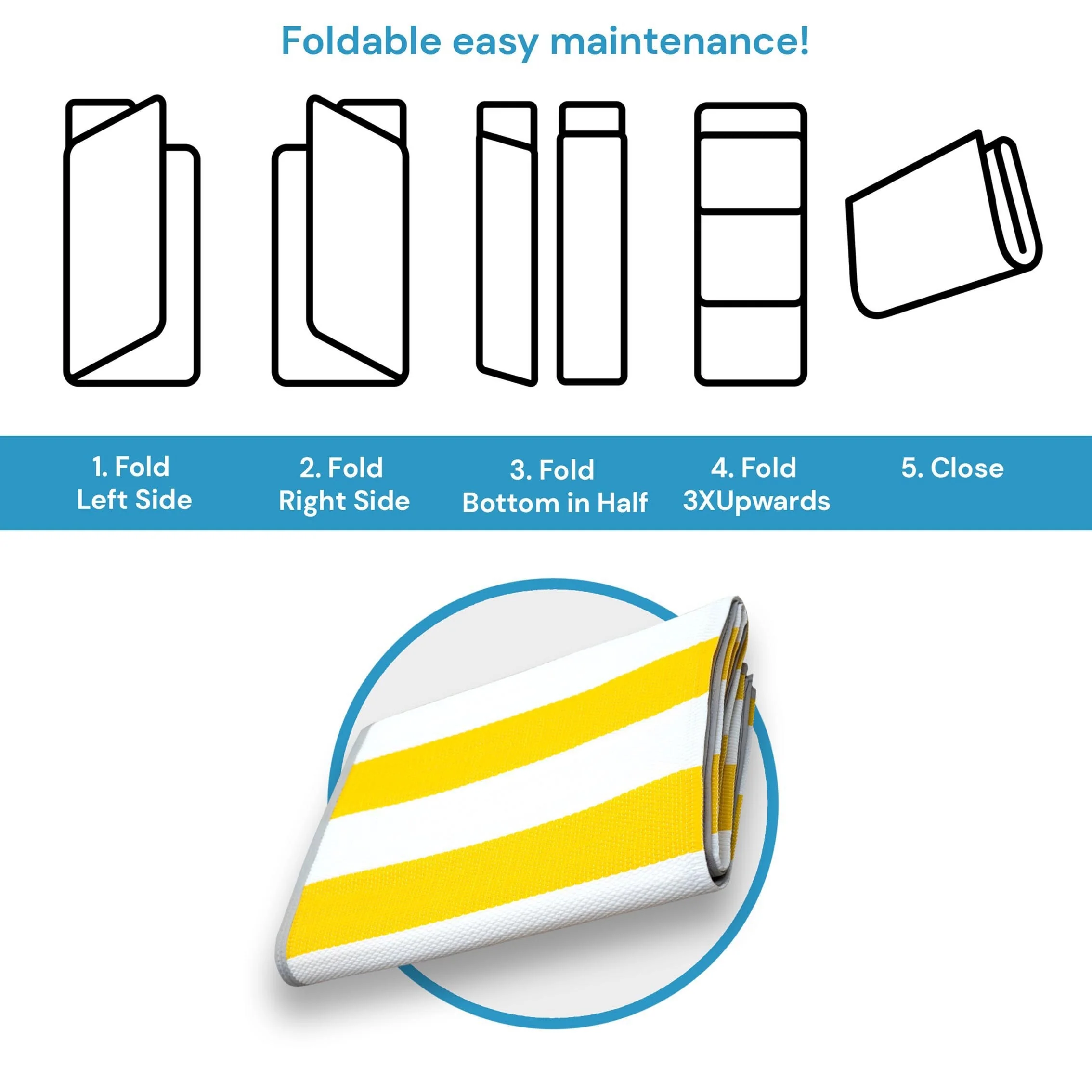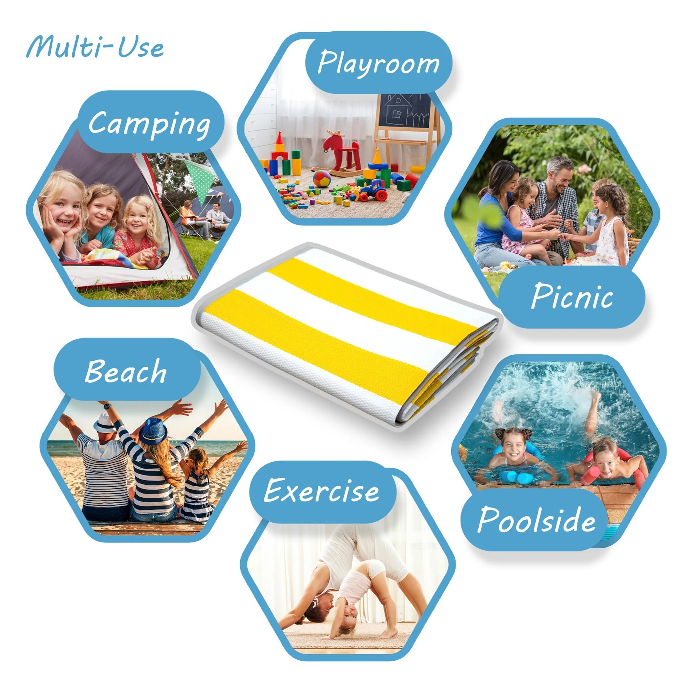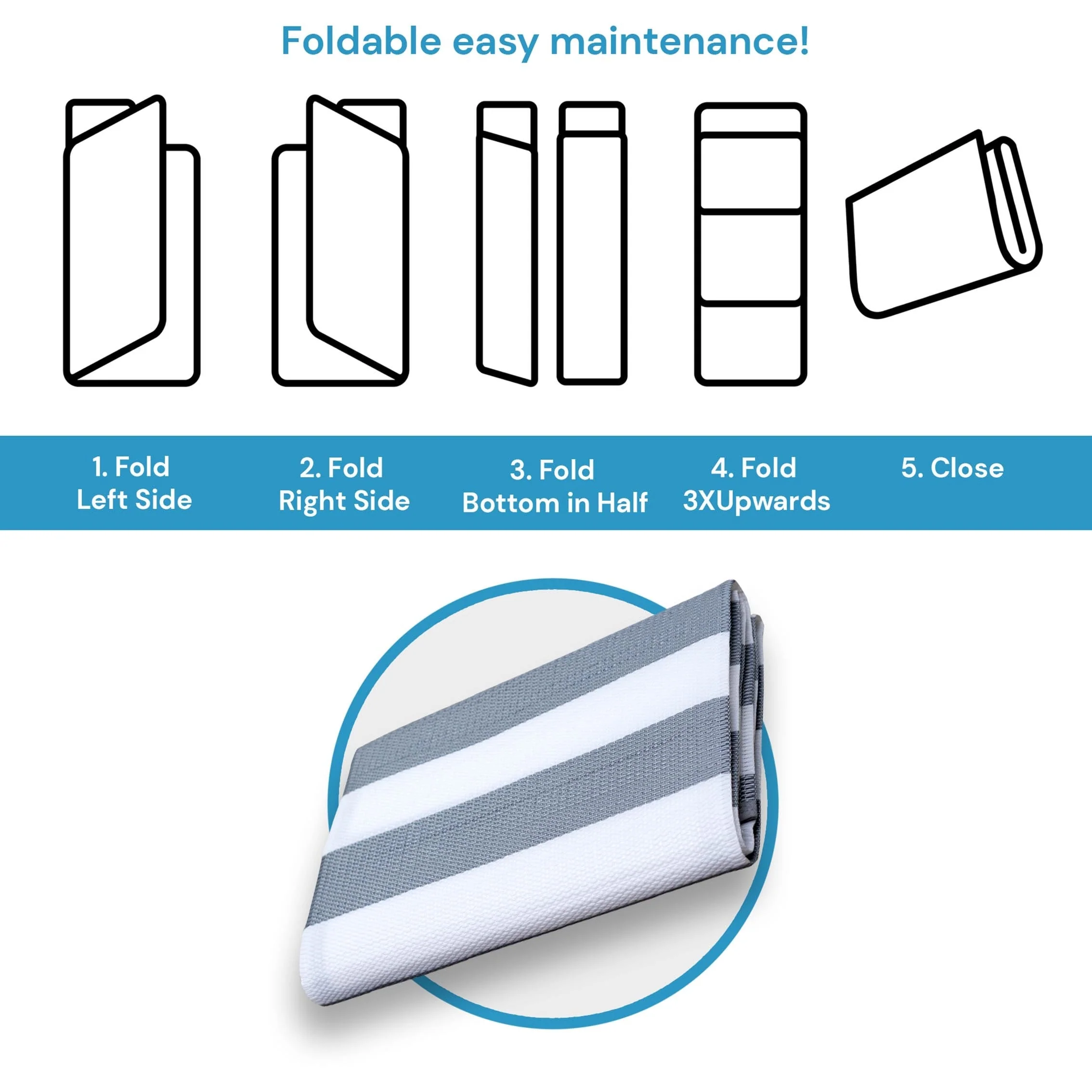 This multi-use foldable, waterproof outdoor rug is perfect for any adventure. Use this portable, reversible area rug mat for playroom, exercise, poolside, camping, or picnic. In a colorful cabana awning stripe pattern. Natural stain-resistance and no additional treatments make it kid and pet friendly. Vacuum or shake to remove debris. Spot clean or clean outside with water; spray with garden hose to rinse. Allow to dry thoroughly.