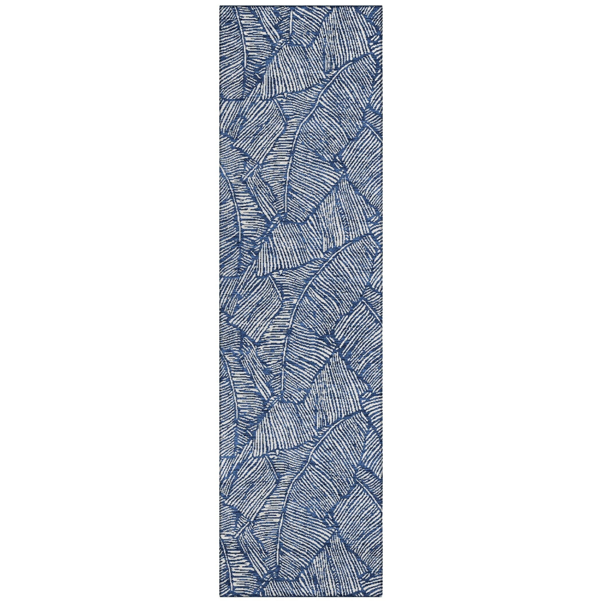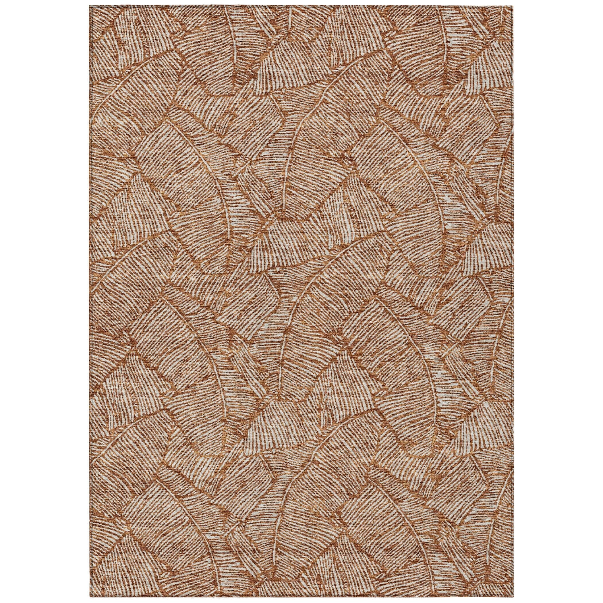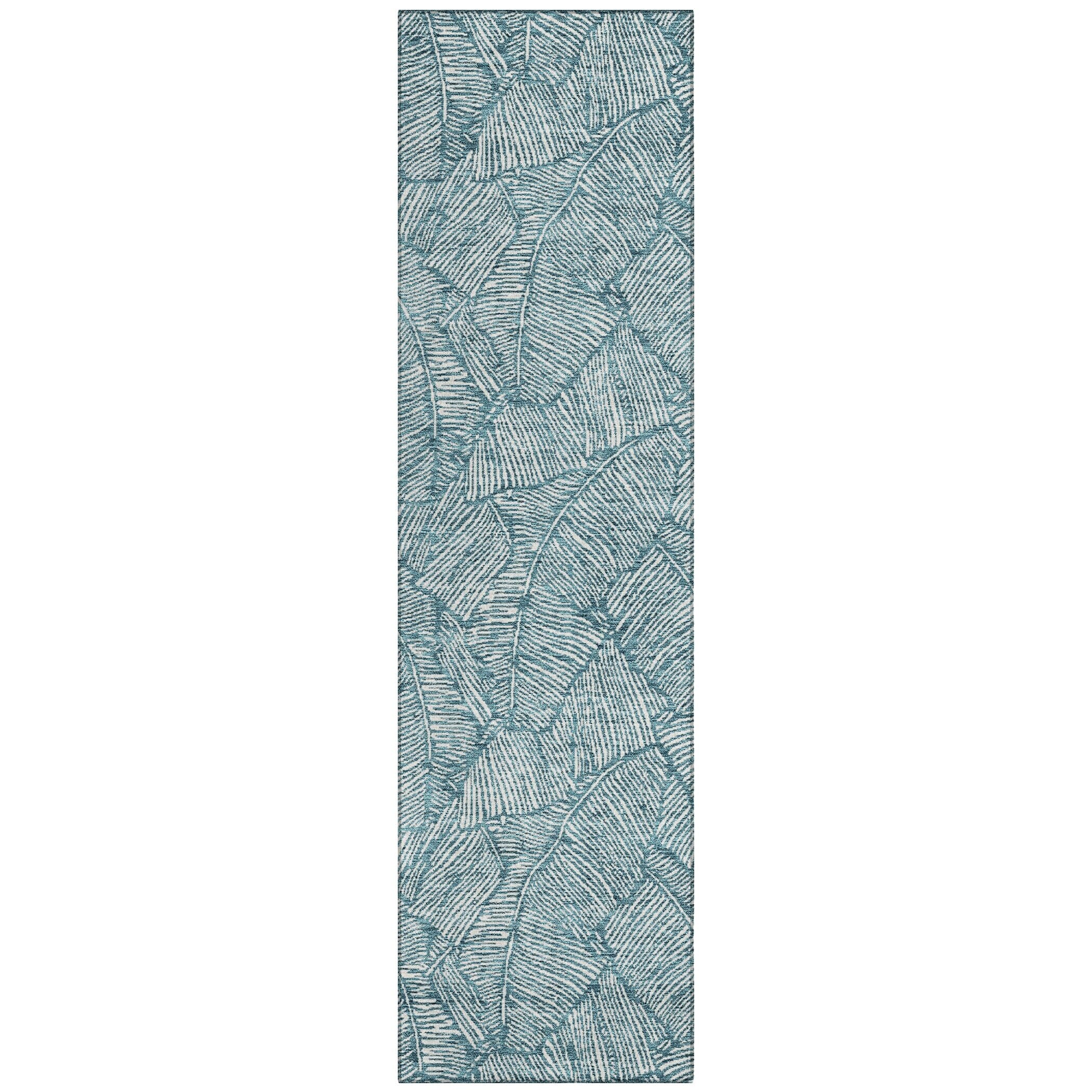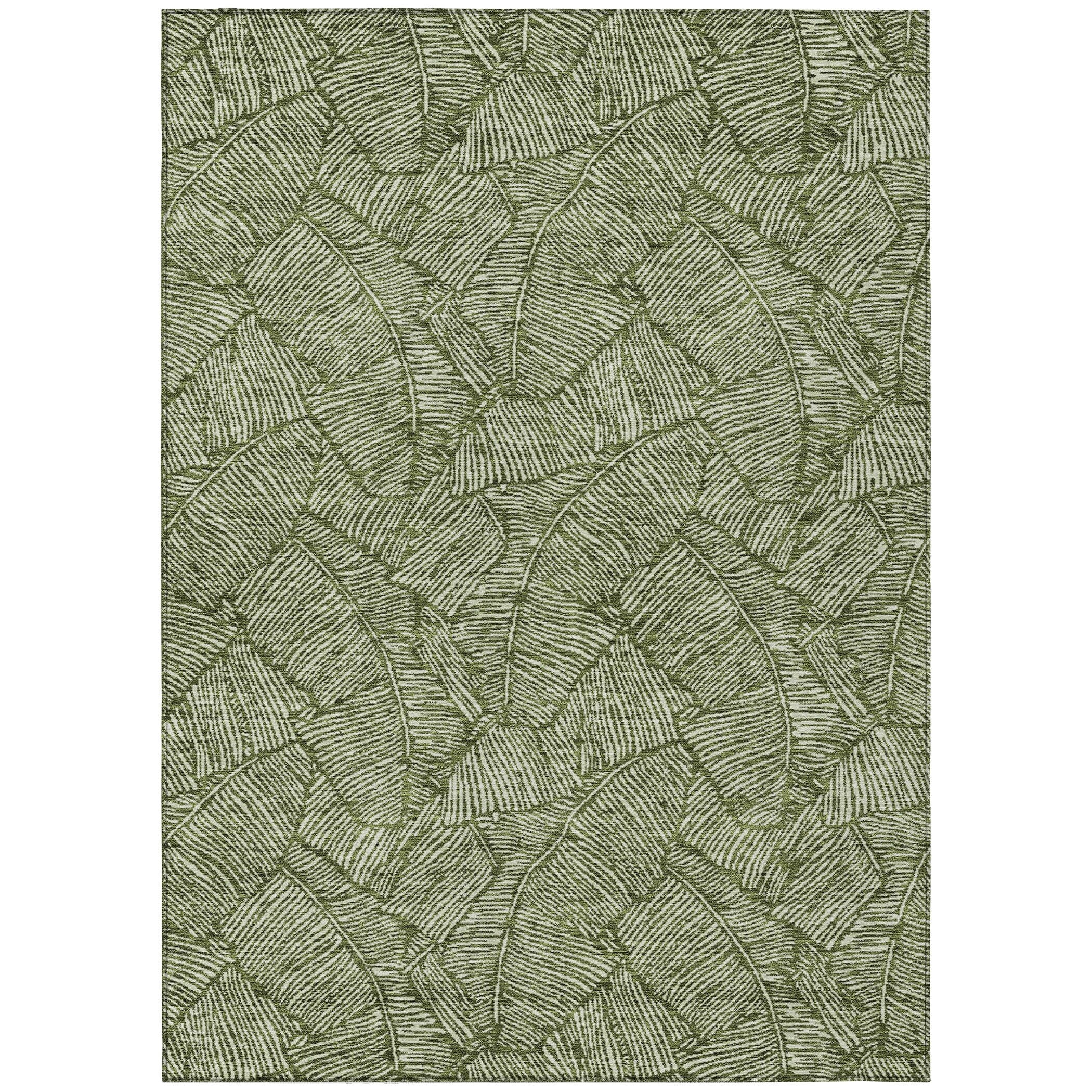 The area rug's large scaled leaves and monotone colorway provide a transitional and floral charm, perfect for enhancing any space. Its UV stabilization allows for use in any setting, while the ultra-thin build fits perfectly in your home. Machine-washable and suitable for families with pets and children, this rug offers both beauty and functionality. The ultra thin profile allows for fast drying after a rainfall or outdoor cleaning. UV Stabilized For Indoor or Outdoor Use. All rugs exposed to long periods of intense and direct sunlight can experience loss of color over time. Our rugs perform best in covered outdoor areas and uncovered areas with lower hours of direct sunlight. Larger rug sizes may not fit into a residential washing machine. They may be washed in a commercial size washing machine or hosed-off outside with mild soap and water. Air-dry, do not machine dry. While each rug already has a non-skid backing, the necessity for additional cushion or room settings with high traction areas, may require an additional rug pad.