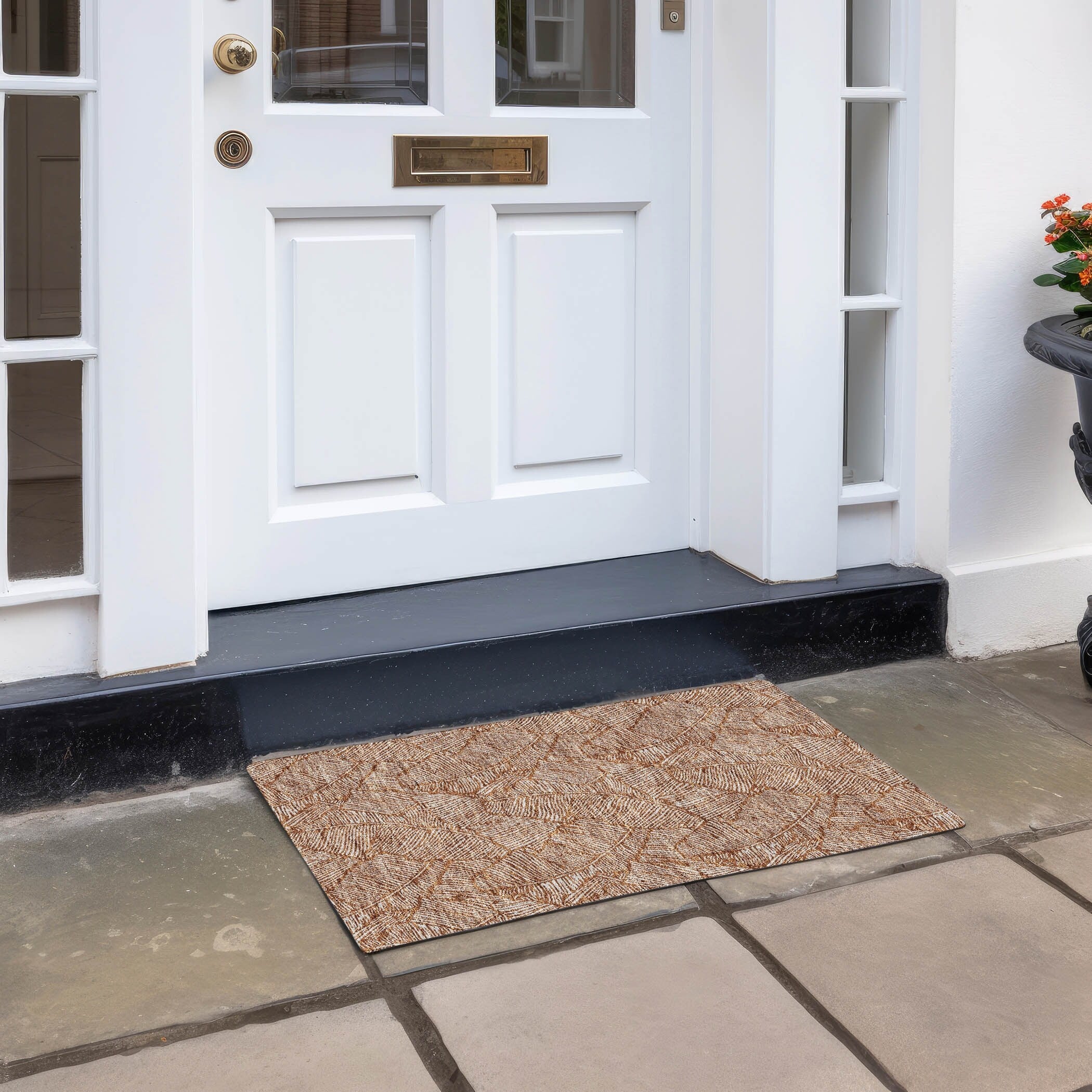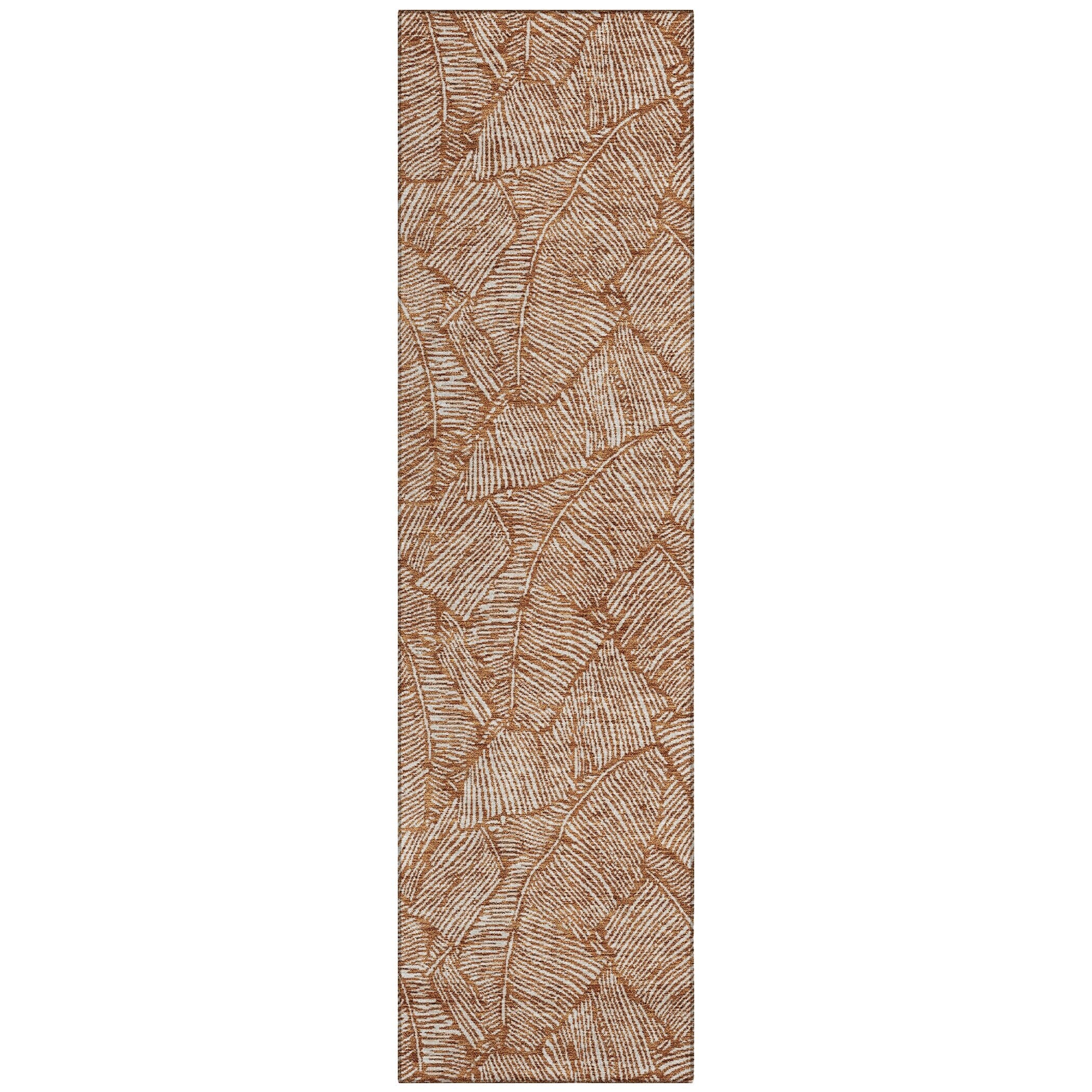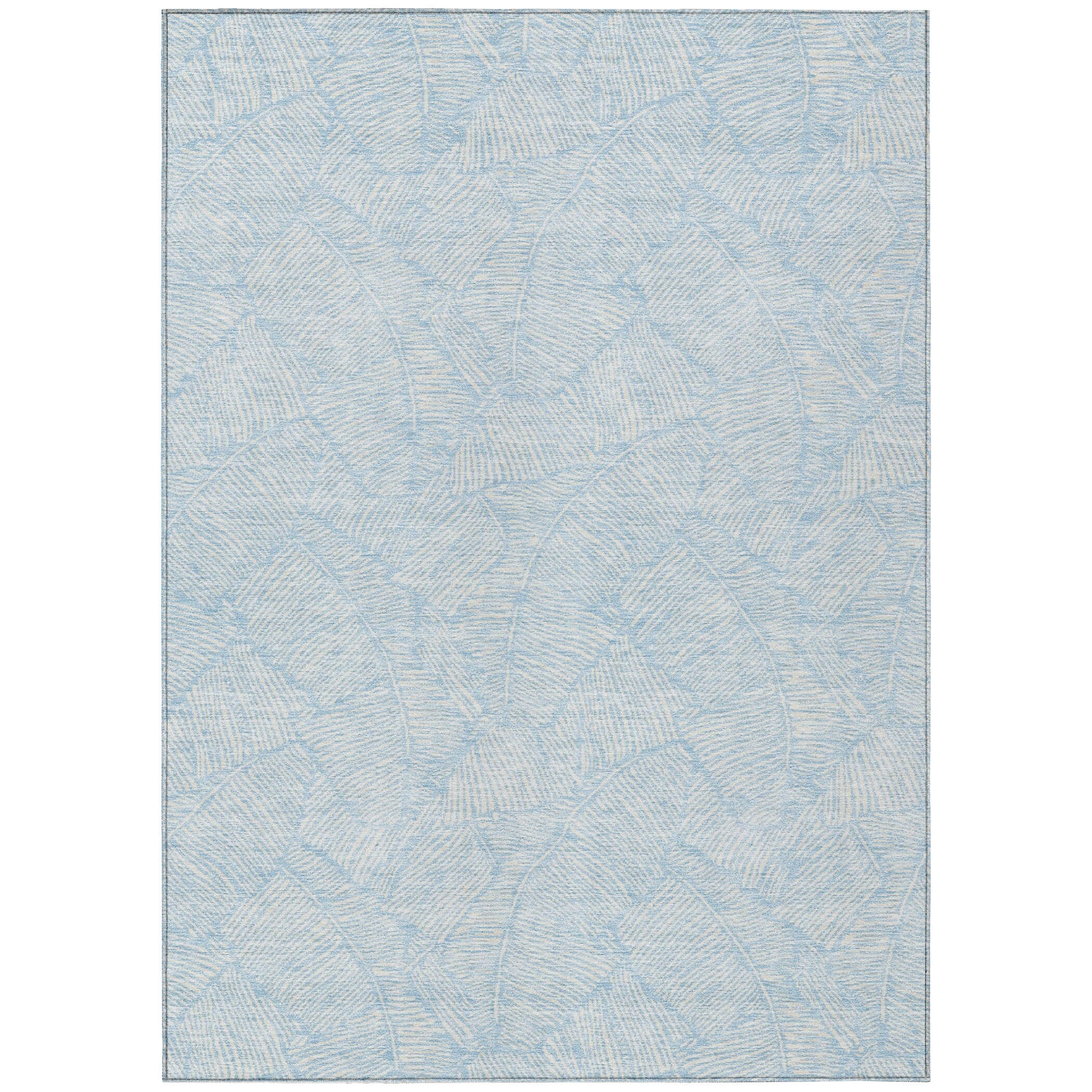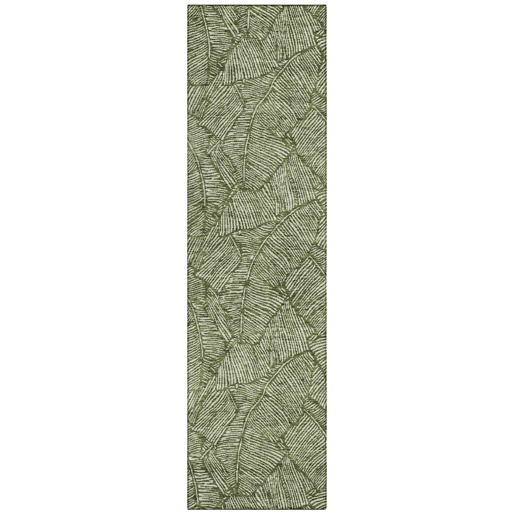 The area rug's large scaled leaves and monotone colorway provide a transitional and floral charm, perfect for enhancing any space. Its UV stabilization allows for use in any setting, while the ultra-thin build fits perfectly in your home. Machine-washable and suitable for families with pets and children, this rug offers both beauty and functionality. The ultra thin profile allows for fast drying after a rainfall or outdoor cleaning. UV Stabilized For Indoor or Outdoor Use. All rugs exposed to long periods of intense and direct sunlight can experience loss of color over time. Our rugs perform best in covered outdoor areas and uncovered areas with lower hours of direct sunlight. Larger rug sizes may not fit into a residential washing machine. They may be washed in a commercial size washing machine or hosed-off outside with mild soap and water. Air-dry, do not machine dry. While each rug already has a non-skid backing, the necessity for additional cushion or room settings with high traction areas, may require an additional rug pad.