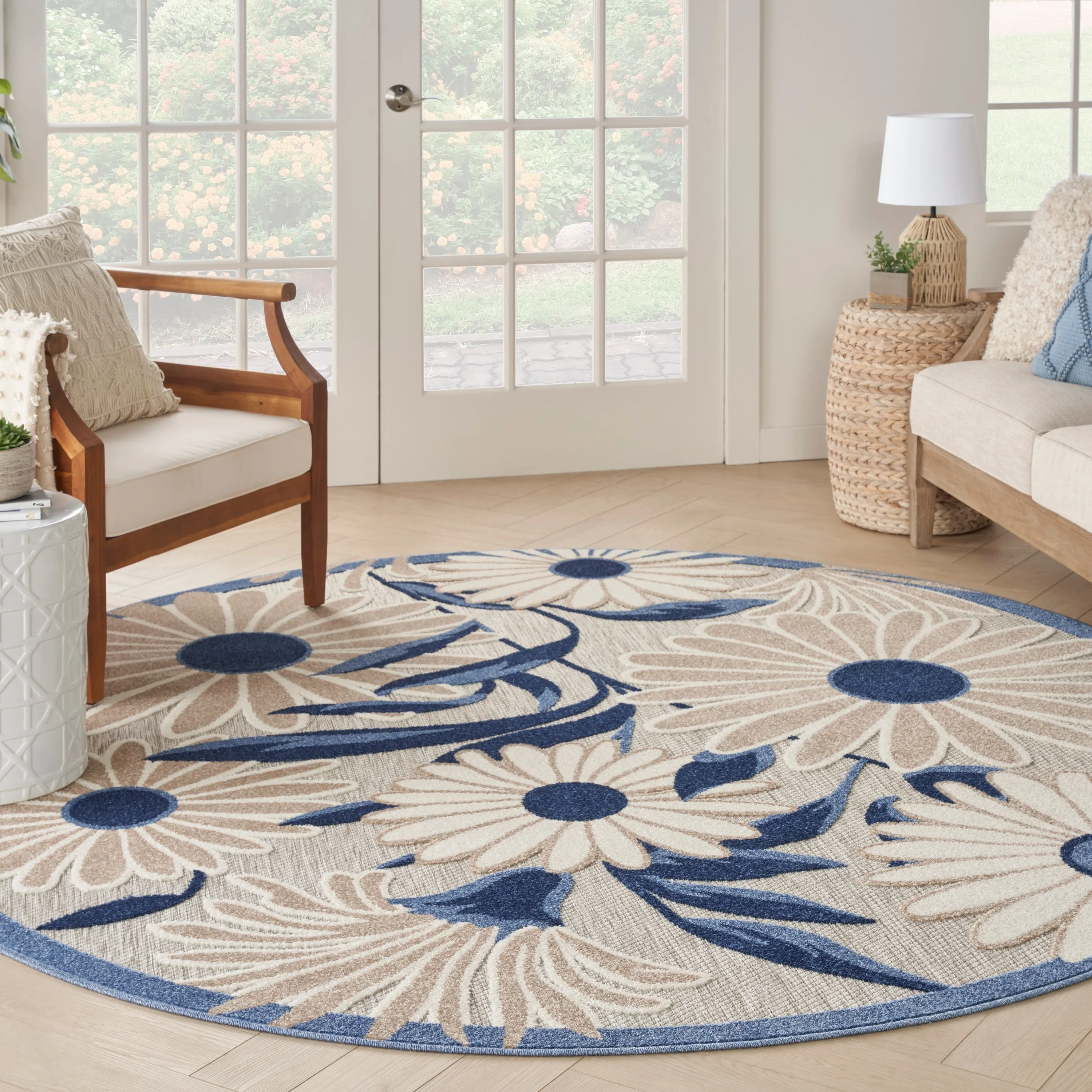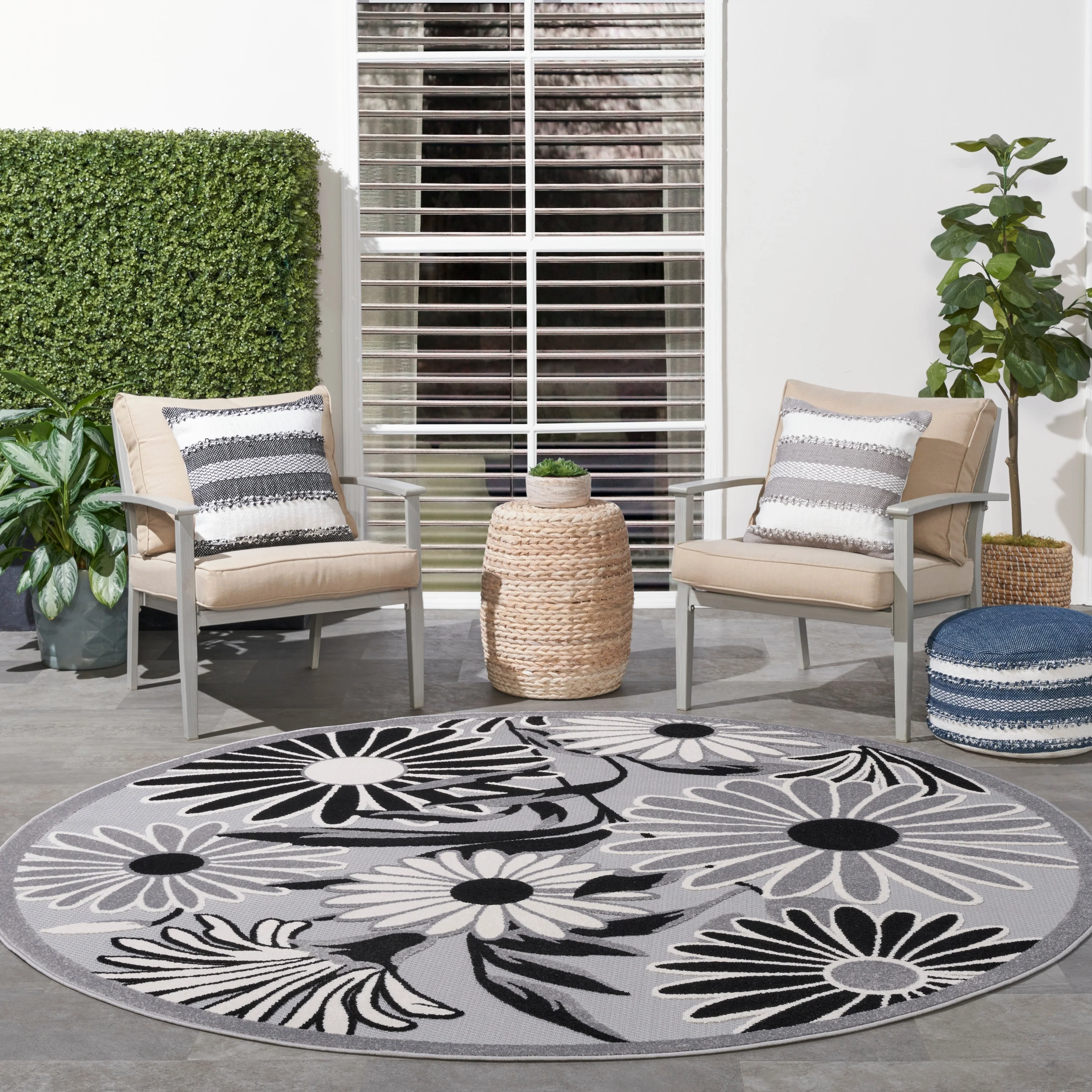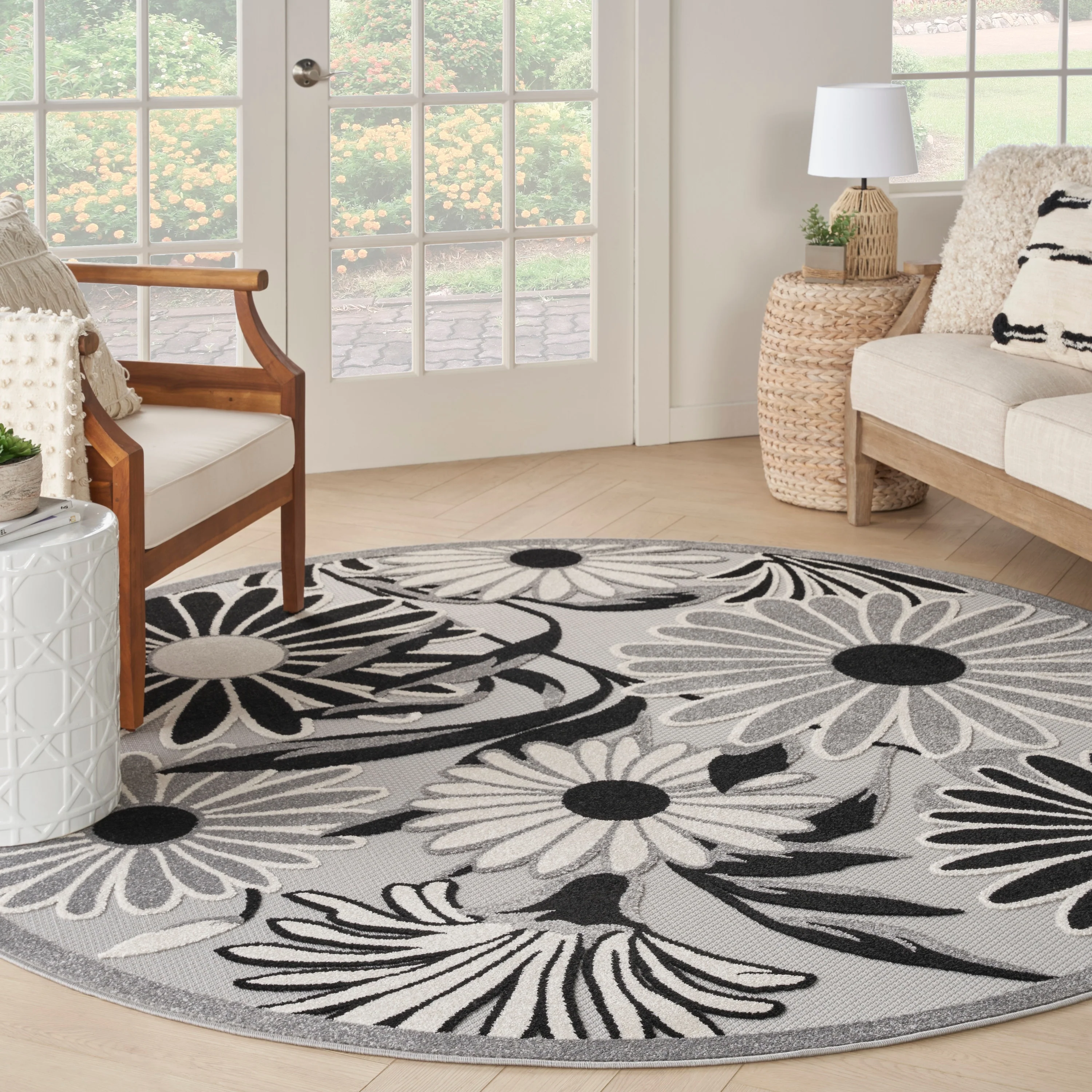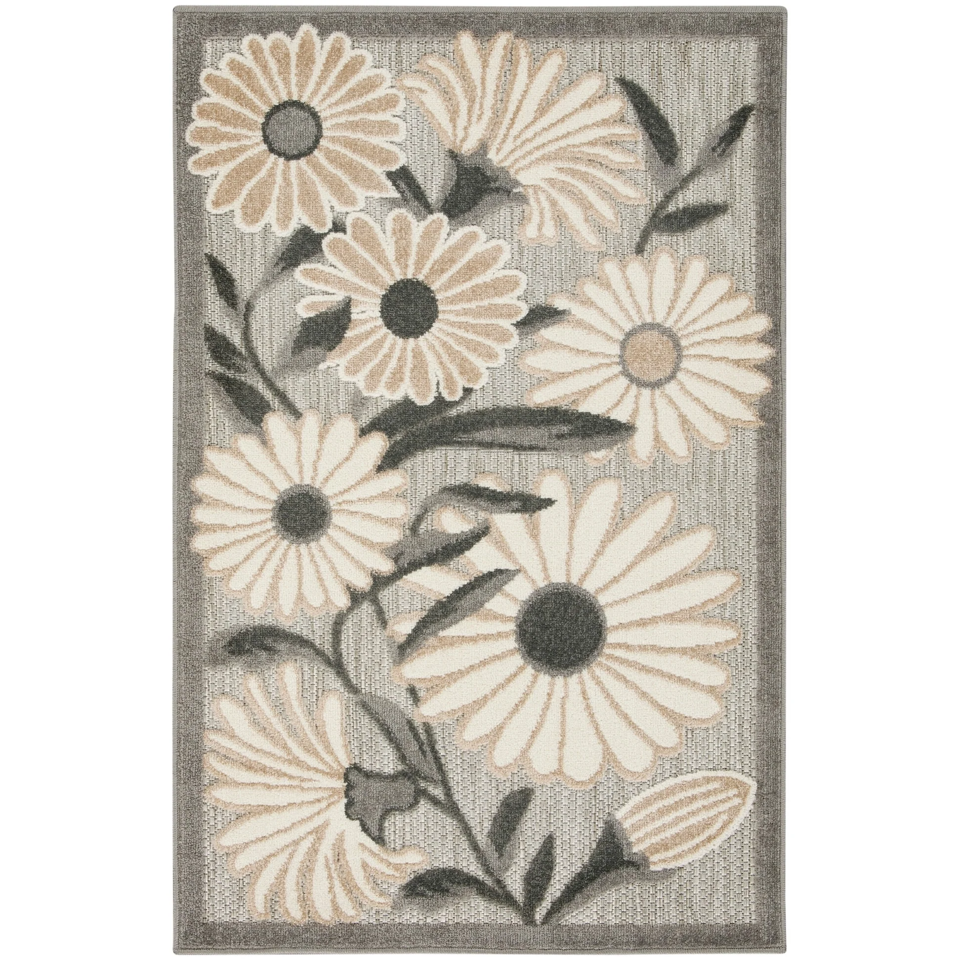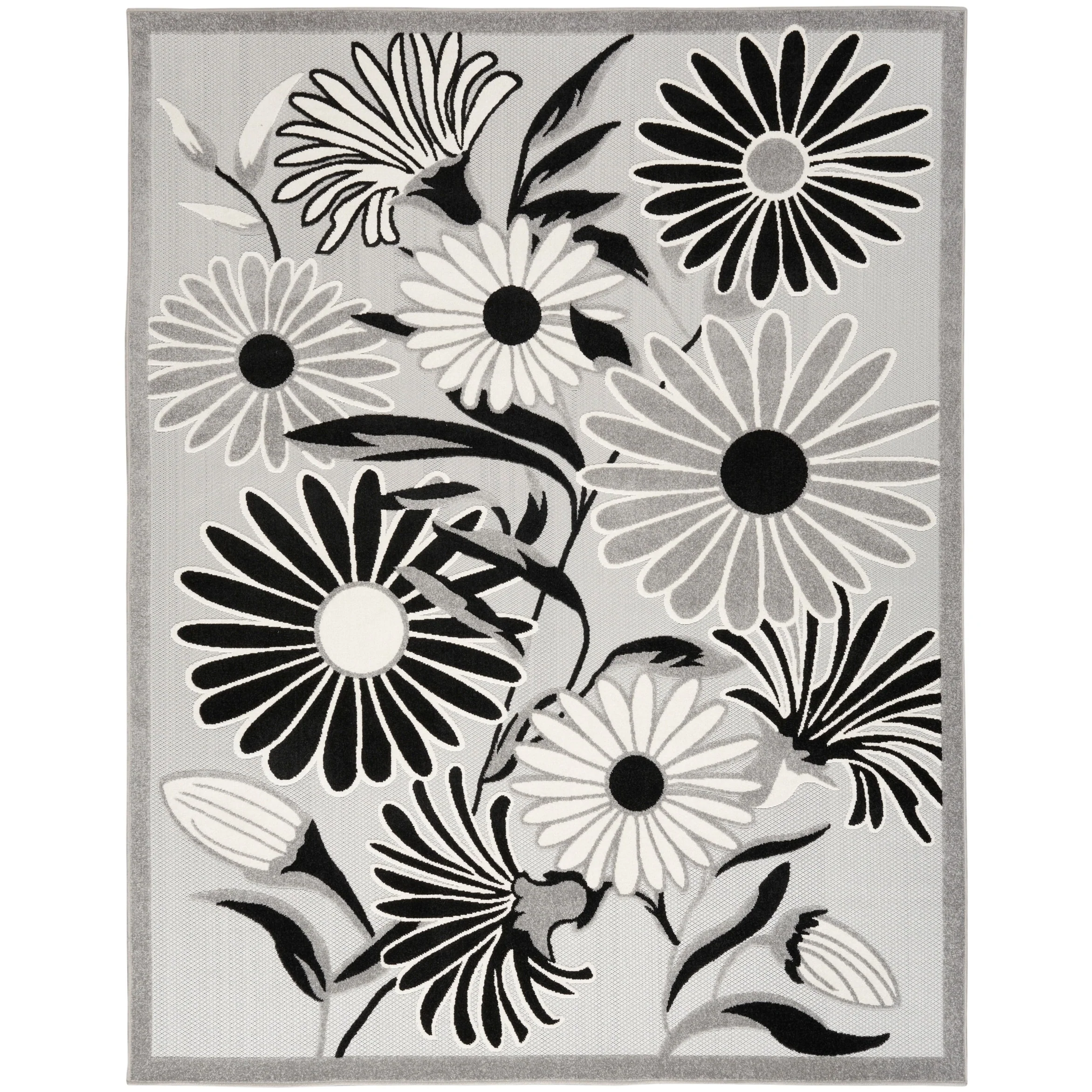 Add a touch of elegance and nature to your indoor or outdoor space with the Nourison Aloha Black Floral Area Rug. The oversized daisy pattern stands out with a subtly raised finish, adding a soft texture to the flatwoven surface. Made from durable and stain-resistant polypropylene yarns, this rug is easy to clean and maintain.