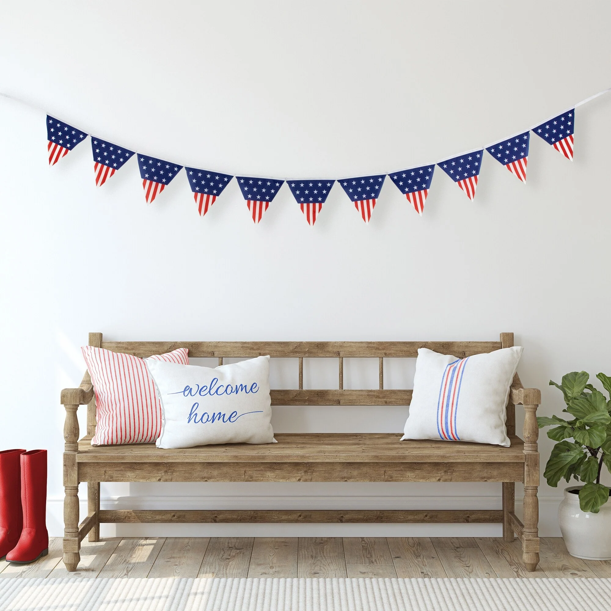 Add a touch of timeless patriotic flair to your space with this Fourth of July wall banner. Embrace the spirit of the USA with a captivating display of stars and stripes pennant flags, beautifully designed in the classic red, white, and blue color scheme. Whether it's to celebrate national holidays like Memorial Day or Independence Day, honor military service, or simply showcase your pride, this banner effortlessly captures the essence of Americana.