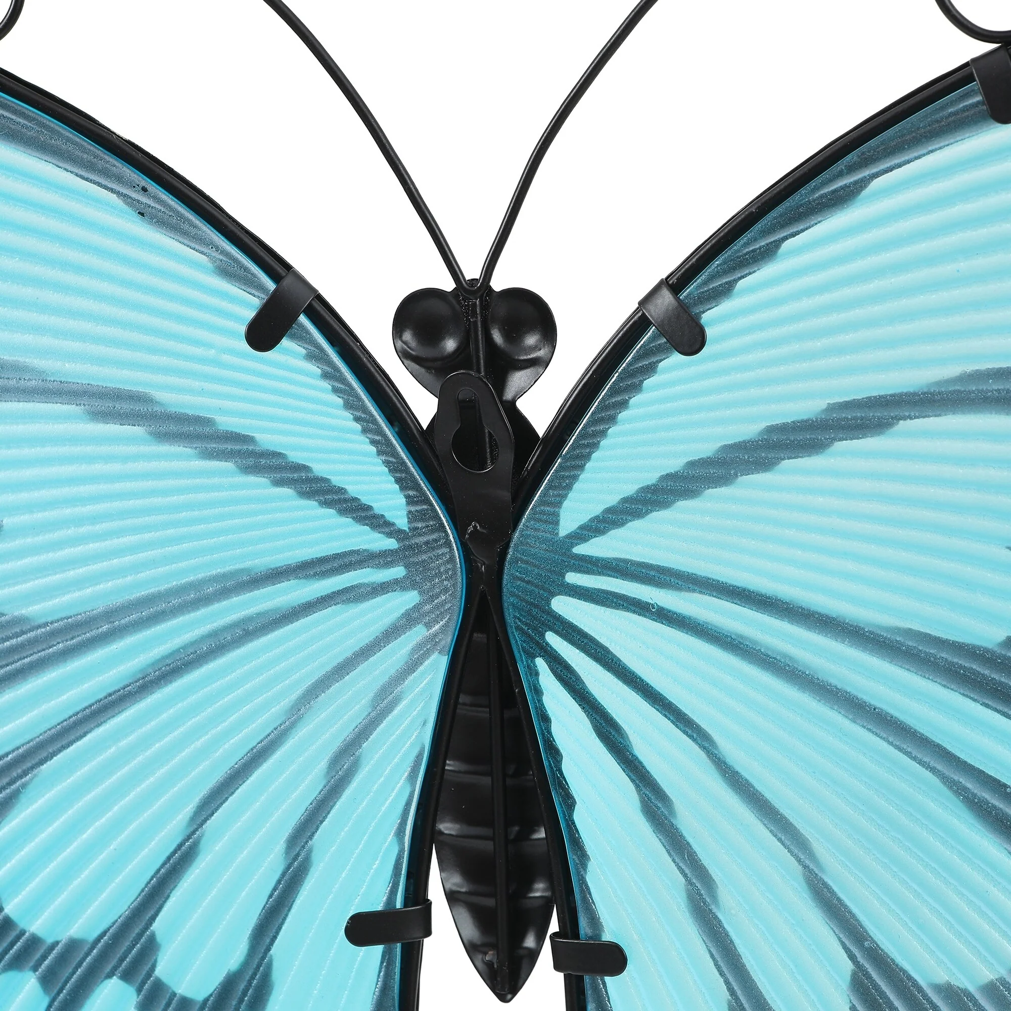 Our nature inspired butterfly sculpture is handcrafted from metal and glass and will add a refreshing sense of grace and charm to your indoor or outdoor living areas. Featured in a bright blue color with a weather resistant finish, this creatively crafted butterfly brings a colorful touch to your living room, kitchen, bedroom, or bathroom; or show off outdoors on a fence, patio, pool, or other outdoor living space. Add some decorative charm to your home with this beautiful butterfly wall plaque. It also makes a thoughtful and wonderful gift for your butterfly loving friends and family. It is easy to hang with the eye hook attached to the back of the wall art.