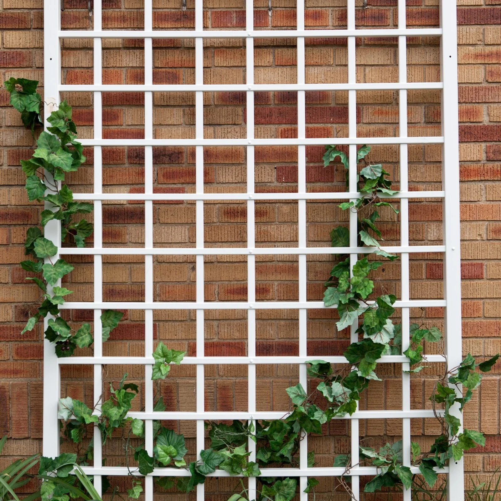Update your patio in and elegant way with this DuraTrel Winchester white vinyl wall trellis. It features a large trellis topped with decorative finials resembling an ancient castle gate. You can display your climbing plants in majestic style on the tight grid of this oversized trellis and watch your fence or wall transform with dramatic, dynamic beauty.