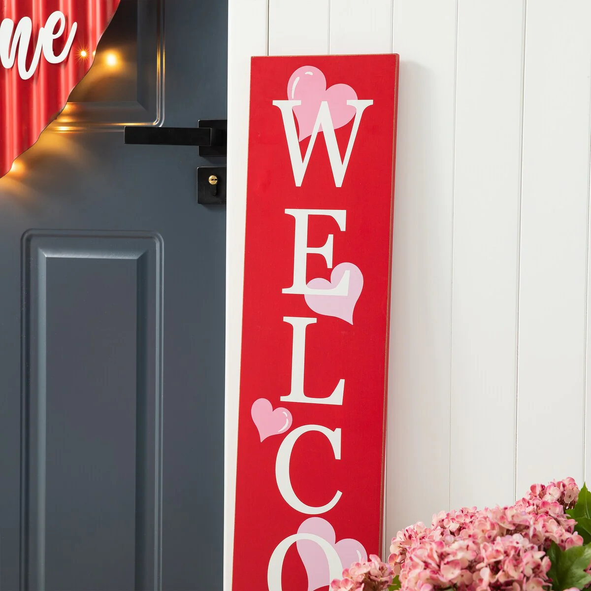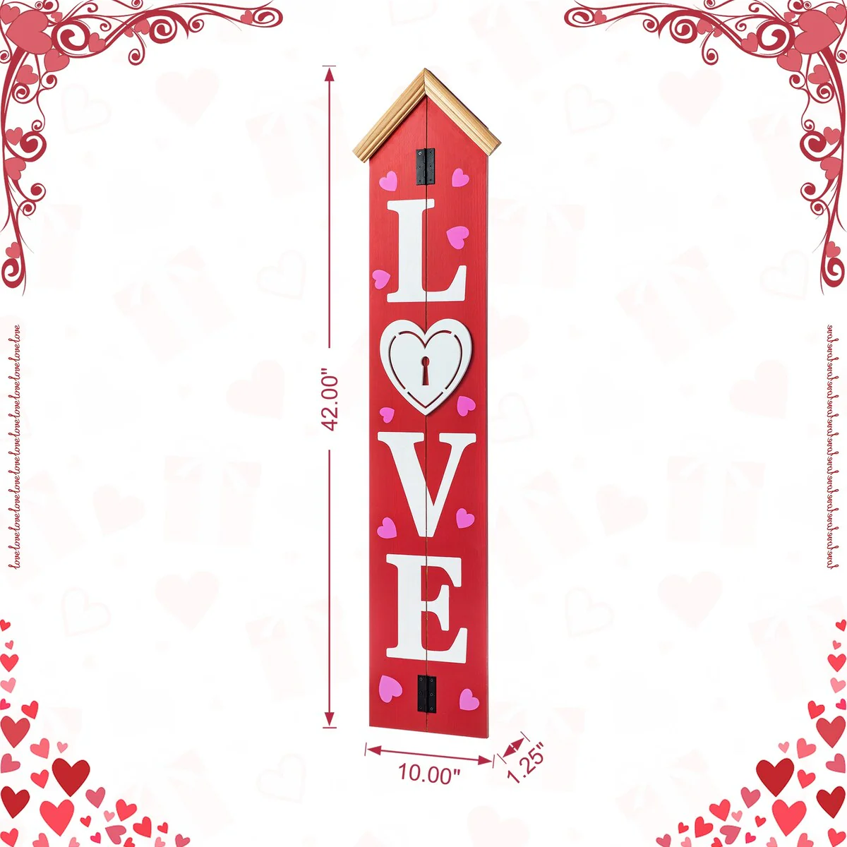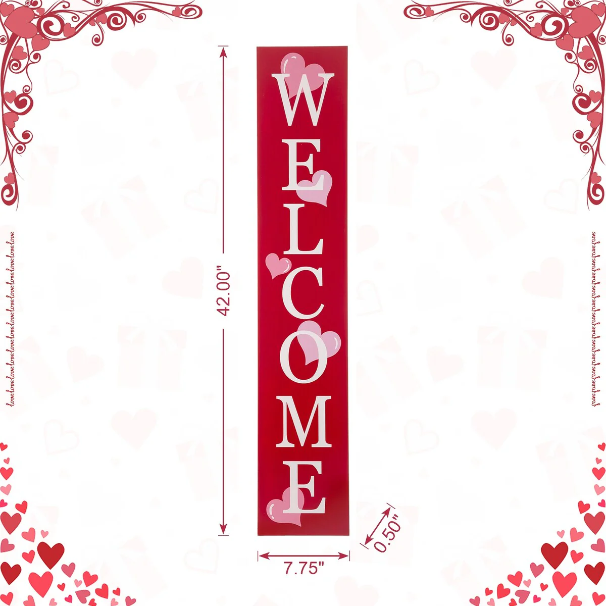 Bring a merry touch to your holiday décor using the vertical porch leaner. 'WELCOME' and 'LOVE' are written down on the red panel front that is accented with pink hearts. It's able to be displayed upright by an easel stand or from a wall, it's a charming addition to your seasonal decorations.