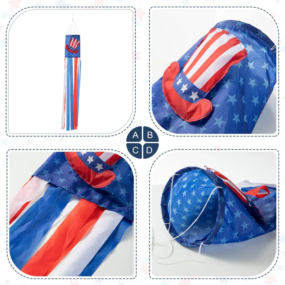 The set of 44'H American windsocks features with red&blue and white stripes, blue and white stars, one with a hat pattern and another is a firecracker, both are eye-catching decoration.The ideal 4th of July outdoor decorations& Independence Day decorations and Memorial Day decorations to express gratitude and admiration to soldiers and country.