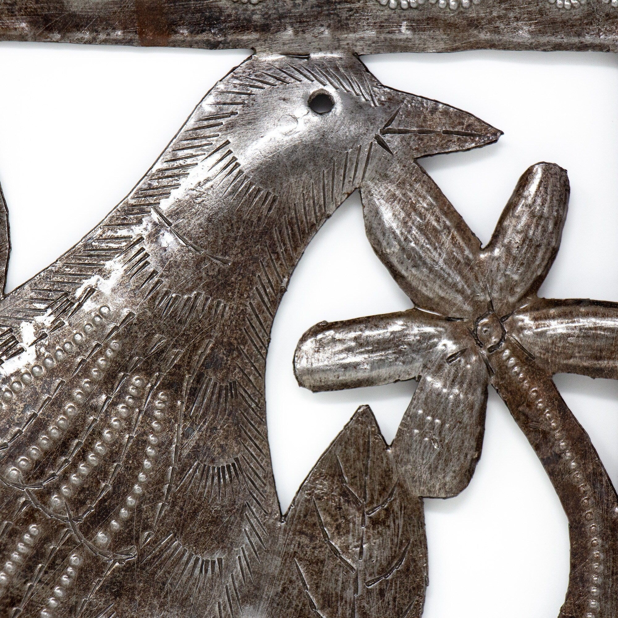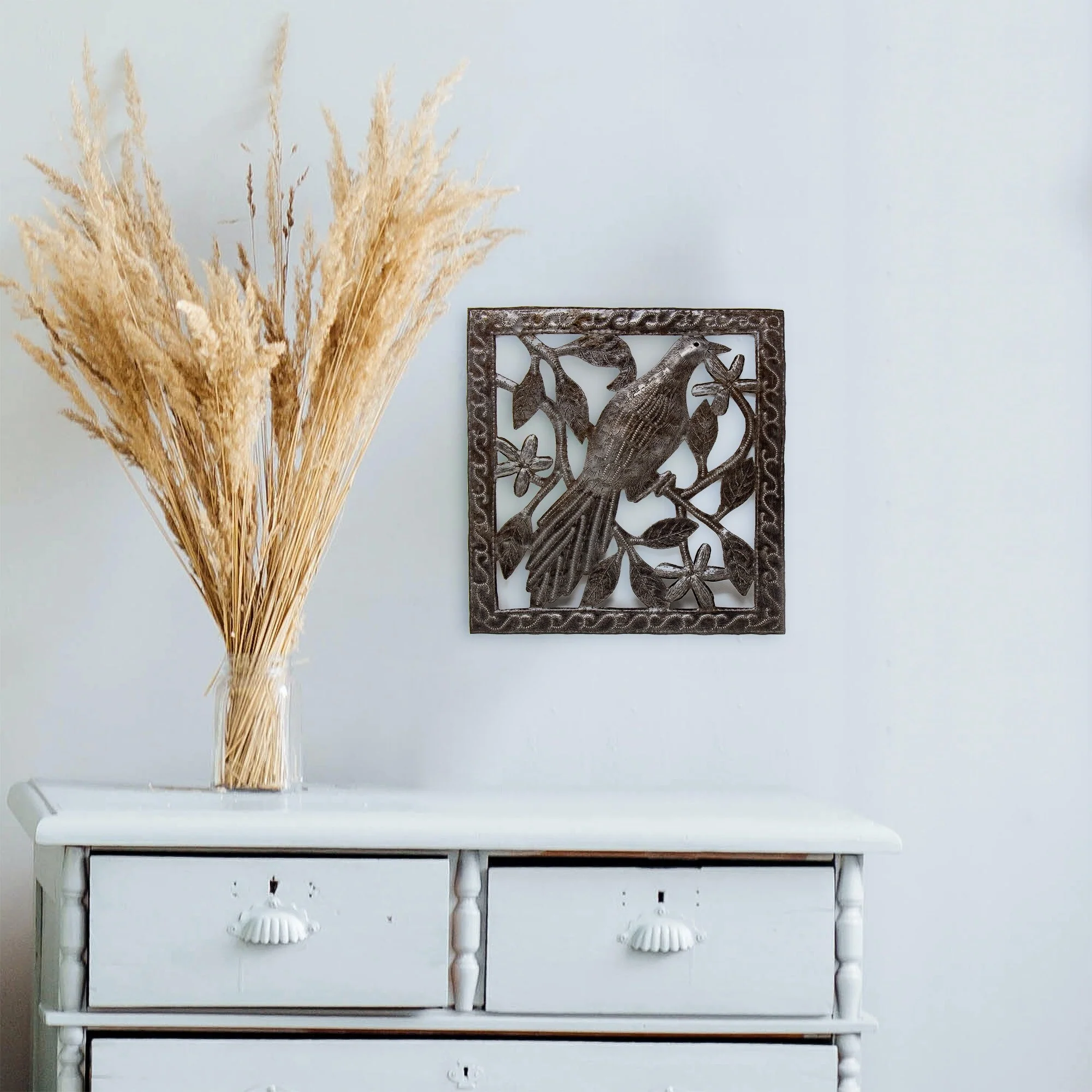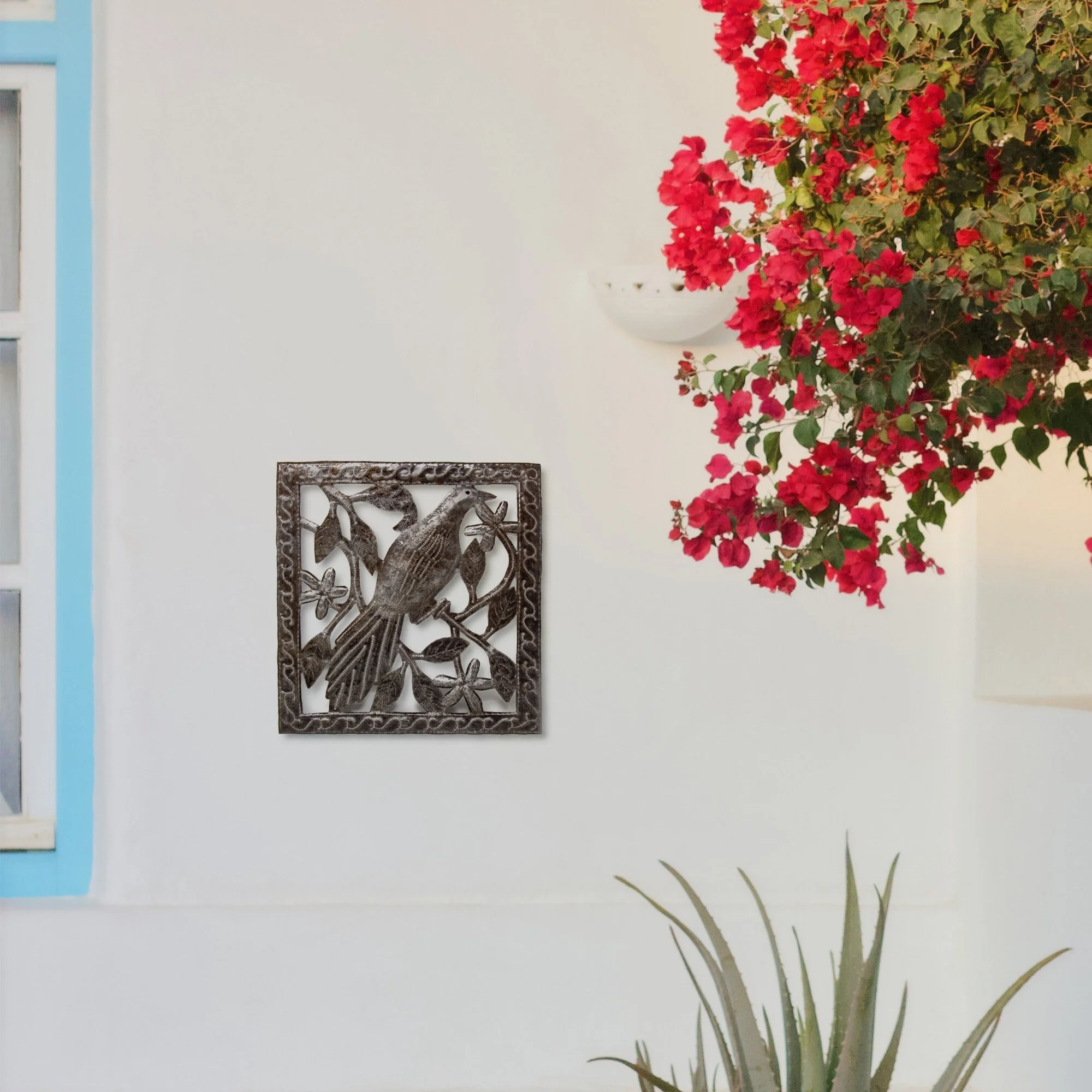 Add a touch of charm to your decor with this Handmade Bird Metal Wall Art. Expertly crafted by Haitian artisans, this 11-inch by 12.25-inch piece is cut and embossed from steel oil drums, featuring a beautiful bird design. Its high-gloss varnish makes it perfect for both indoor and outdoor display.