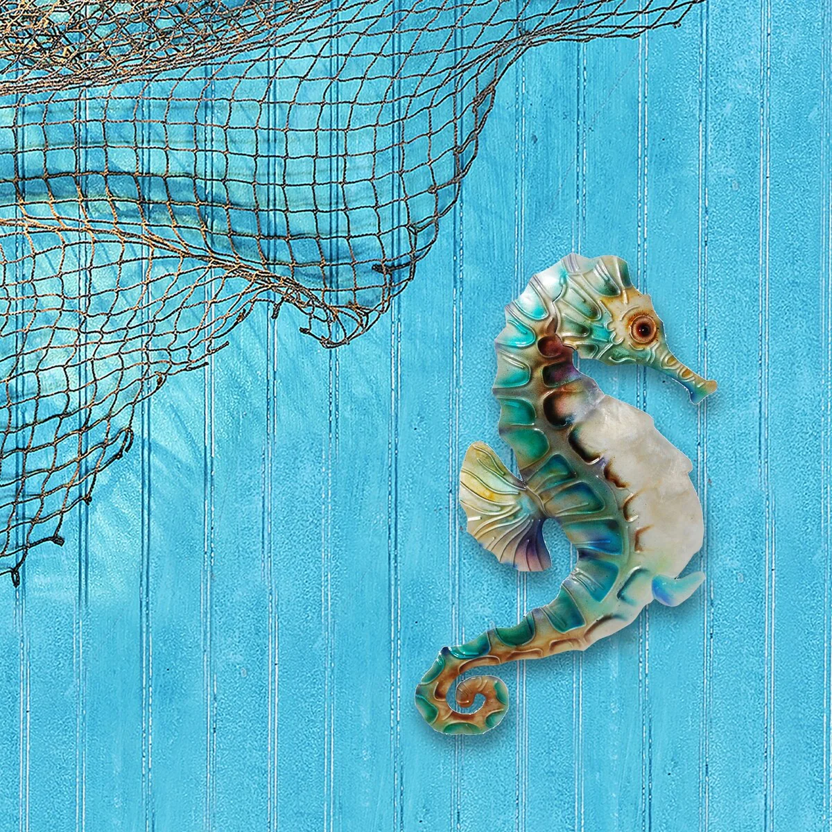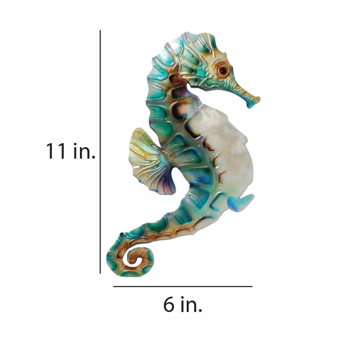 Bring a touch of whimsy to your home with this charming handmade wall seahorse in blue and pearl. Crafted from metal and capiz shells, this decorative accessory is eco-friendly and fair trade. With its hand-painted finish, this unique piece is perfect for enhancing any indoor or outdoor setting.