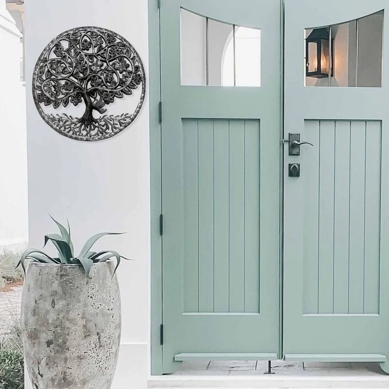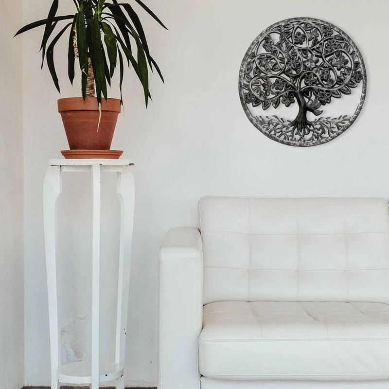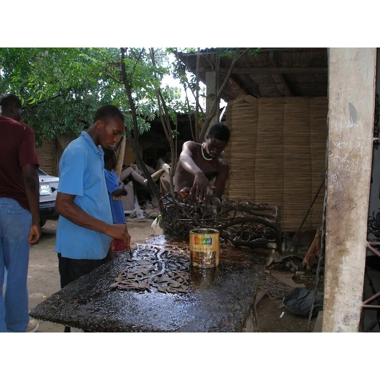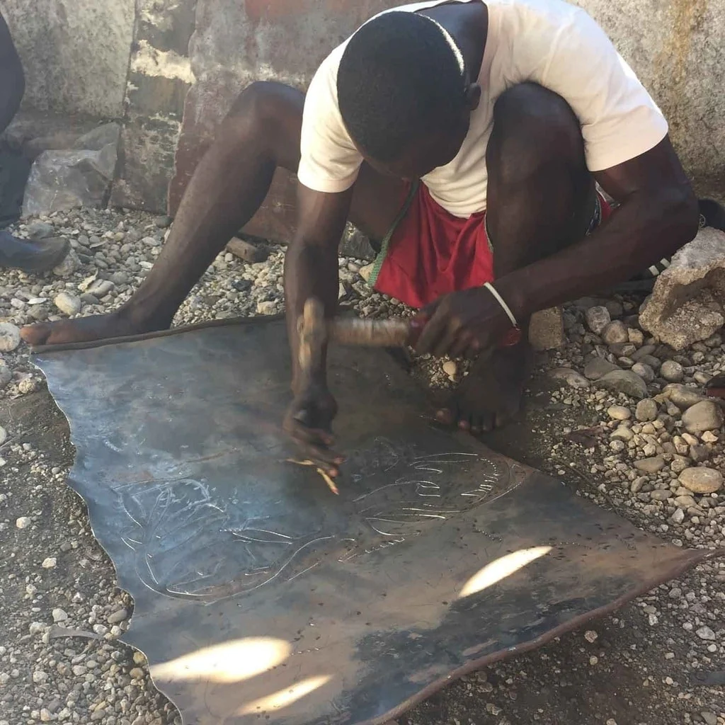 When you visit Croix des Bouquets, the area of town known for Haitian metal art in the capital of Port-Au-Prince, you are met with a cacophony of tink, tink, tink as ball peen hammers strike sheets of steel. The sheets are cut from steel drums colored by oil and other liquids the drums at one time held. The process of turning sheets of metal into beautiful wall art is all done by hand, from cutting holes that become edges of trees and leaves, to accenting each gecko with a texture of scales, to painting or lacquering the final design. The artists are proud of their work, often signing the pieces on the back side, leaving a raised, reversed signature on the front.
