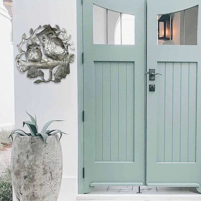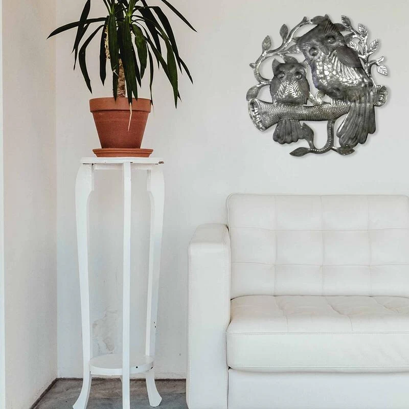 This piece features a pair owl on a perch design in this traditional Haitian design. Hand cut and embossed, this piece is 23 inches in diameter.