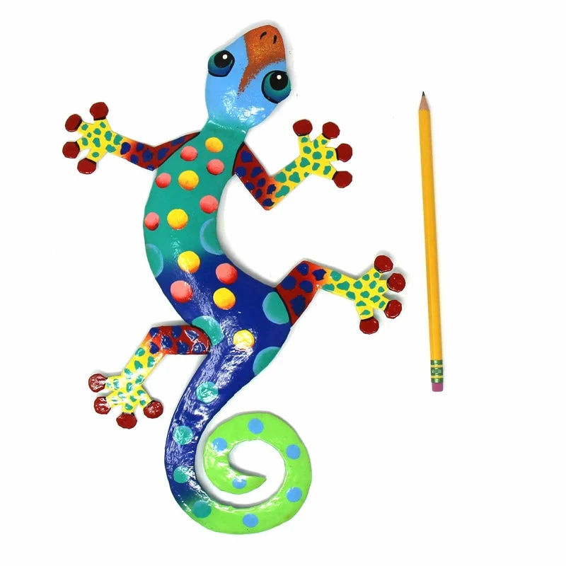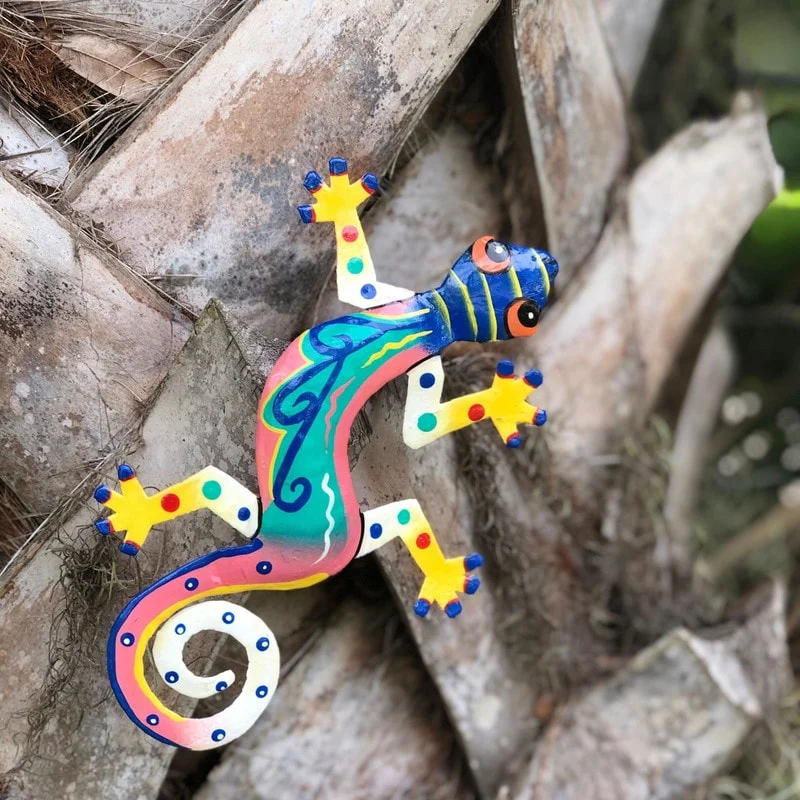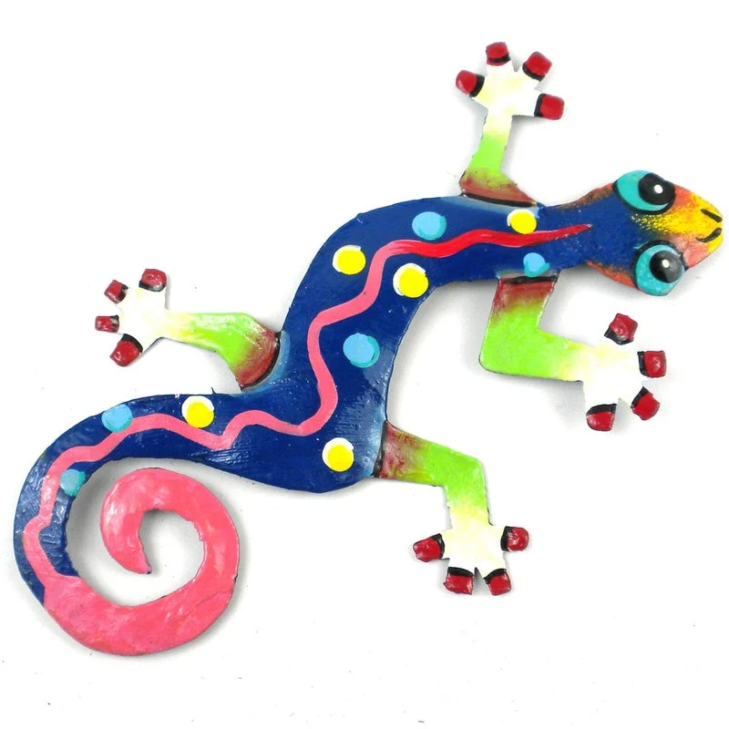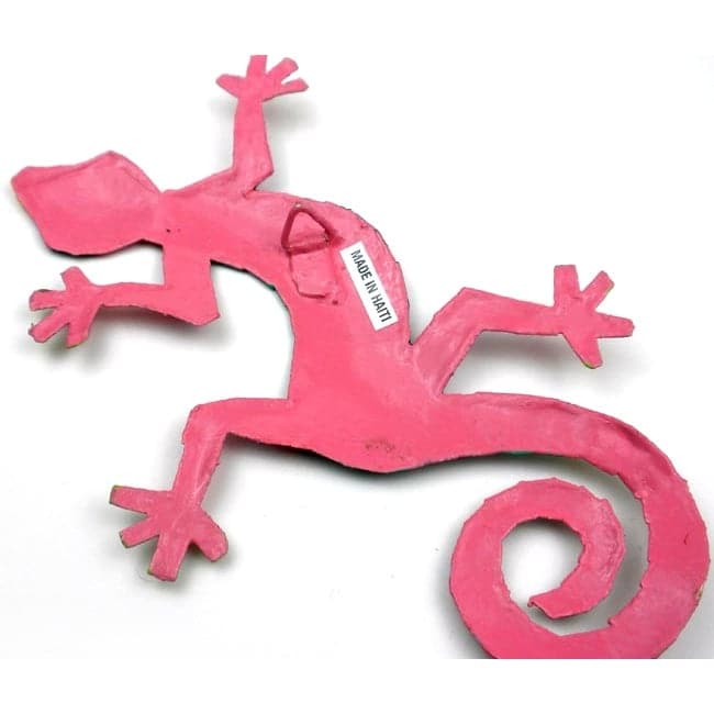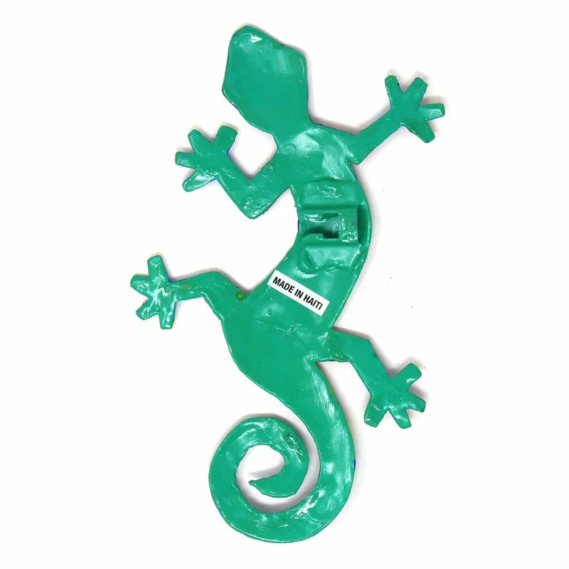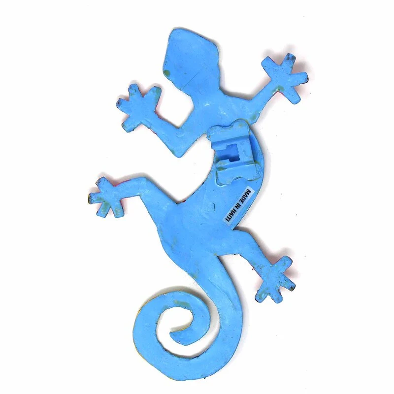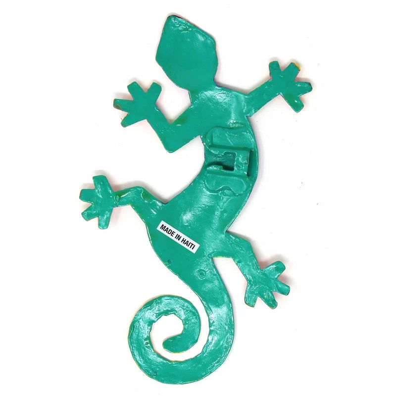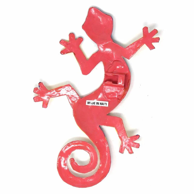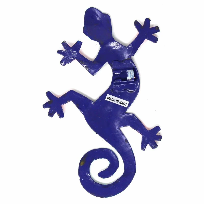 This colorful gecko is handmade in Haiti from recycled oil drums. Inspired by Haitian culture, this wall hanging will decorate your home with unique style. Suitable indoors or outdoors.