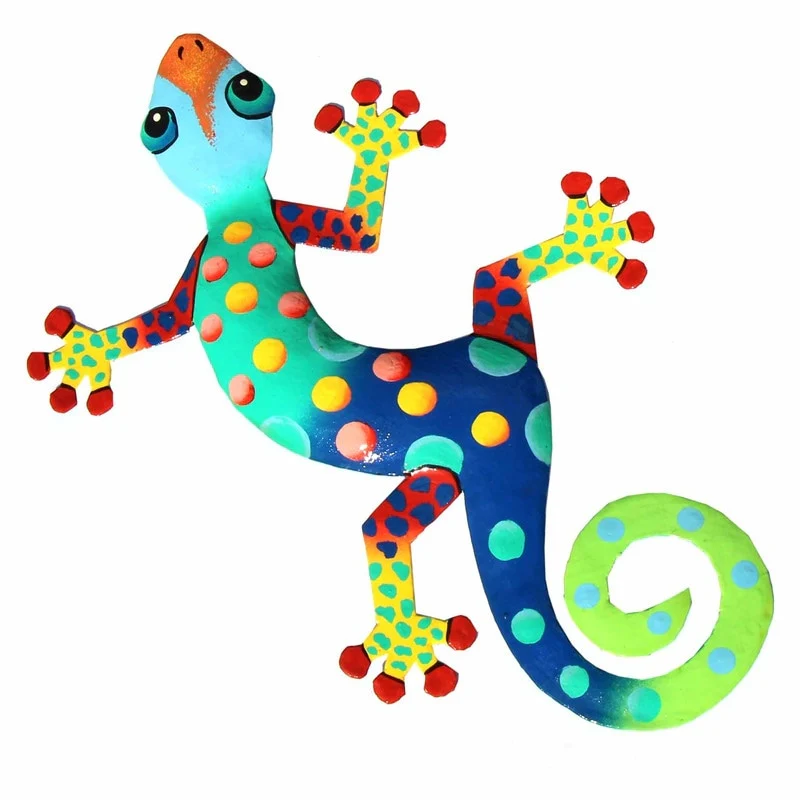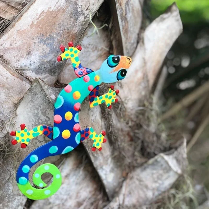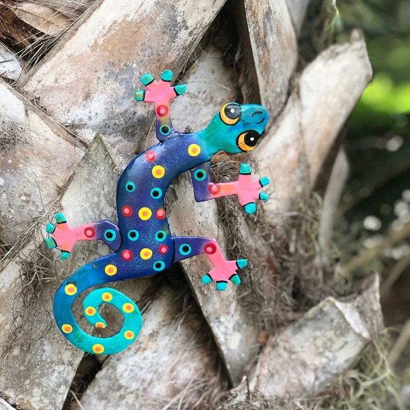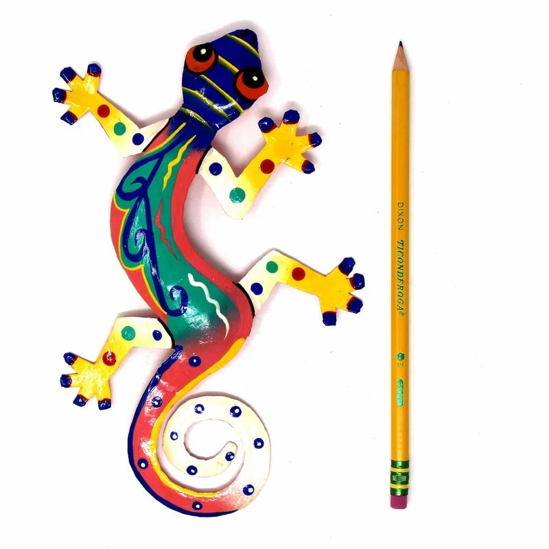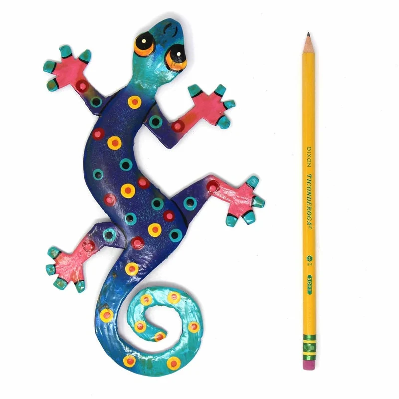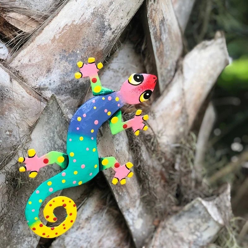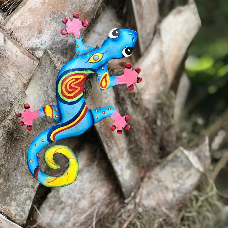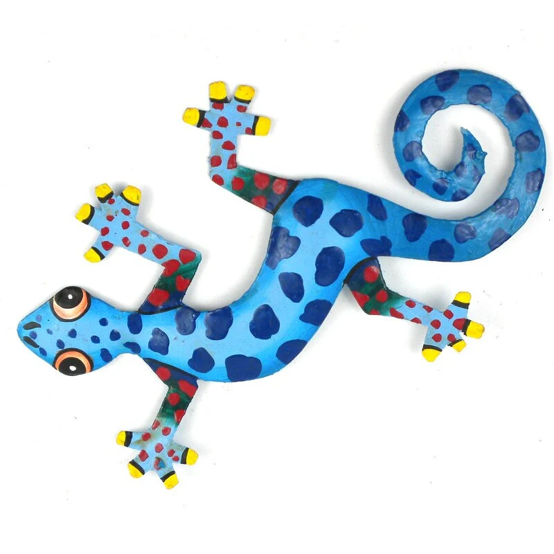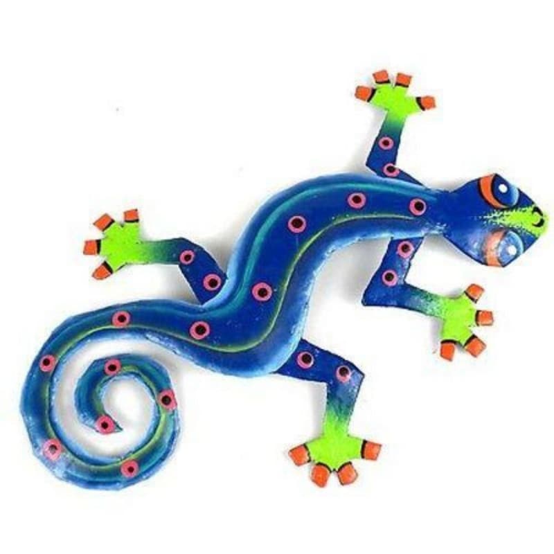 This colorful gecko is handmade in Haiti from recycled oil drums. Inspired by Haitian culture, this wall hanging will decorate your home with unique style. Suitable indoors or outdoors.