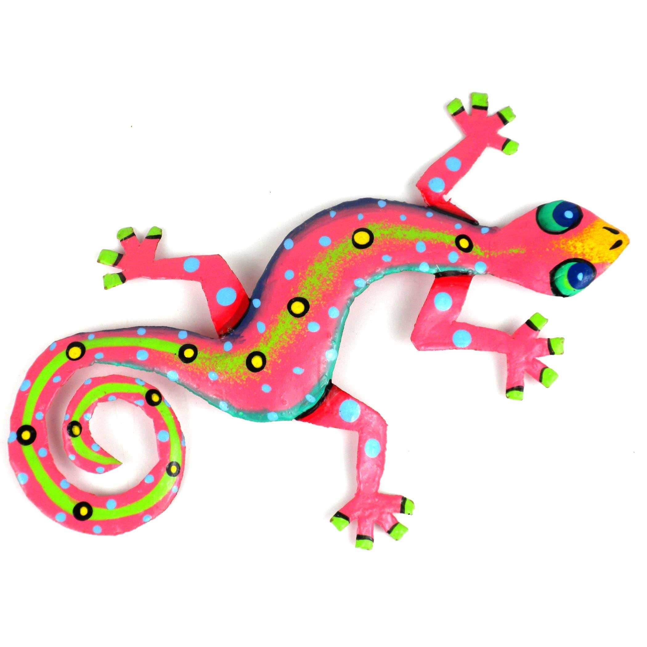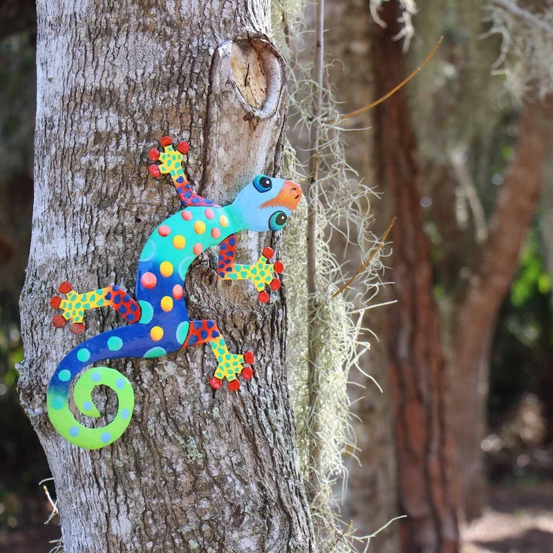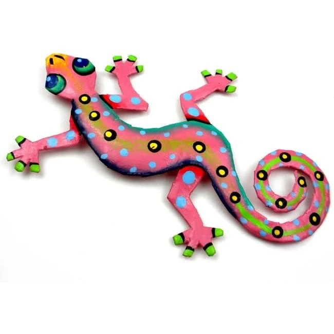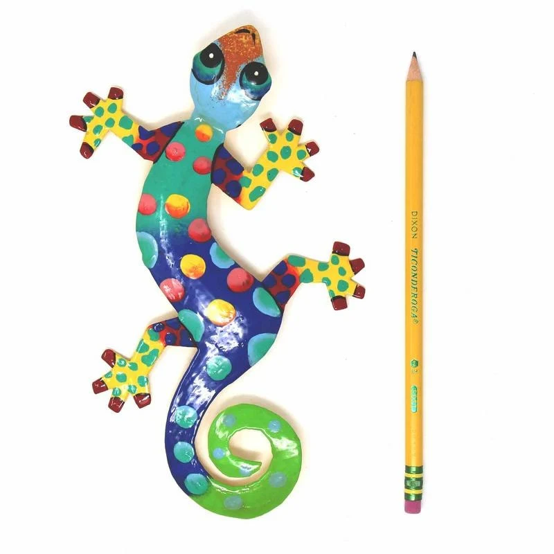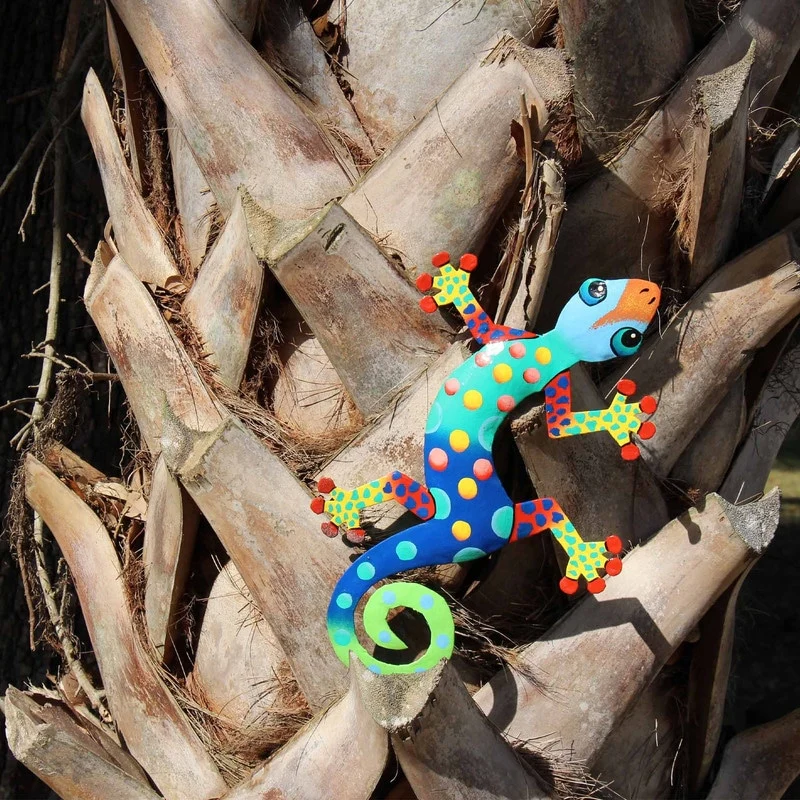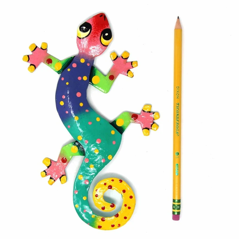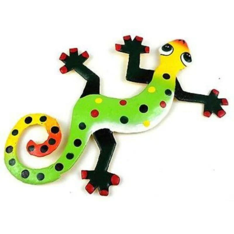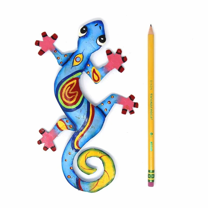 This colorful gecko is handmade in Haiti from recycled oil drums. Inspired by Haitian culture, this wall hanging will decorate your home with unique style. Suitable indoors or outdoors.