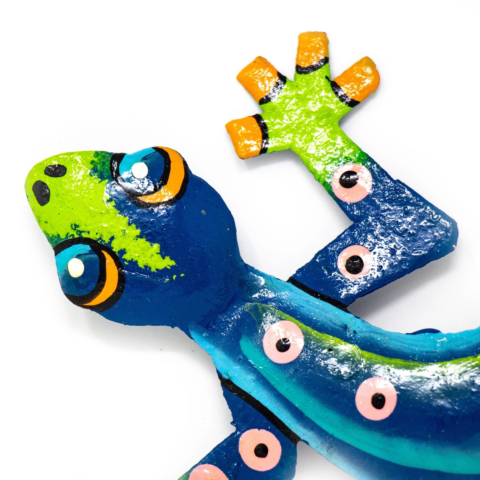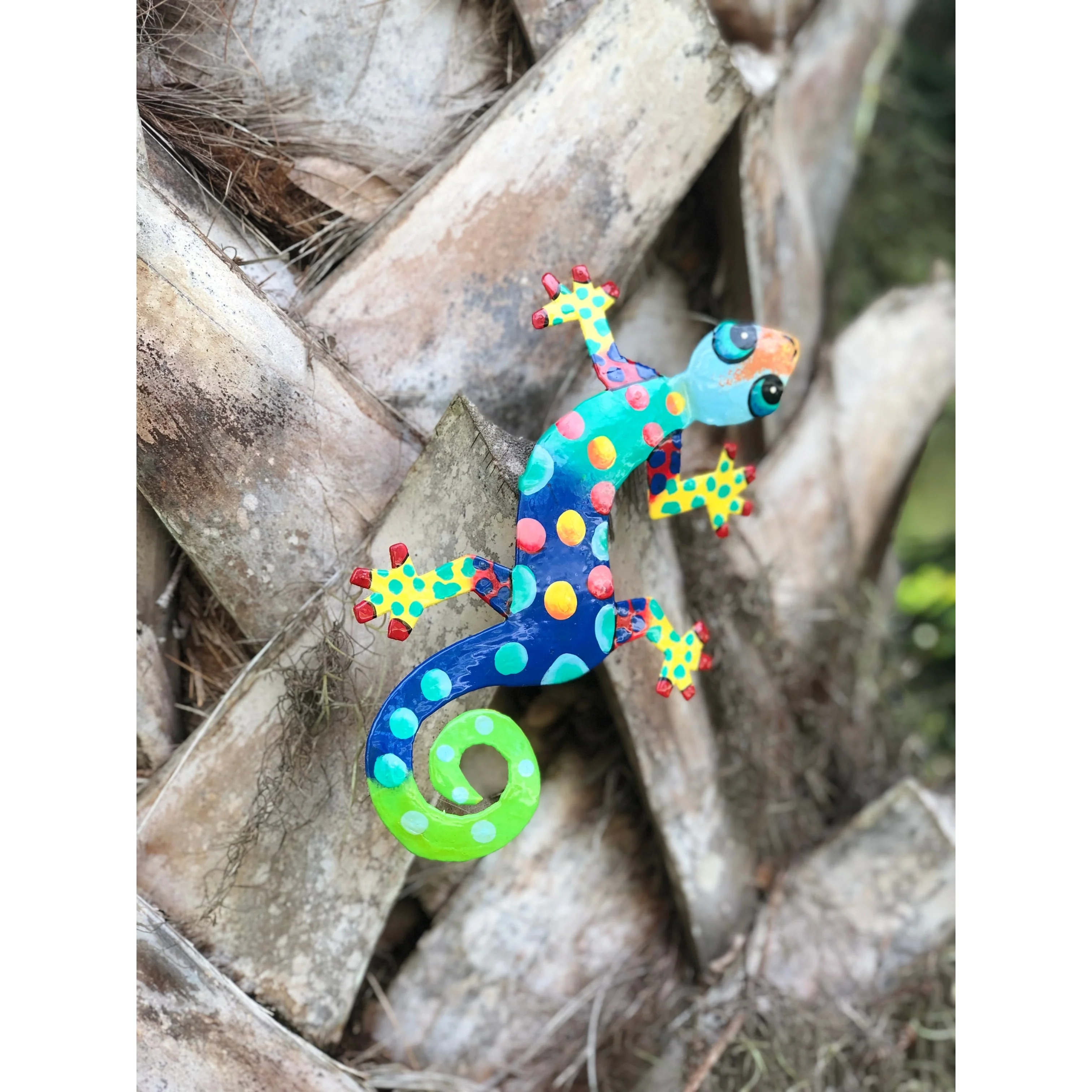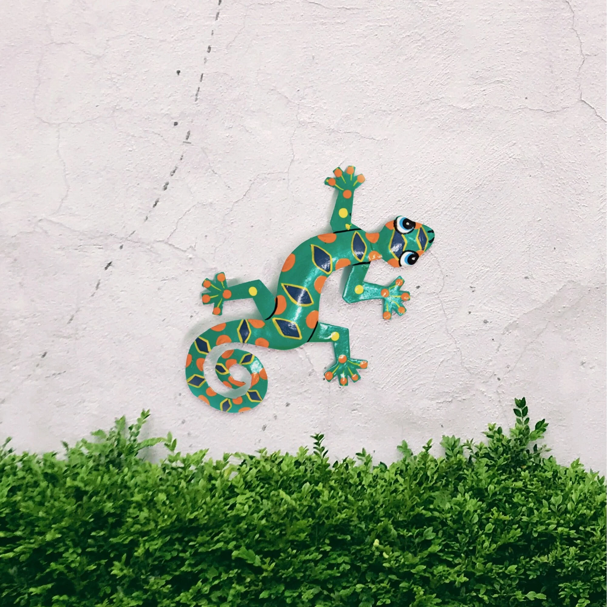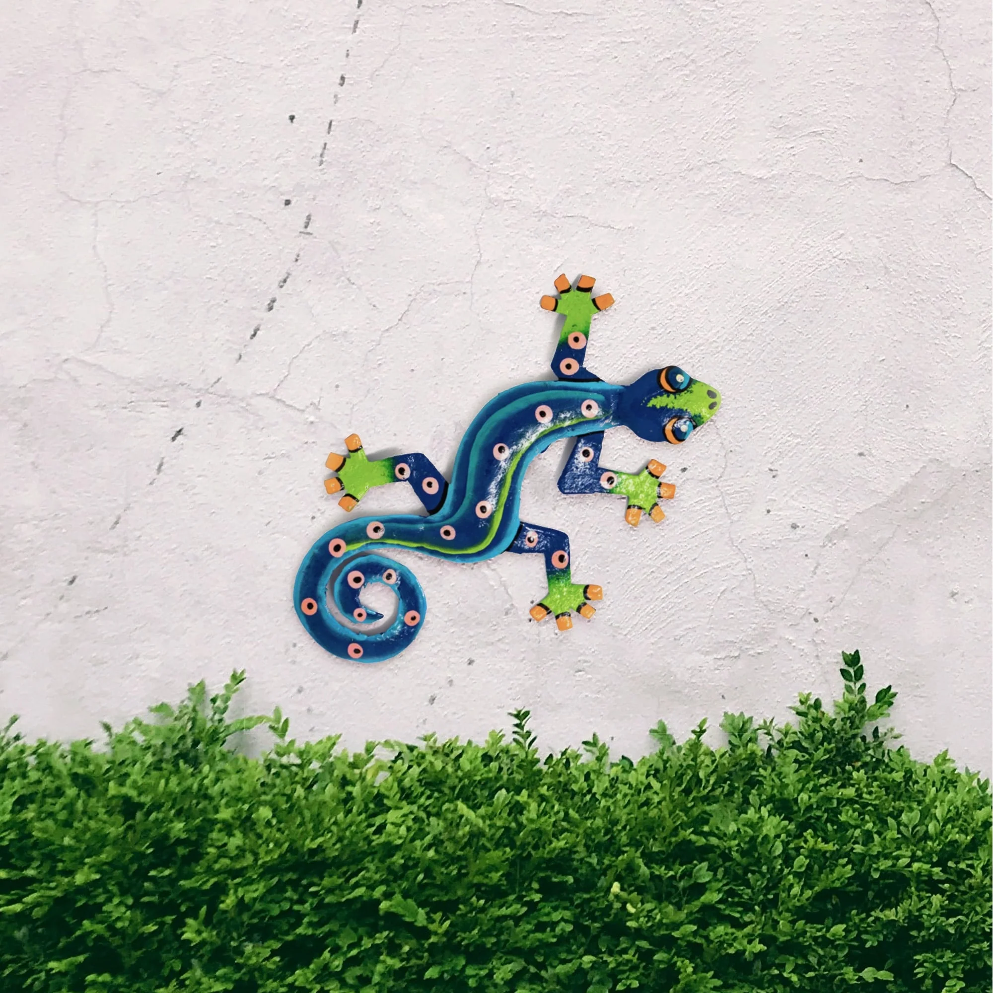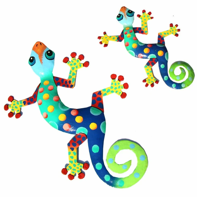 This colorful gecko is handmade in Haiti from recycled oil drums. Inspired by Haitian culture, this wall hanging will decorate your home with unique style. Suitable indoors or outdoors.