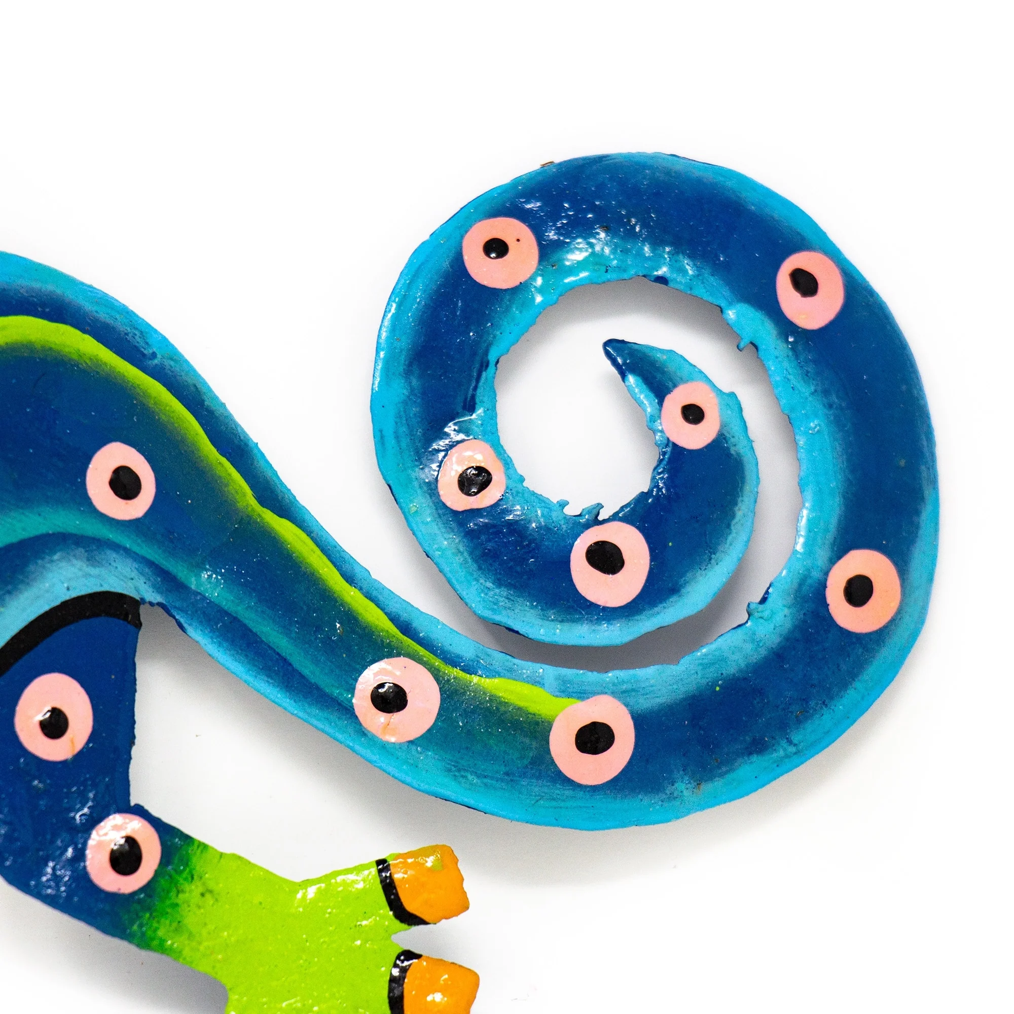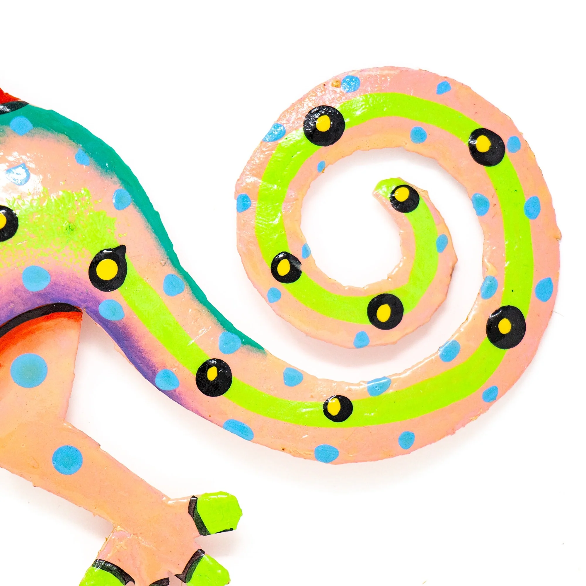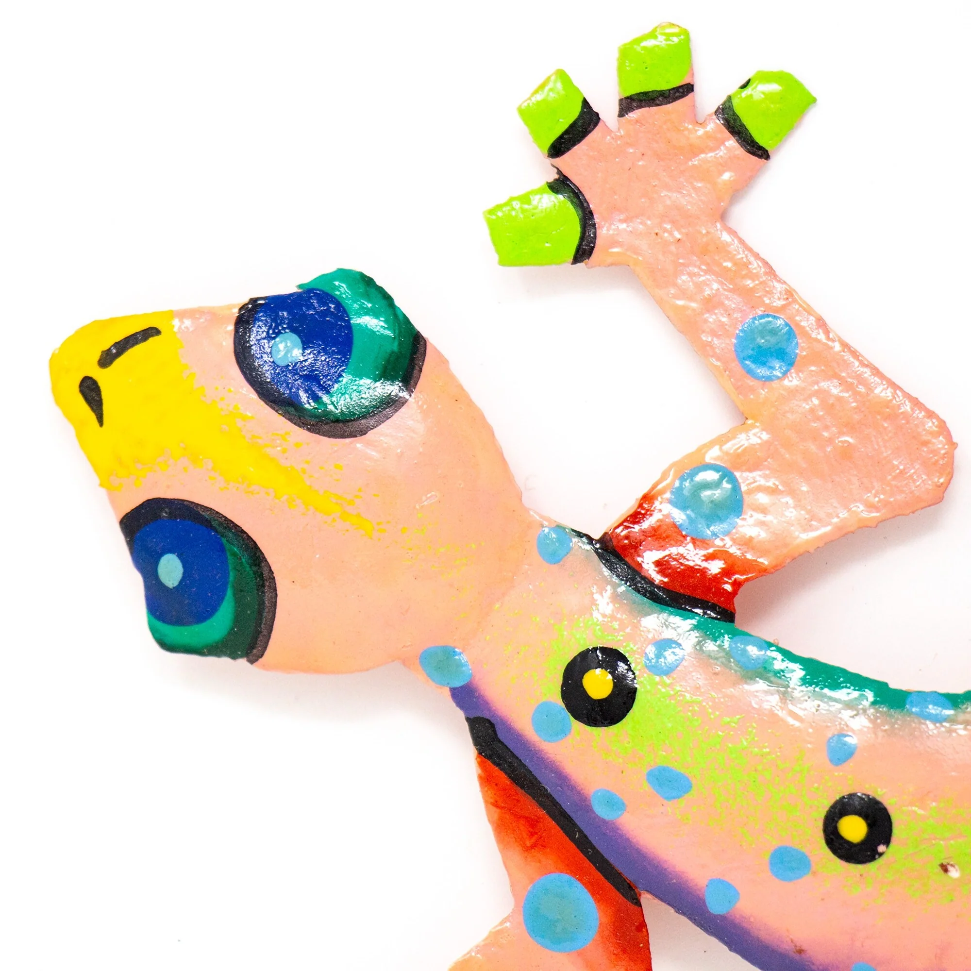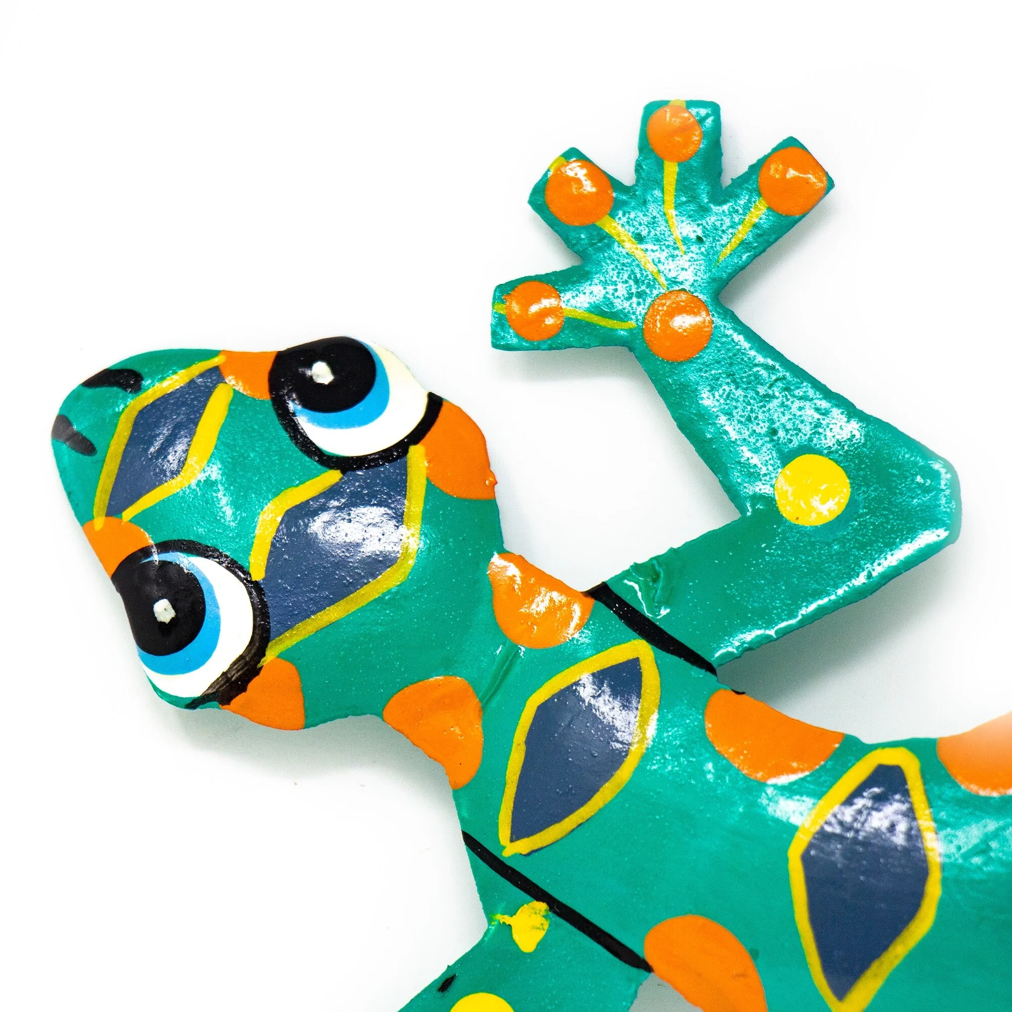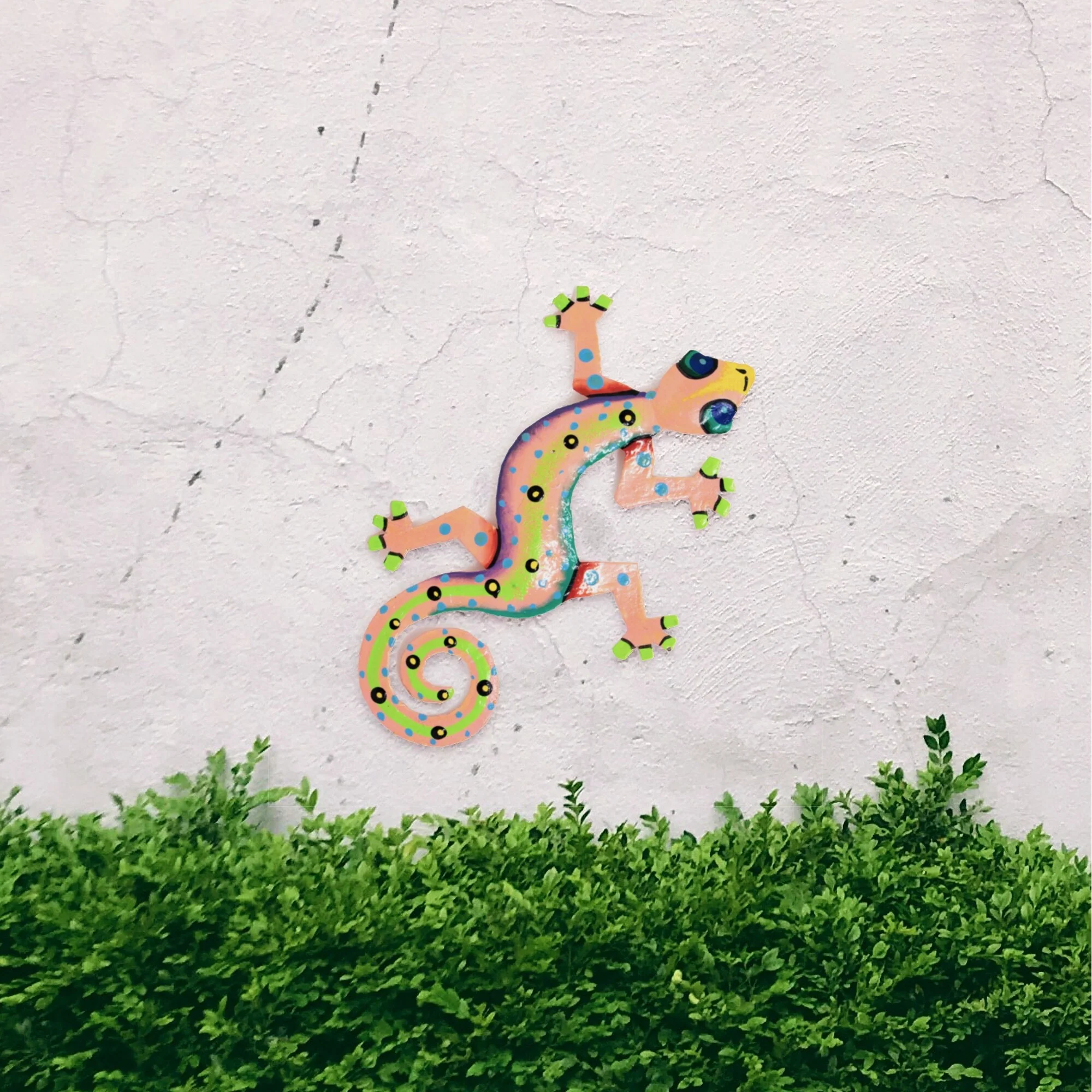 This colorful gecko is handmade in Haiti from recycled oil drums. Inspired by Haitian culture, this wall hanging will decorate your home with unique style. Suitable indoors or outdoors.