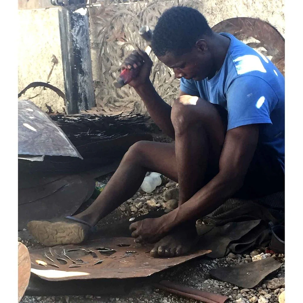 When you visit Croix des Bouquets, the area of town known for Haitian metal art in the capital of Port-Au-Prince, you are met with a cacophony of tink, tink, tink as ball peen hammers strike sheets of steel. The sheets are cut from steel drums colored by oil and other liquids the drums at one time held. The process of turning sheets of metal into beautiful wall art is all done by hand, from cutting holes that become edges of trees and leaves, to accenting each animal with a texture, to painting or lacquering the final design. The artists are proud of their work, often signing the pieces on the back side, leaving a raised, reversed signature on the front.