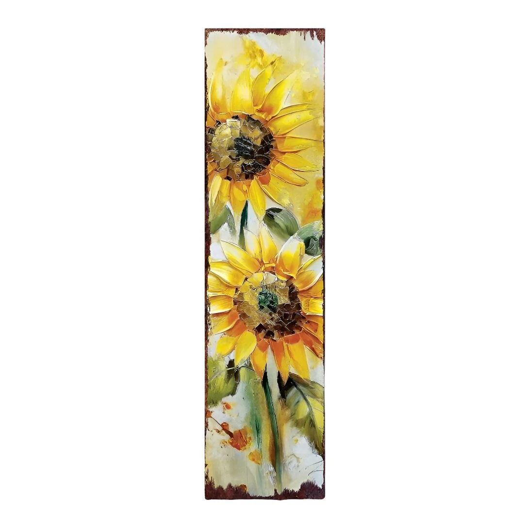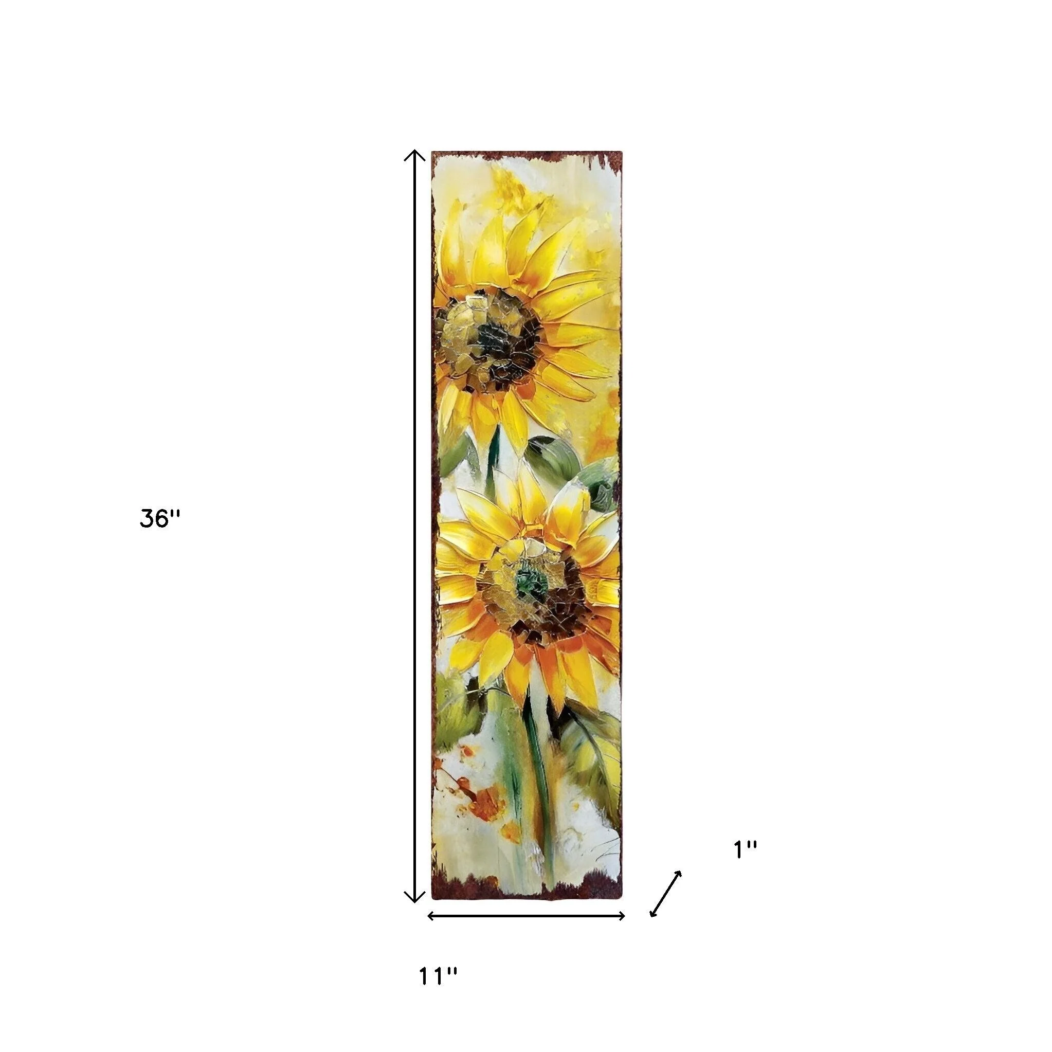 Elevate your outdoor space with the 36-inch brown green and yellow solid wood sunflowers porch sign. Crafted from durable solid wood, this charming porch sign embodies a traditional oil painting rustic style that adds warmth and character to any entrance with its beautiful colors it creates a vibrant yet earthy aesthetic, perfect for welcoming guests. Whether placed on a porch, garden, or patio, this accessory enhances your outdoor decor while celebrating the beauty of nature. Its sturdy construction ensures it withstands the elements, making it a lasting addition to your home. Bring a touch of whimsy and artistry to your living area with this stunning sunflower sign. 36-inch h x 11-inch w x 1-inch d.