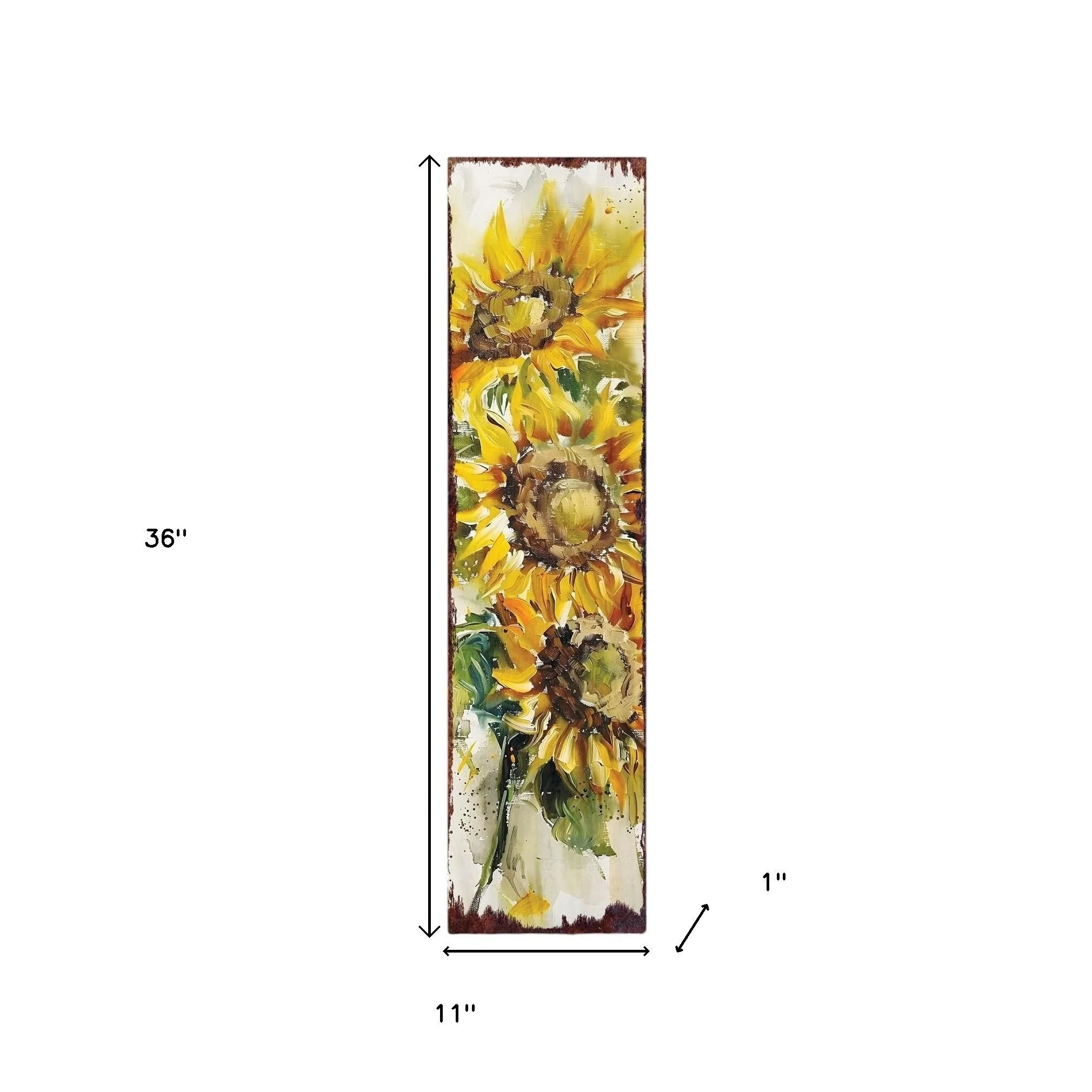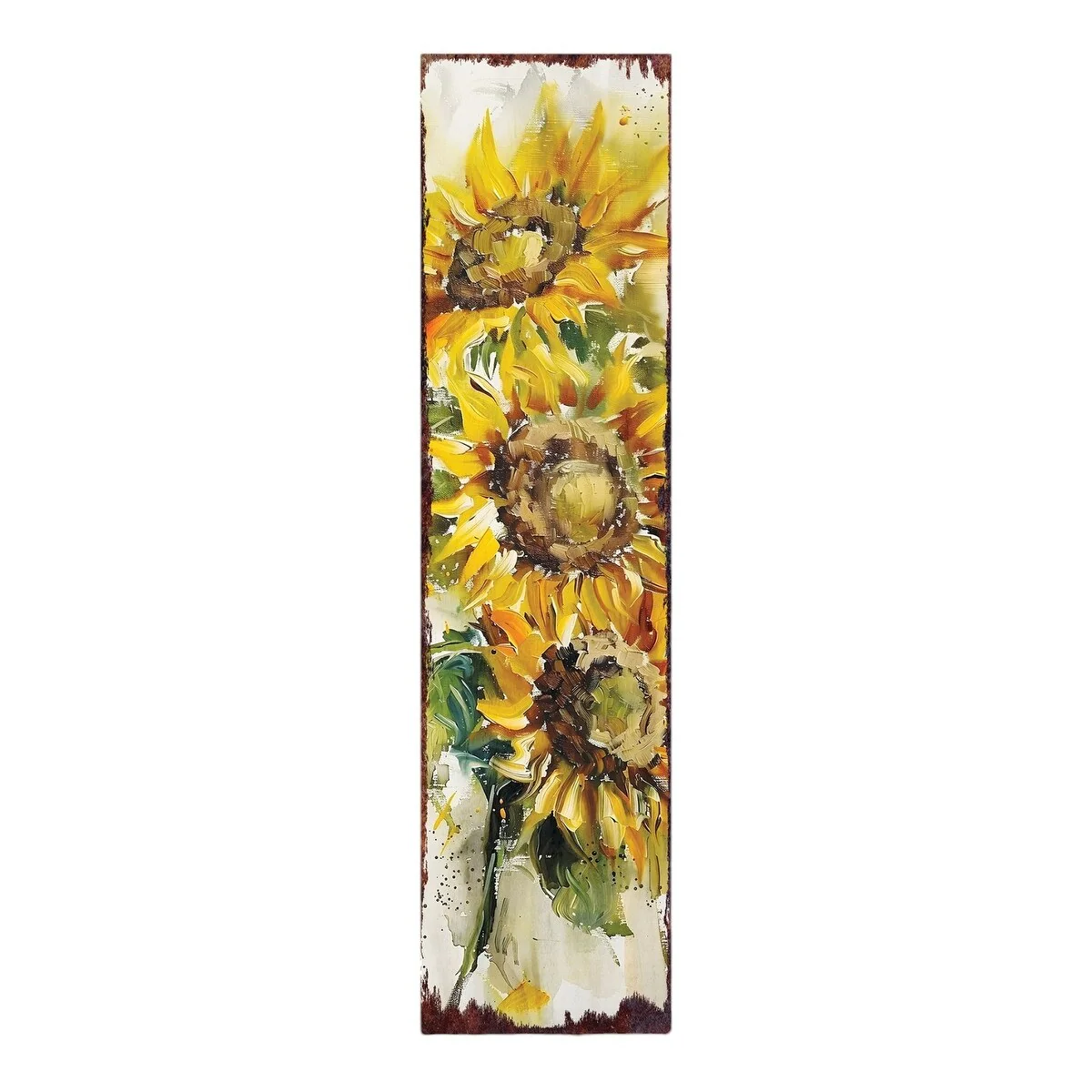 The 36-inch brown green and yellow solid wood sunflowers porch sign adds a charming touch to your outdoor space. Crafted from solid wood, this durable sign showcases a traditional style that enhances any porch or garden area. The warm brown, vibrant green, and cheerful yellow colors harmonize beautifully, inviting guests with their natural appeal. Perfect for welcoming visitors, this eye-catching accessory elevates your outdoor decor while reflecting a sense of warmth and hospitality. Its sturdy design ensures it can withstand the elements while maintaining its stunning appearance year after year. This porch sign is an ideal addition for anyone looking to brighten up their outdoor environment with a delightful decorative piece. 36-inch h x 11-inch w x 1-inch d.