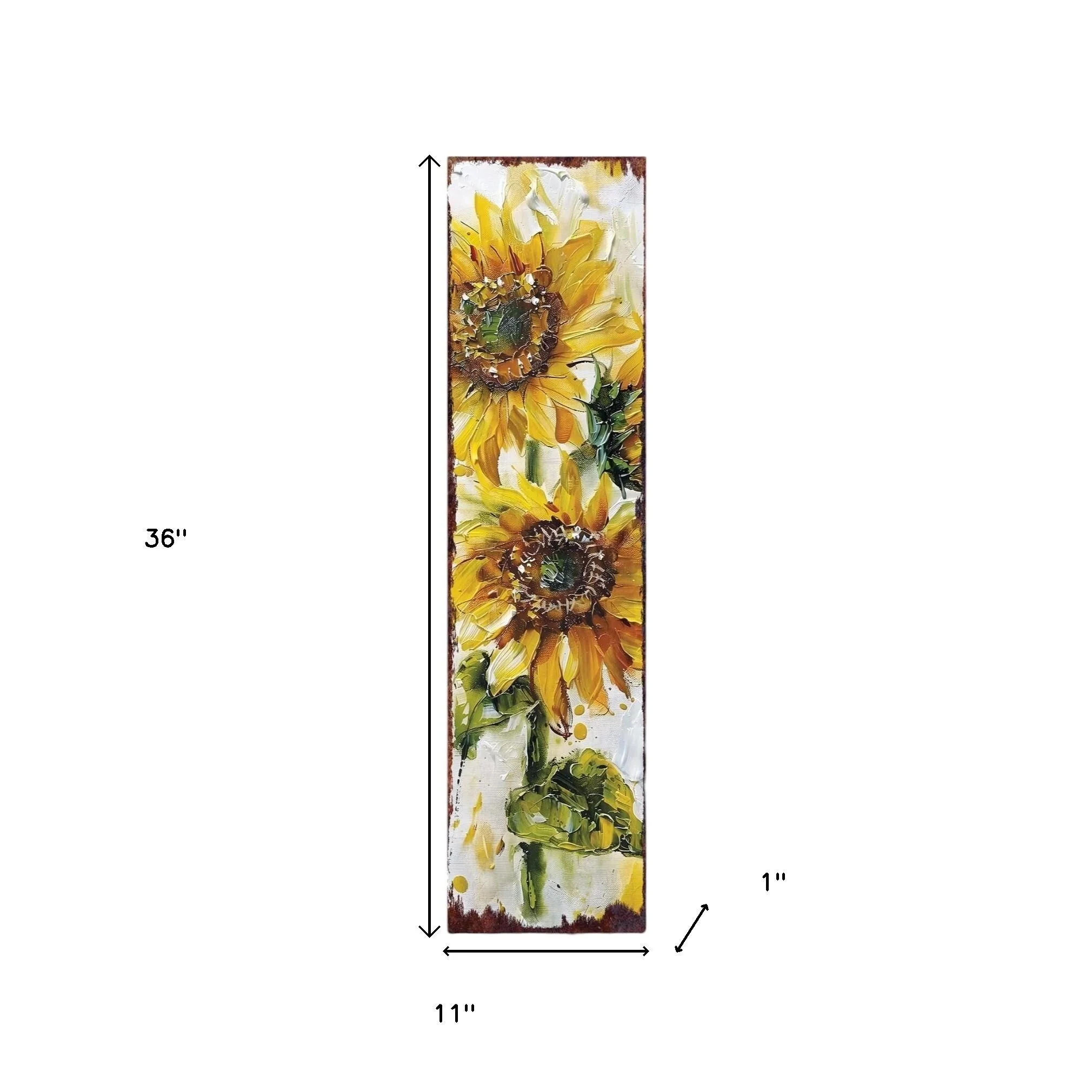 The 36-inch brown green and yellow solid wood sunflowers porch sign adds a charming touch to your outdoor space. Crafted from high-quality solid wood, this sign is designed to withstand the elements while enhancing your porch aesthetic. Its traditional style beautifully complements a variety of outdoor decors, creating a warm and inviting atmosphere. The vibrant colors of brown, green, and yellow bring life to your garden area, making it a delightful focal point for guests. Perfect for displaying on your porch or garden, this accessory will surely brighten your outdoor environment. Enhance your home’s curb appeal with this eye-catching and durable sign that showcases your love for nature in a stylish way. 36-inch h x 11-inch w x 1-inch d.