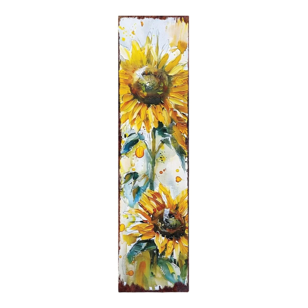 The 36-inch white and yellow solid wood sunflowers porch sign adds a cheerful touch to any outdoor space. Crafted from durable solid wood, this porch sign ensures longevity while enhancing your decor. Its traditional style brings a classic charm, perfect for welcoming guests. The vibrant white and yellow colors create an inviting atmosphere, ideal for brightening up porches and gardens. This accessory not only serves as decoration but also makes a great conversation starter during gatherings. Elevate your outdoor ambiance with this delightful piece that combines functionality and aesthetics. Whether placed near the entryway or in the backyard, it embodies a warm, sunny vibe that radiates positivity throughout your home. 36-inch h x 11-inch w x 1-inch d.
