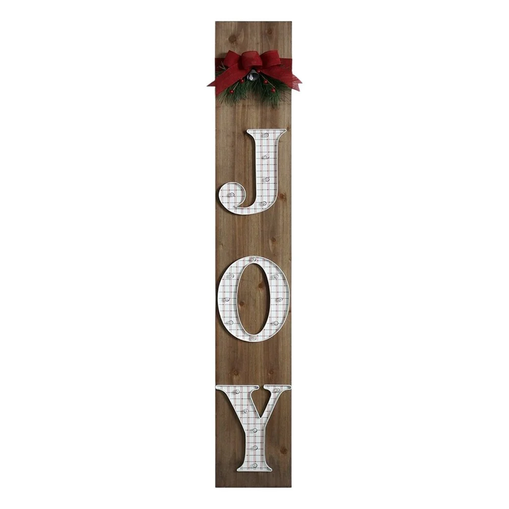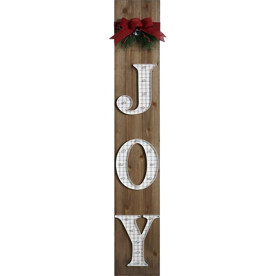 The 60-inch brown solid wood joy Christmas led lights porch sign adds a delightful touch to your outdoor decor. Crafted from solid wood, this traditional-style porch sign serves as a welcoming beacon during the festive season. It is illuminated with led lights, creating a warm and inviting atmosphere for holiday gatherings. Battery-powered for convenience, it allows for easy placement without the need for electrical outlets. Elevate your outdoor space this Christmas with this stunning and festive porch sign. 60-inch h x 1.5-inch w x 9.5-inch d.