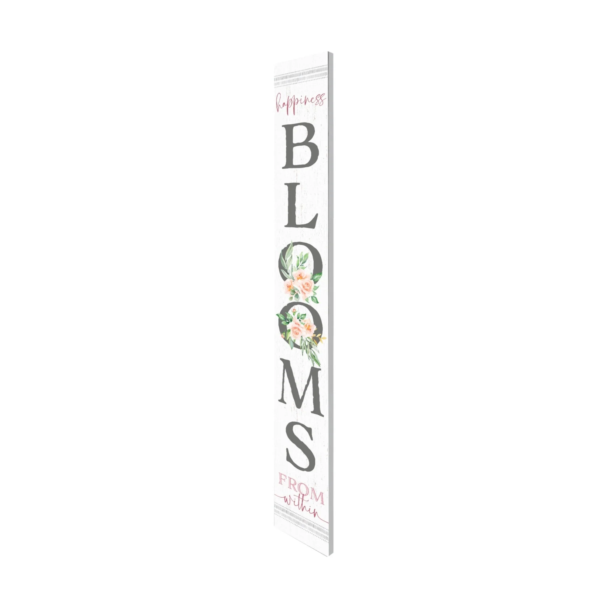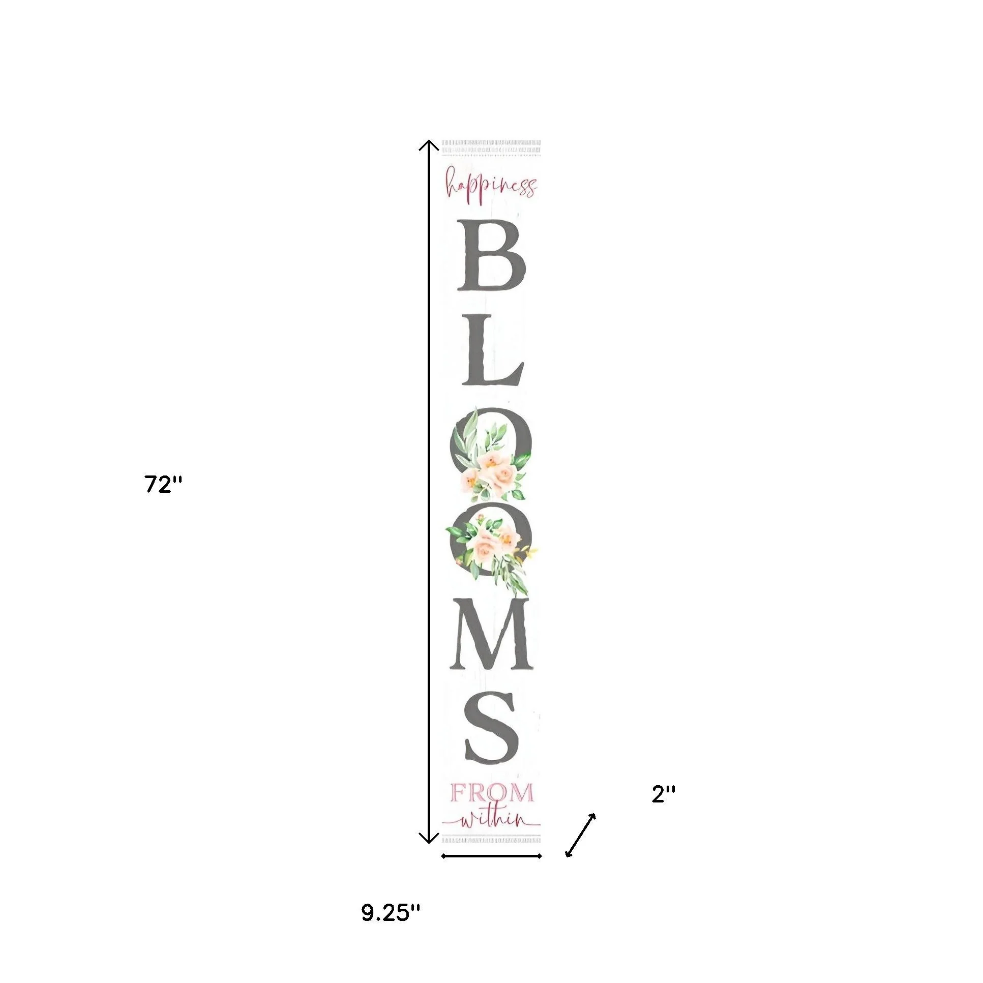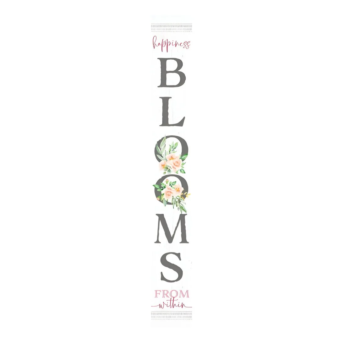 The 72-inch white solid wood blooms porch sign effortlessly enhances your outdoor accessory collection. Crafted from durable solid wood, this sign boasts a sturdy design perfect for outdoor environments. Its traditional style adds a charming touch to any porch or garden setting. The elegant white finish ensures it complements a variety of outdoor decor themes, making it an eye-catching addition. This versatile piece serves not only as a decorative element but also as a welcoming sign that captures the essence of your outdoor space. With its impressive height, the sign is sure to be a focal point, inviting guests to step into your beautifully curated garden ambiance. 72-inch h x 9.25-inch w x 2-inch d.
