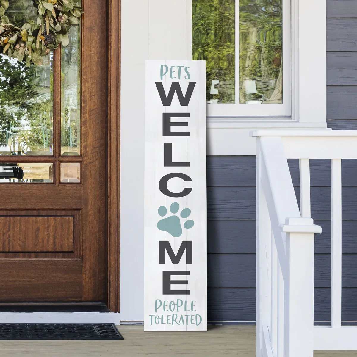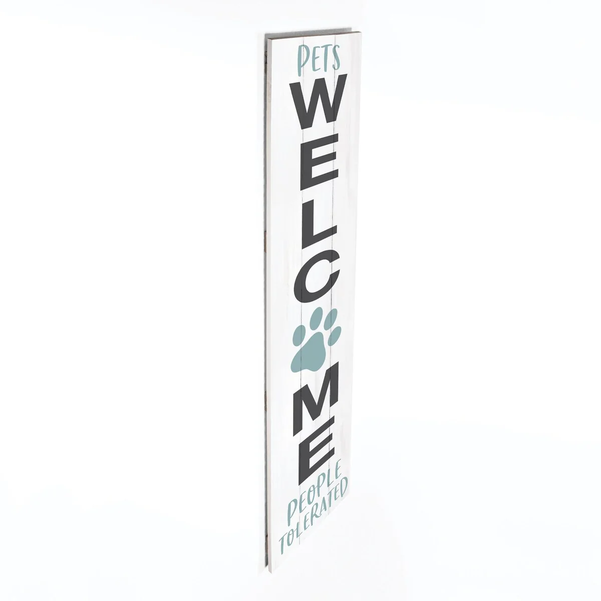 Crafted from kiln-dried pine, this Pets Pallet Sign P Graham Dunn features a hand-assembled design with an inspiring sentiment: 'Pets Welcome People Tolerated,' with the O being a paw print. Perfect for the porch, this sign comes with a sawtooth hanger so it can also be hung on the wall.