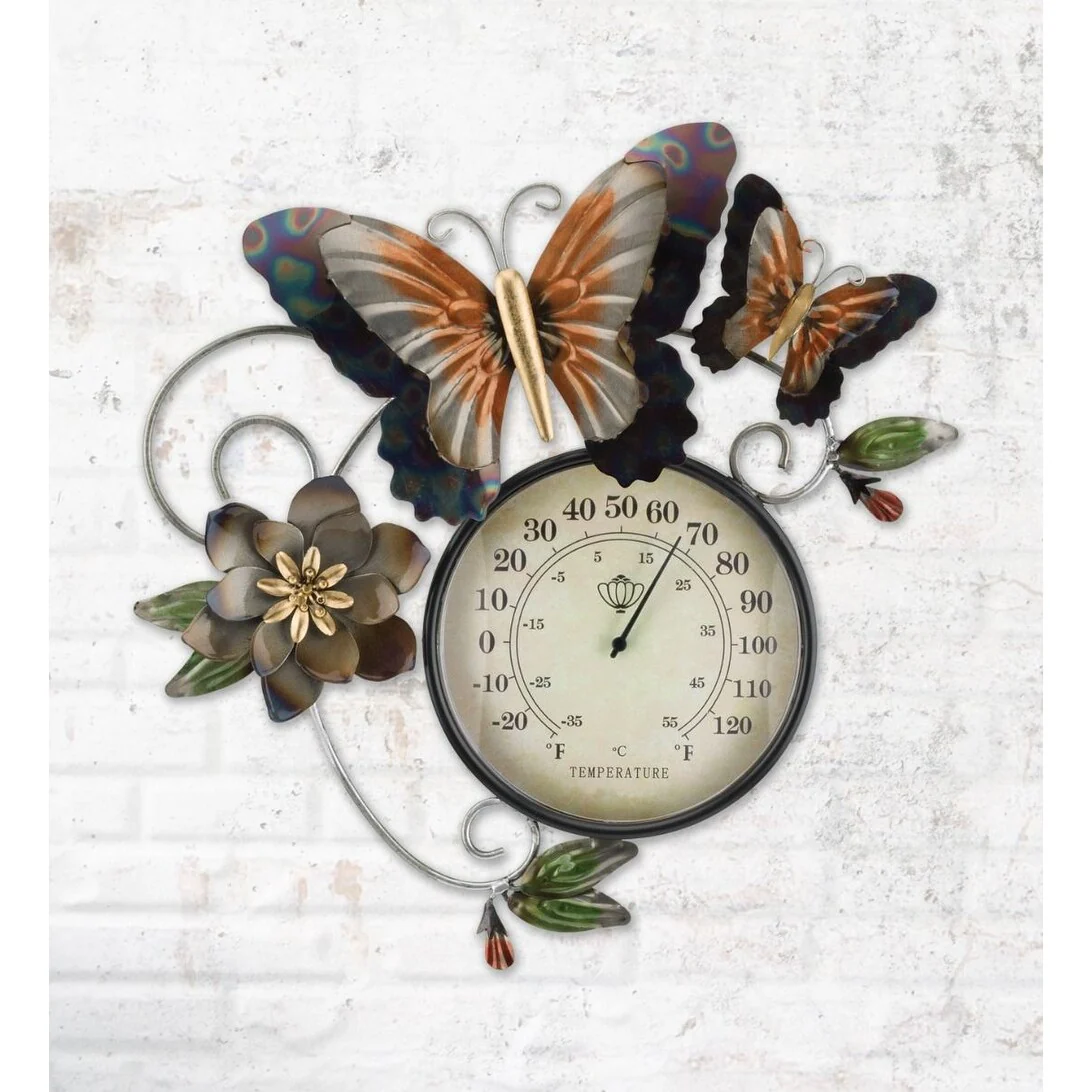 2-in-1 purpose, these beautiful wall décor pieces also serve as a thermometer for indoors or outdoors. The finish shines through with soft metallic paints in a garden scene of flowers and Butterflies.