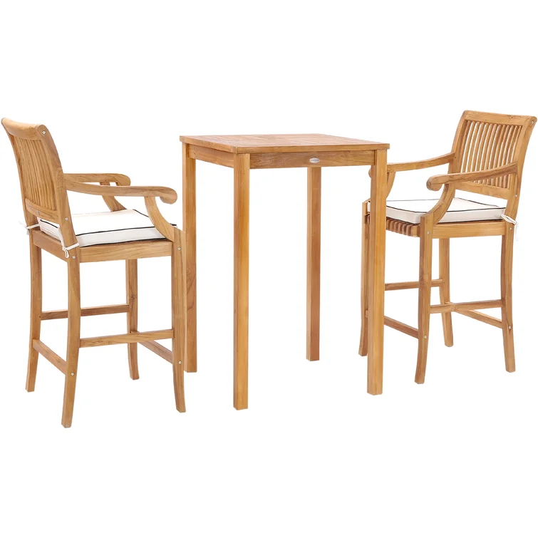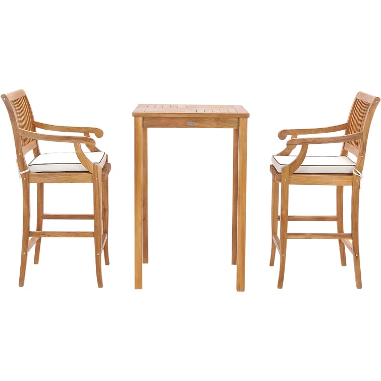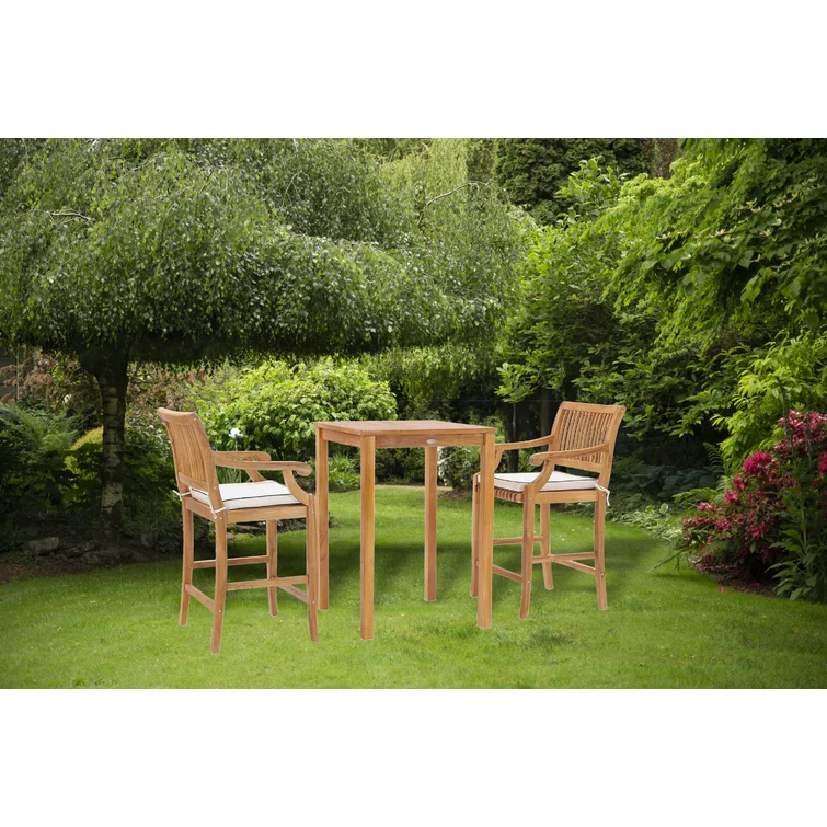 This 3 Piece Teak Wood Bistro Dining Set Includes a 27” Square Bar Table, 2 Barstools with Arms and CushionsThis 27 inch square bistro bar table is the perfect size an intimate dinner for two or having drinks with guests. The symmetrical lines and classic clean design of this table is pleasing to the eye and it makes the perfect place to create memories for years to come.The unique and rustic solid A-Grade Teak Wood Castle Barstools in this set are as sturdy as they are stylish. Sleek curves and a classic design combine to really make the character of these bar chairs stand out.The table and barstools are handmade from solid A-grade teakwood and stainless steel hardware so they can be used indoors or outdoors year round. The quality and craftsmanship that went into these pieces assure that they are made to stand the test of time. The slatted table top makes water drainage easy and the sturdy design is perfect for both commercial and residential use. This teak patio table and bar chair bistro set is perfect for patios, decks, balconies, poolside or any room inside your home.Features:Solid A-Grade Teak WoodIndoor And Outdoor UseEasy AssemblyHand rubbed wax finish304 Grade Stainless Steel HardwareThis Set Includes:1 Teak Wood Havana Outdoor Bar Table, 27 Inch (model AT23BAR)Dimensions are 43' (H) x 27' (W) x 27' (D)Easy assembly—just bolt on the 4 legs2 Teak Wood Castle Barstools with Arms (model HJ429)Measures 48H x 23W x 20D inchesSeat Height: 29 inchesSeat Back Height: 20 inchesEasy assembly2 Cushions for Castle Barstools/Chairs (model HJ420C)Made from durable outdoor fabricWeather resistantSecures to furniture with ties