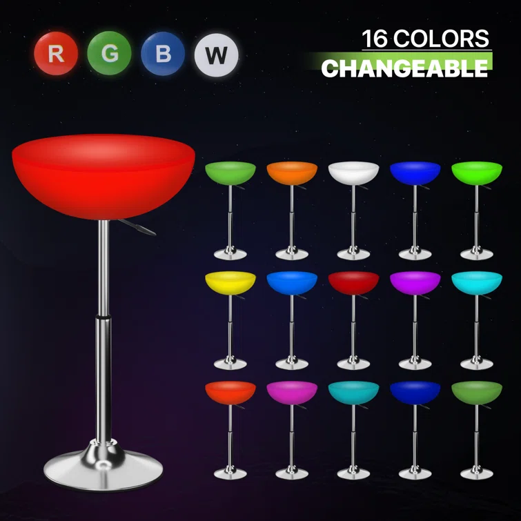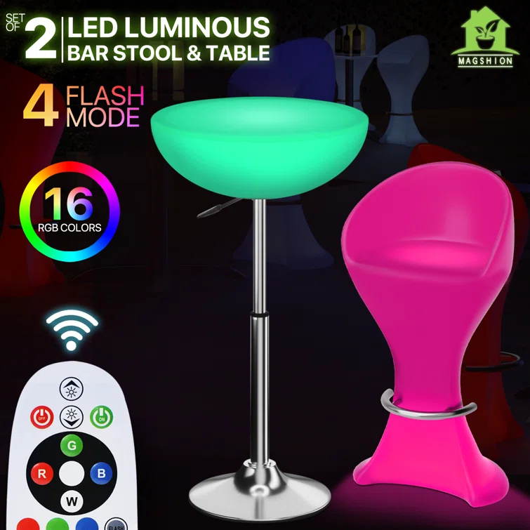 This LED bar table and stool set will light up any darkened area with a captivating glow. Perfect for serving drinks at your bar area, or sipping coffee too. Its contemporary design can add itself to most party decors. 16 kinds of bright colors, just press the button on the universal remote control to watch the color change and flash.