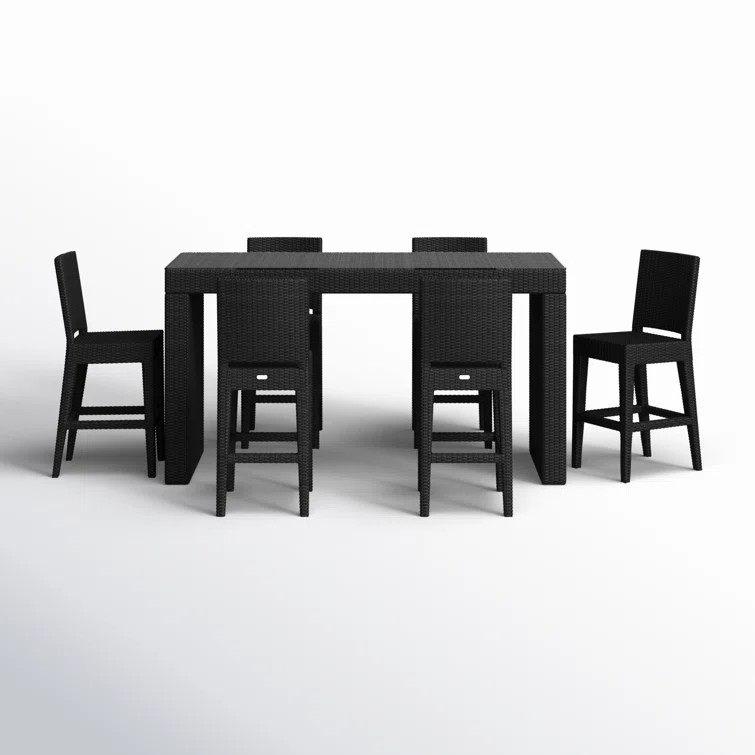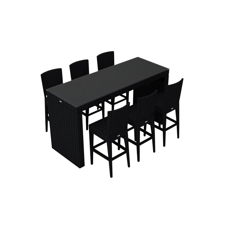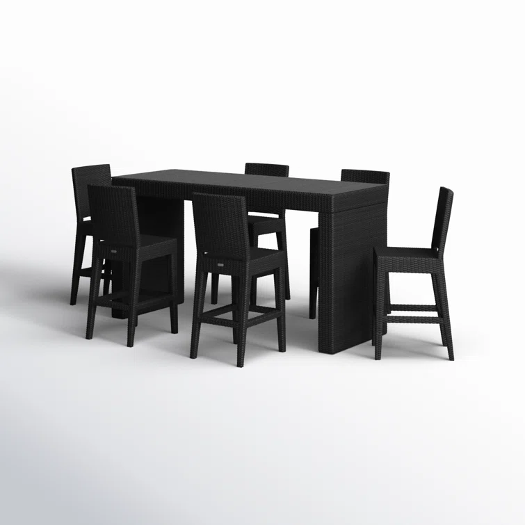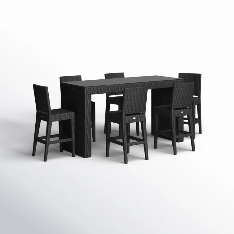 - This bar height dining set features a clean, simple build that will add modern style to your outdoor dining experience. Its fully-welded aluminum frames are treated with a powder-coated finish to ensure lasting performance across the seasons while the wicker is hand-woven from High-Density Polyethylene (HDPE) which is resistant to cracking. Made for lasting durability, color is infused into the HDPE wicker to prevent fading and finished in a beautifully textured Coffee Bean color to give it a natural look and feel. Optional cushions are made in the USA with quick-drying, Dacron and UV-treated, marine-grade PremoBond thread to create a supportive, yet comfortable seat that is meant to last throughout the seasons. All cushions are constructed from Sunbrella performance fabrics, which carry a 5-year fade warranty. This piece is offered in 9 popular Sunbrella fabric options which are fade resistant, easy to clean, and ready to ship within days of placing an order! The table is topped with extra strong tempered glass, a finishing touch that is ideal for frequent use.