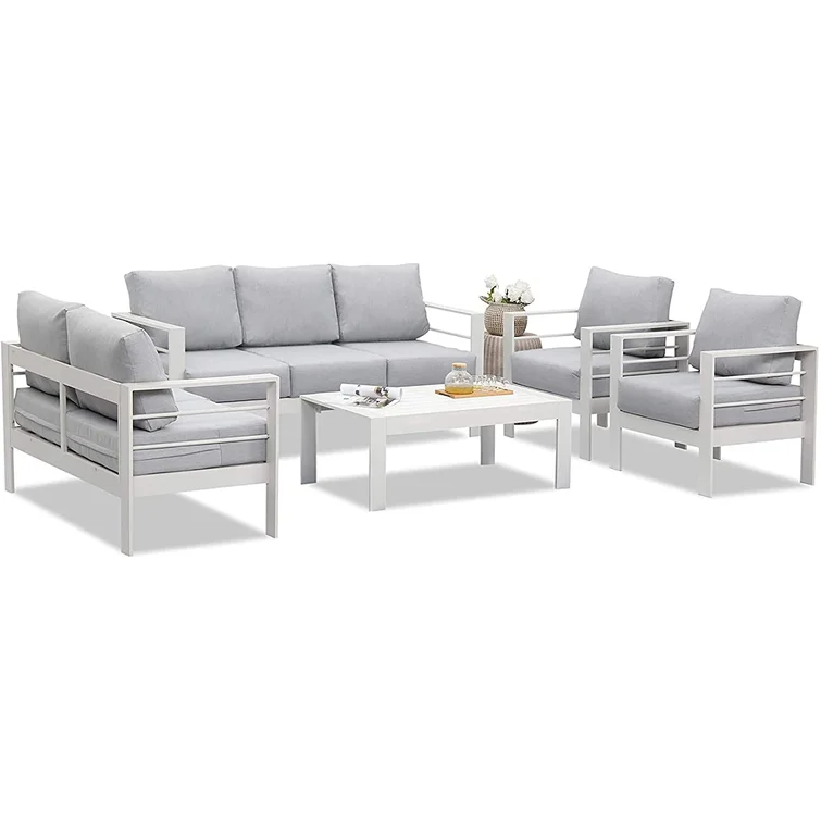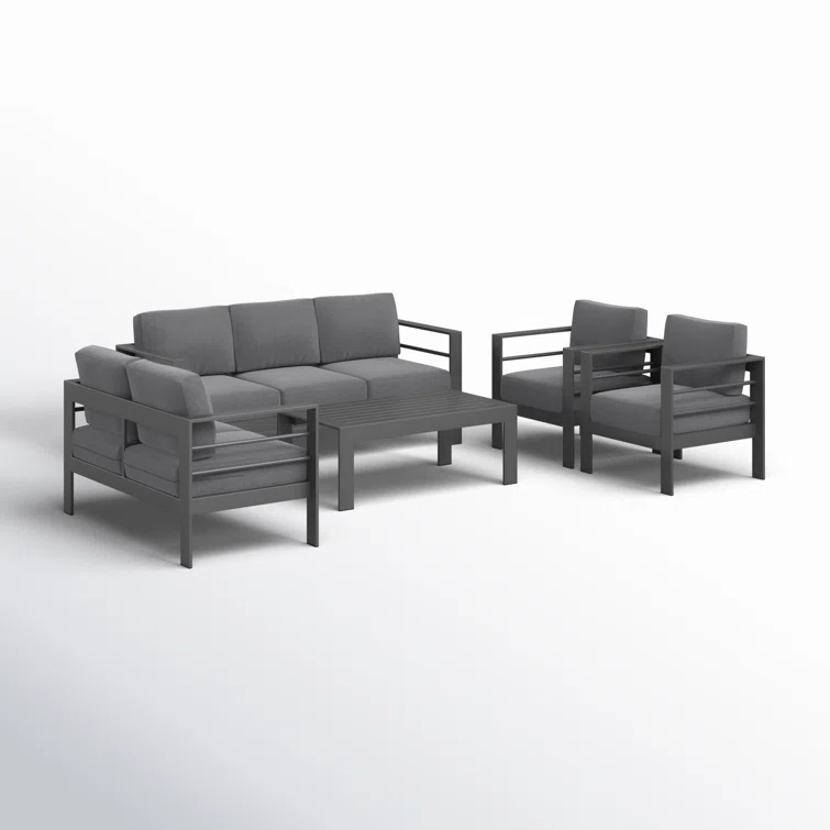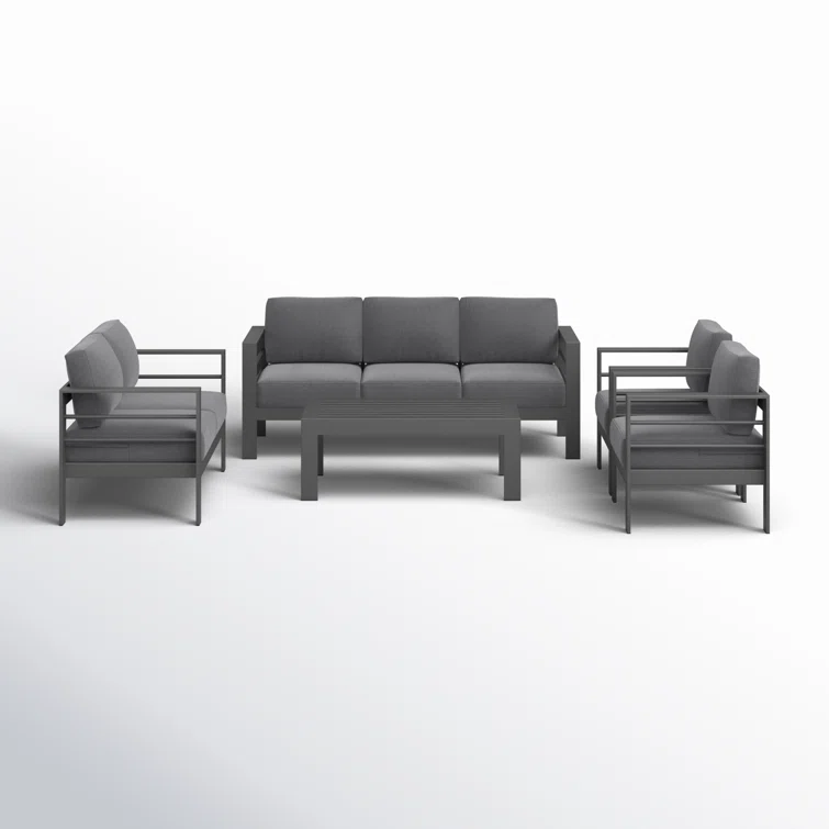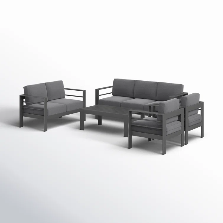 Gather your friends and family for a modern outdoor oasis with this 5-piece conversation set. Featuring a sofa, loveseat, two club chairs, and a table, it's the ideal spot for backyard barbecues or relaxing under the stars. The water- and UV-resistant cushions are made with Olefin upholstery and filled with foam for a comfortable seating experience. Plus, the machine-washable cushion covers make maintenance a breeze. Just remember to store them indoors or cover them when not in use to keep them looking fresh.