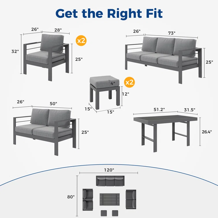 With a exquisite design, the outdoor furniture set comes with a high coffee table, a sofa, a loveseat two ottomans and two chairs that will make everyone feel right at home. With a sleek aluminum frame and thick cushions, this set not only offers a chic, minimalist look, but also incredible structure for a sturdy and comfortable seat. Water resistant cushion cover keeps outdoor furniture clean, dry, and ready to use. It allows you to entertain friends and family as much as you like, from intimate gatherings to cozy chats.
