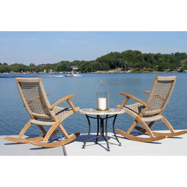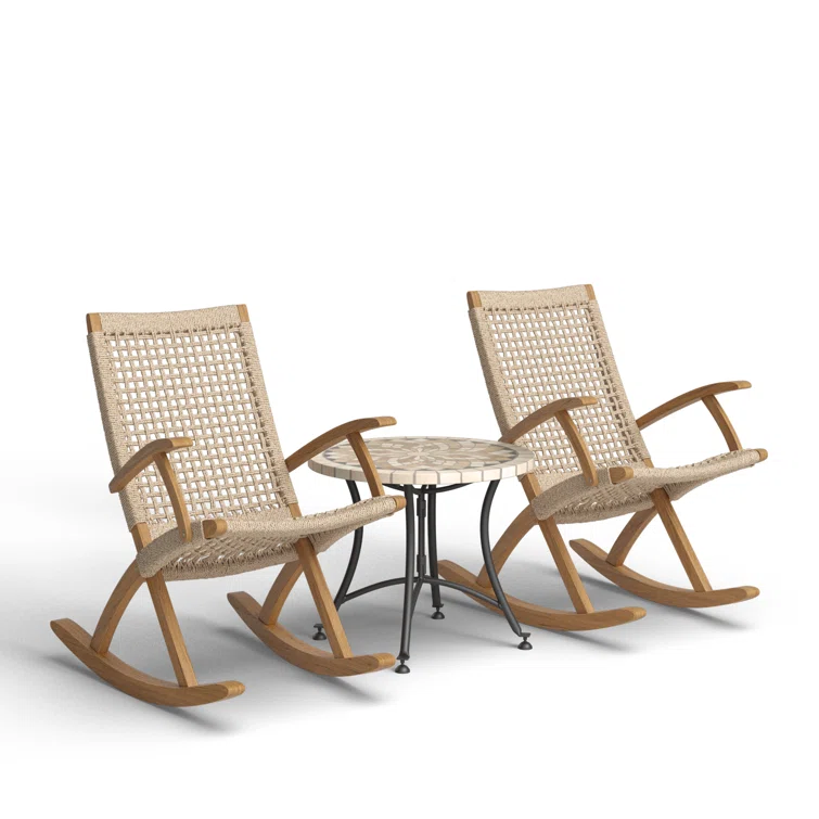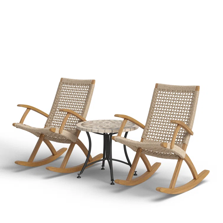 This 3pc. rocking chair set is a patio's dream. The modern rocking chair has been affectionately called the millennial's rocker. The chair features an updated style with all the classic comfort of your grandmother's porch rockers. The set is finished with a Spanish marble accent table.