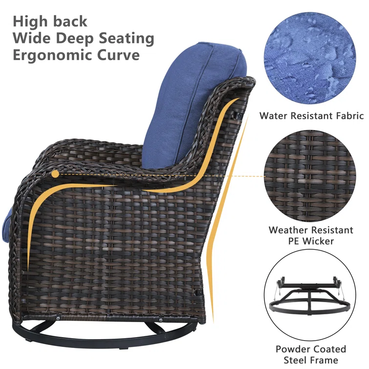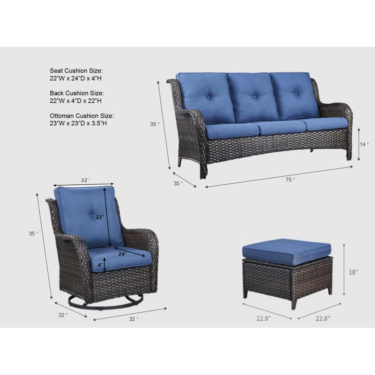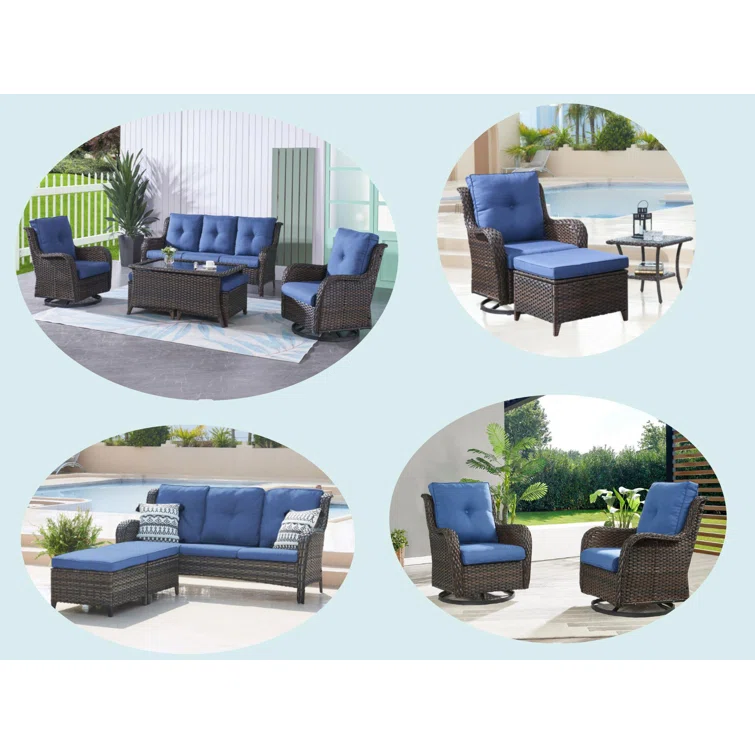 - The set includes 2 swivel rocker chairs, 2 box ottomans, and 1 piece of the 3-seat sofa, offers 5-7 comfortable seats.