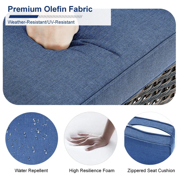 - 5- COZY CUSHIONS with Detachable Covers: Cushions are covered in olefin fabric. The Olefin fabric provides exceptional UV protection and water-repellant. The fabrics could dry very fast after sprinkling water. The cushions come with a smooth zipper, you can simply replace the cushion covers and give them a quick wash to make them look brand new;