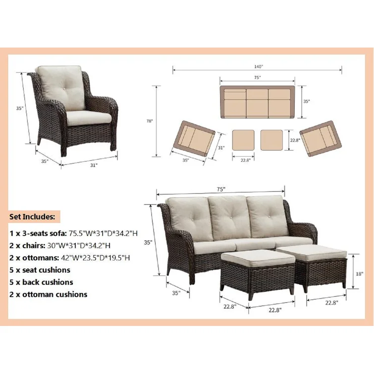 - Spacious and comfortable: Includes 1 big sofa, 2 boxed ottomans and 2 luxury chairs, each seat feathers deep seating and ergonomic high curved back and armrest, 100% Olefin button back cushion and rounded seat cushion