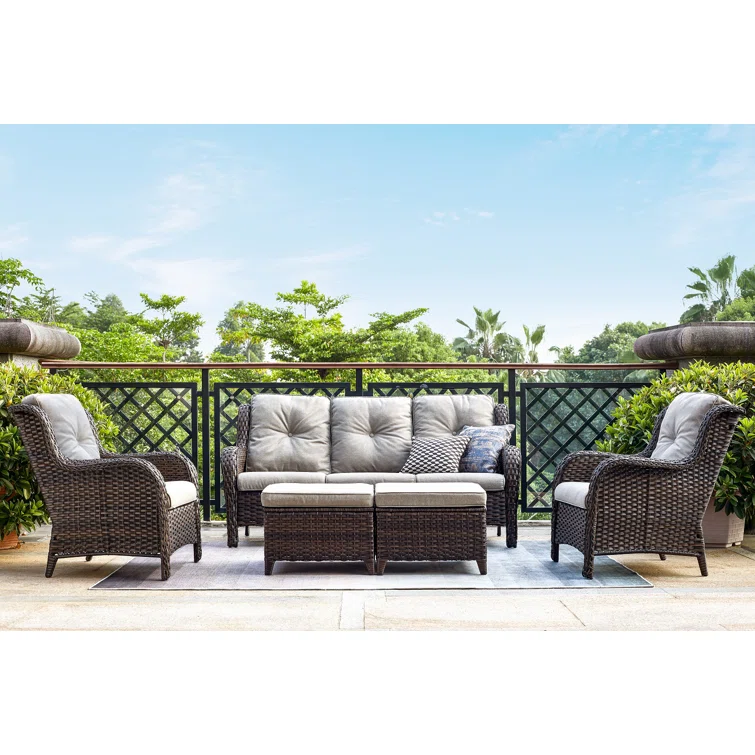Perfect for hosting friends or relaxing with family, this traditionally designed 5-piece wicker patio set creates a comfortable and luxurious space for you. The set feathers are enough size for multiple full-size adults. Cozy cushions and high curved armrests just give the right amount of support for the head and neck. Sturdy powder-coated steel frame wrapped with high-quality handwoven all-weather resin wicker. Wonderful for enjoying season-after-season on the patio, deck, sunroom and porch.