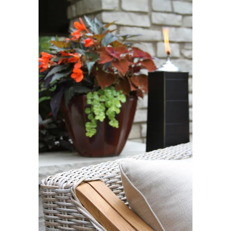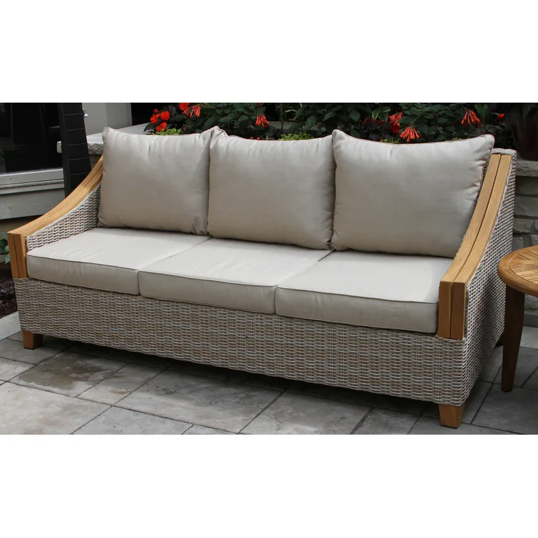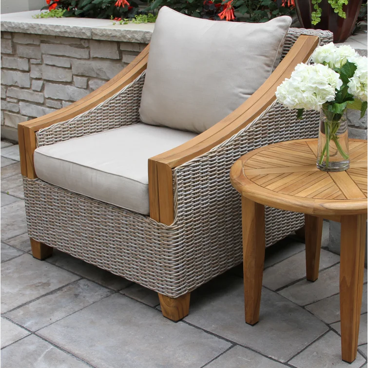 This 3-piece outdoor furniture set comes with a loveseat, armchair, and ottoman. It's just what you need to create an inviting seating area to entertain friends and family on your patio or deck. We love that each piece is made from solid teak wood, which is naturally UV-, rust-, and weather-resistant and safe to leave in an uncovered outdoor space. The seating pieces feature sloped, exposed teak arms, and are wrapped with gray resin wicker for a breezy and coastal look. The teak coffee table also has a lower shelf made from matching wicker. Plus, the loveseat and armchair each come with matching gray Sunbrella cushions that are also weather resistant.