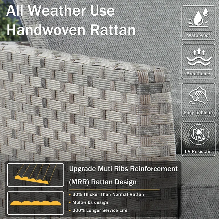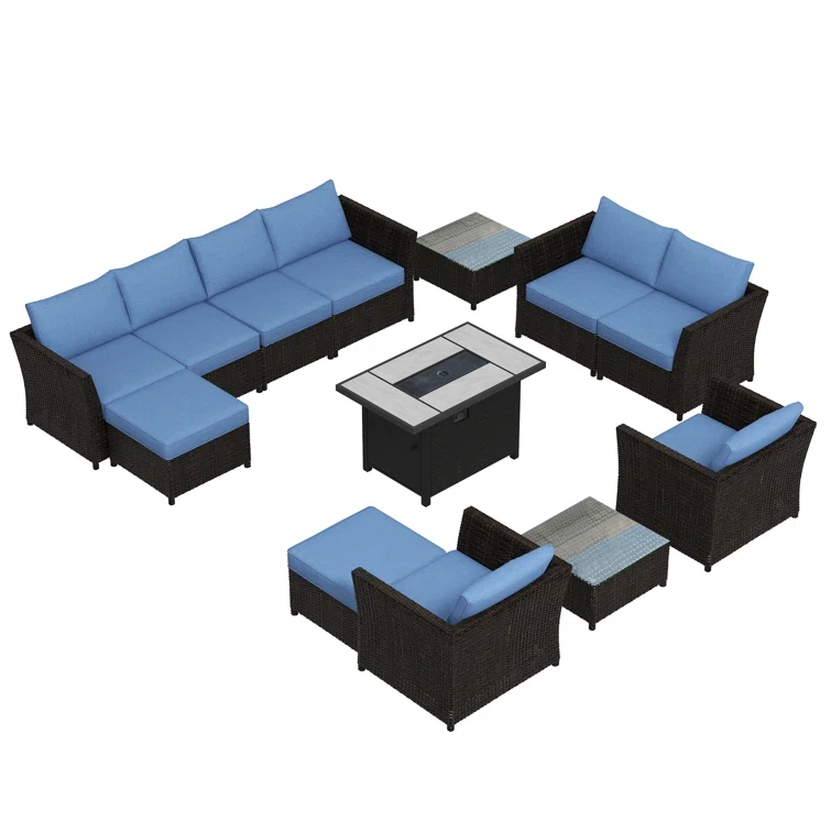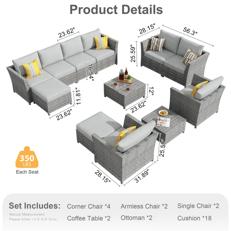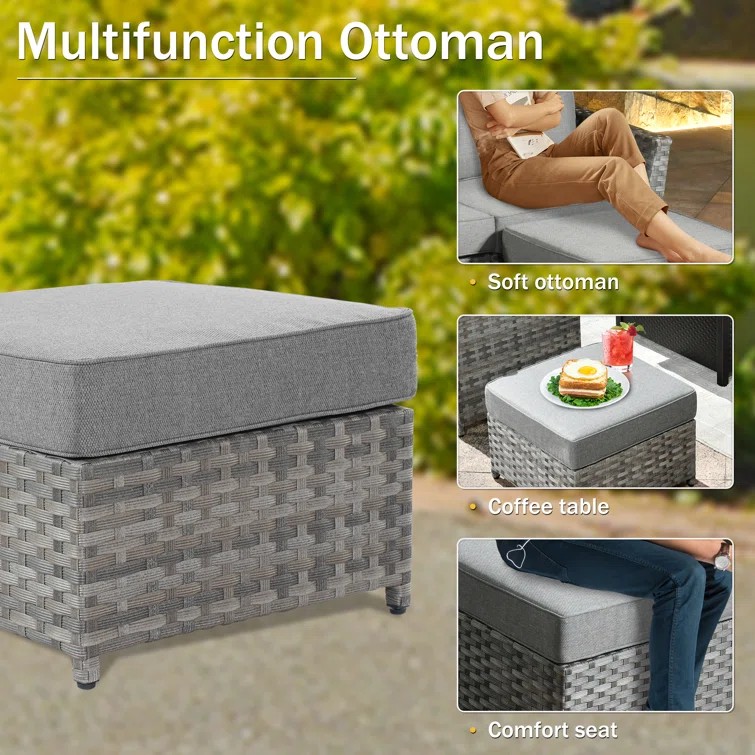 There is a place, filled with most of your memories and happiness, we call 'home'. We are committed to adding more warmth and comfort to your home. We designed this no-assembly 12-piece patio dialogue suite to create an inviting outdoor seating area for up to 10 people. High-density cane, easy-to-clean cushion will make you love.The whole set consists of 4 corner sofas and 2 armless sofas, 2 single chairs, and 2 OTTOMAN. Individual seating allows you to combine as you wish, suitable for any patio, deck, or poolside. The optional stove can be turned into a table at any time so that your coffee drinks no longer have nowhere to put,