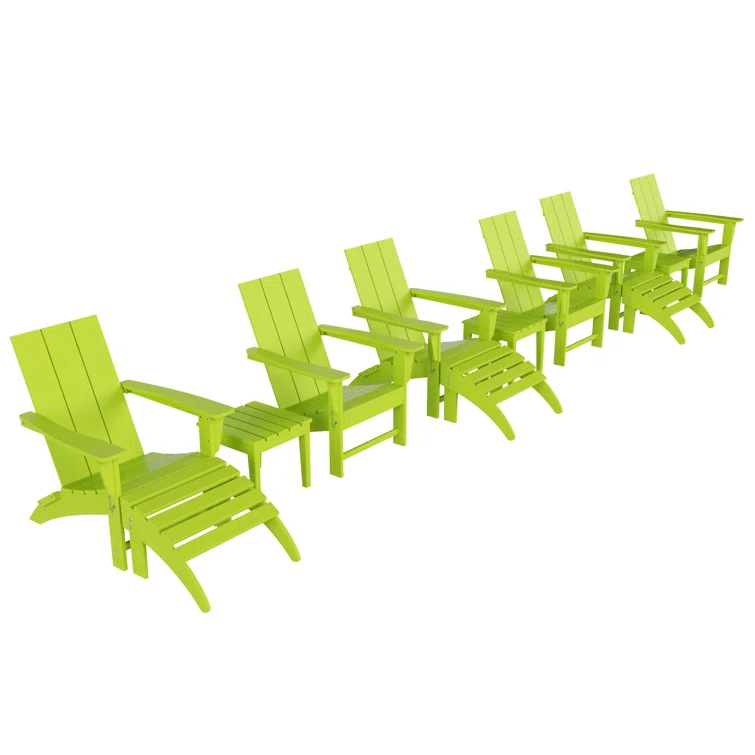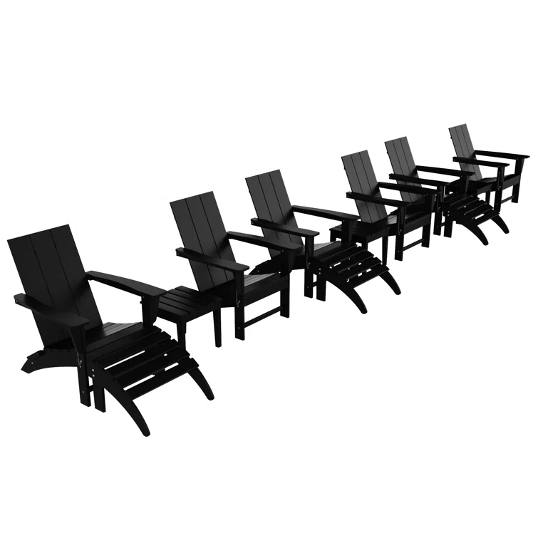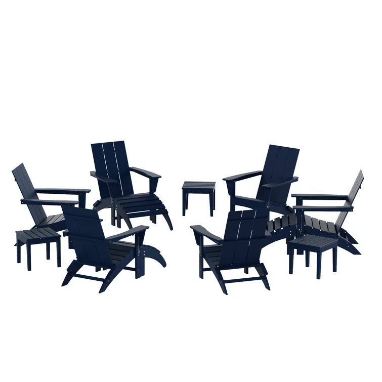- Set includes: Six (6) folding adirondack chairs, three (3) ottomans, three (3) round side tables