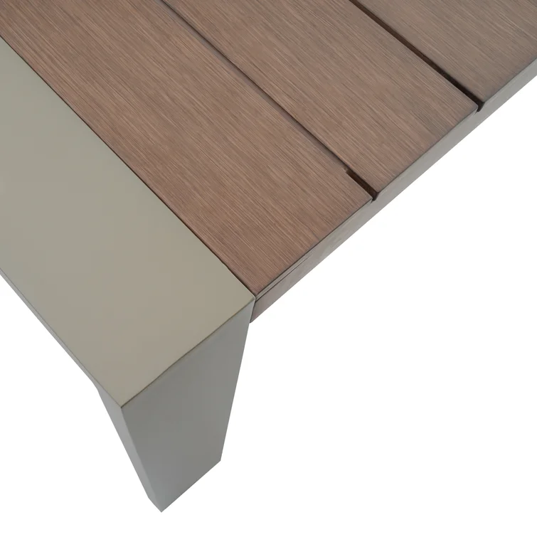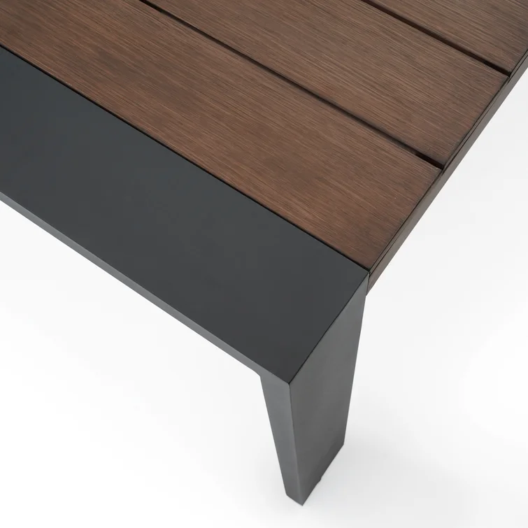 This 9-piece outdoor dining set gives you a spot to enjoy family gatherings and casual dinners alfresco. It includes a dining table and eight armchairs, each piece crafted from powder-coated aluminum with a dynamic finish of your choice. Clean lines and straight edges lend a bold modern vibe to your space. The rectangular table top is made from wood and consists of multiple planks for a classic look. There's also an opening in the center for an umbrella (sold separately). The seats and back are woven using wicker rattan, and the foam-filled Sunbrella® seat cushions stay attached using hook-and-loop fasteners.