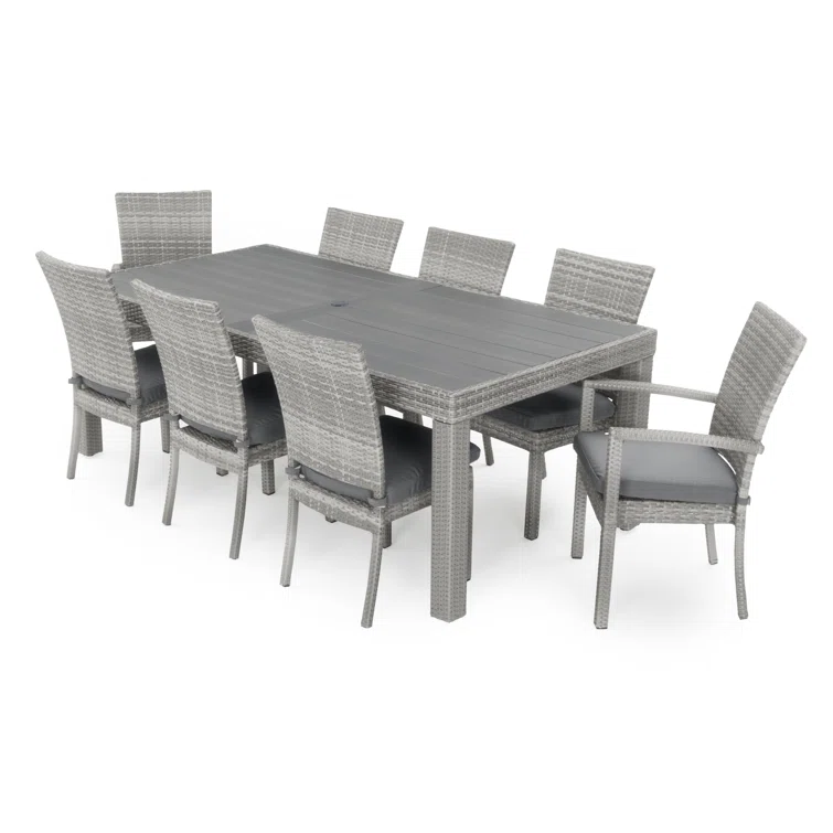 This 8-person dining set is great for enjoying alfresco entertaining for large families or big groups of friends. A breezy take on farmhouse design, this set includes a dining table and eight chairs. Each piece is made from aluminum with an engineered wood outer frame and is wrapped in high-density resin wicker. The table features a center umbrella hole, so you have the option of adding extra shade for sunny days. Each chair is topped with a detachable weather-resistant cushion, with removable covers to keep upkeep easy and breezy. Plus, the chairs are stackable for convenient storage.